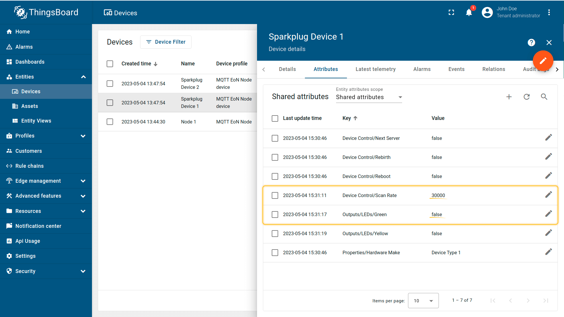 返回设备页面并选择Sparkplug Device 1。 在共享属性选项卡中,您将看到两个新属性:”Outputs/LEDs/Green“值为”true“,”Outputs/LEDs/Yellow“值为”false“。 这些为存储为属性的指标,我们可修改并将其值发送至设备。