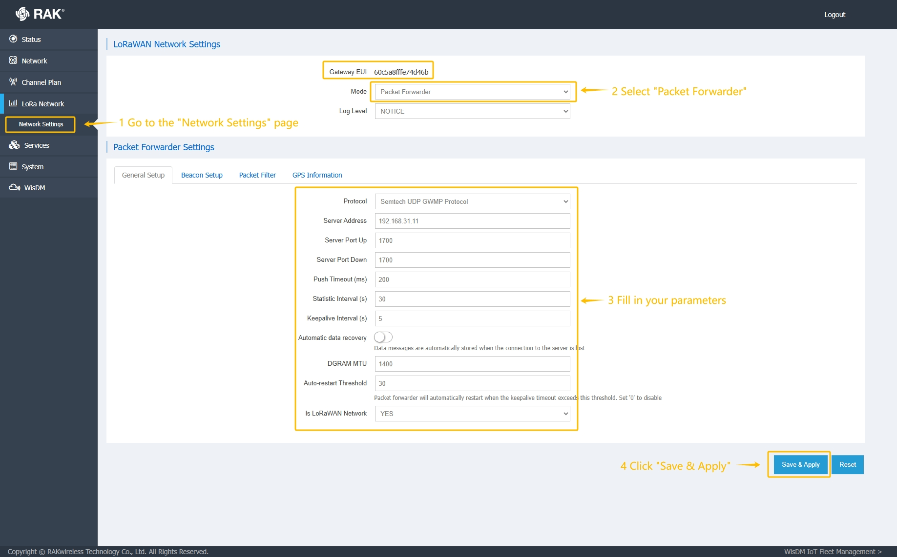打开网关控制面板。进入”网络设置“页面并将模式设置为”数据包转发器“。在”服务器地址“字段中输入服务器地址(例如,在我们的例子中为192.168.31.11),然后点击”保存&应用“按钮。