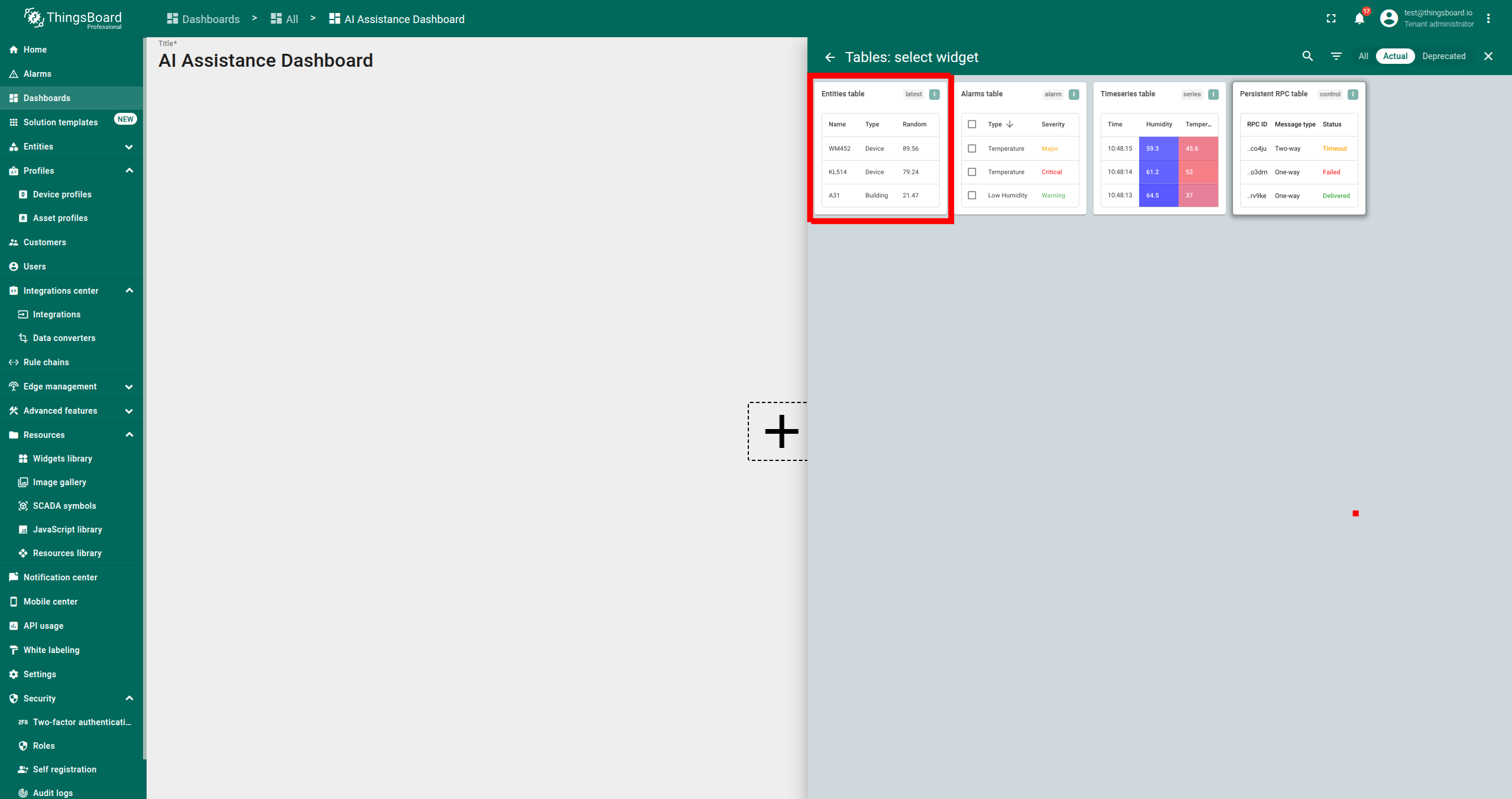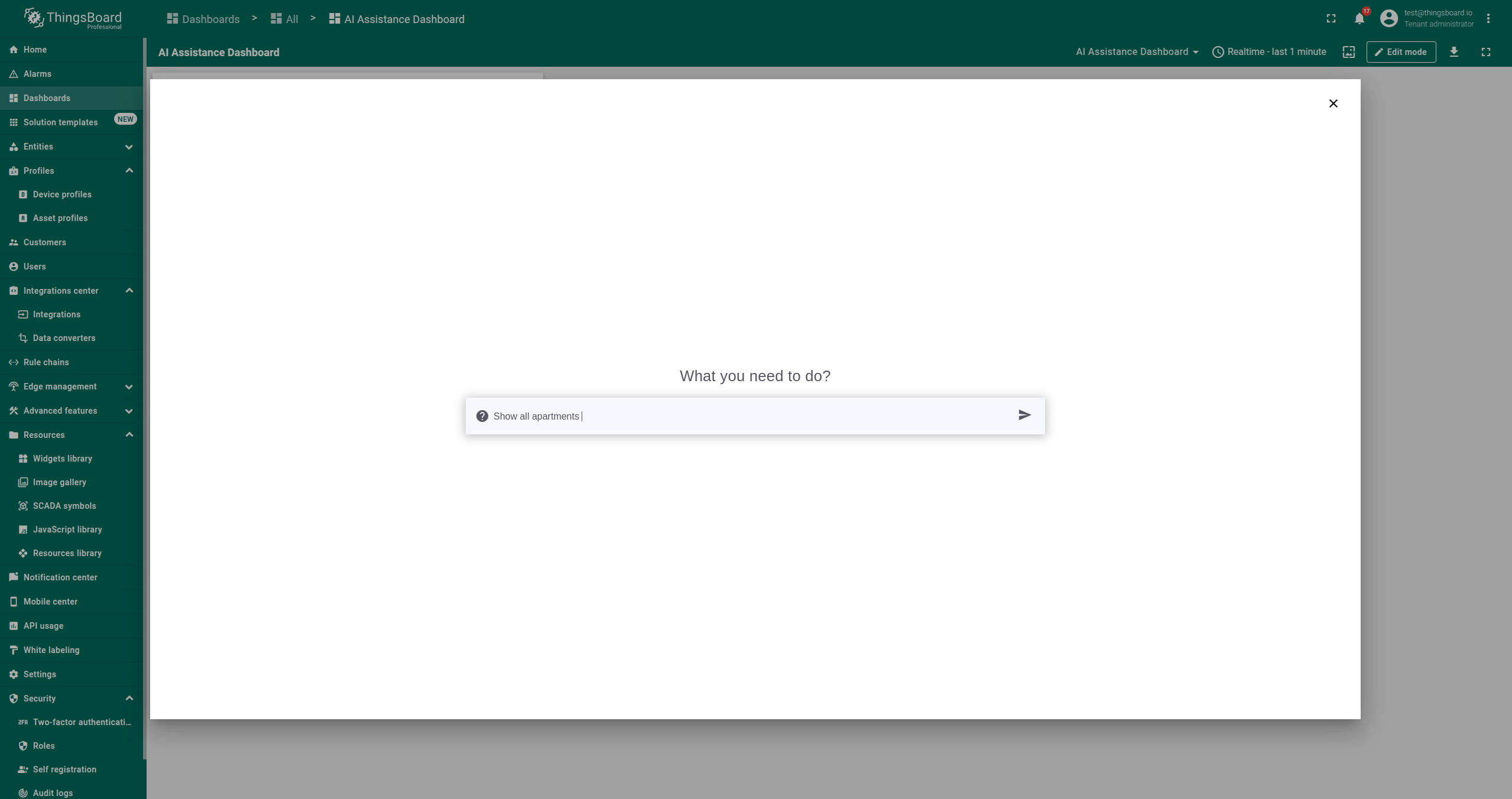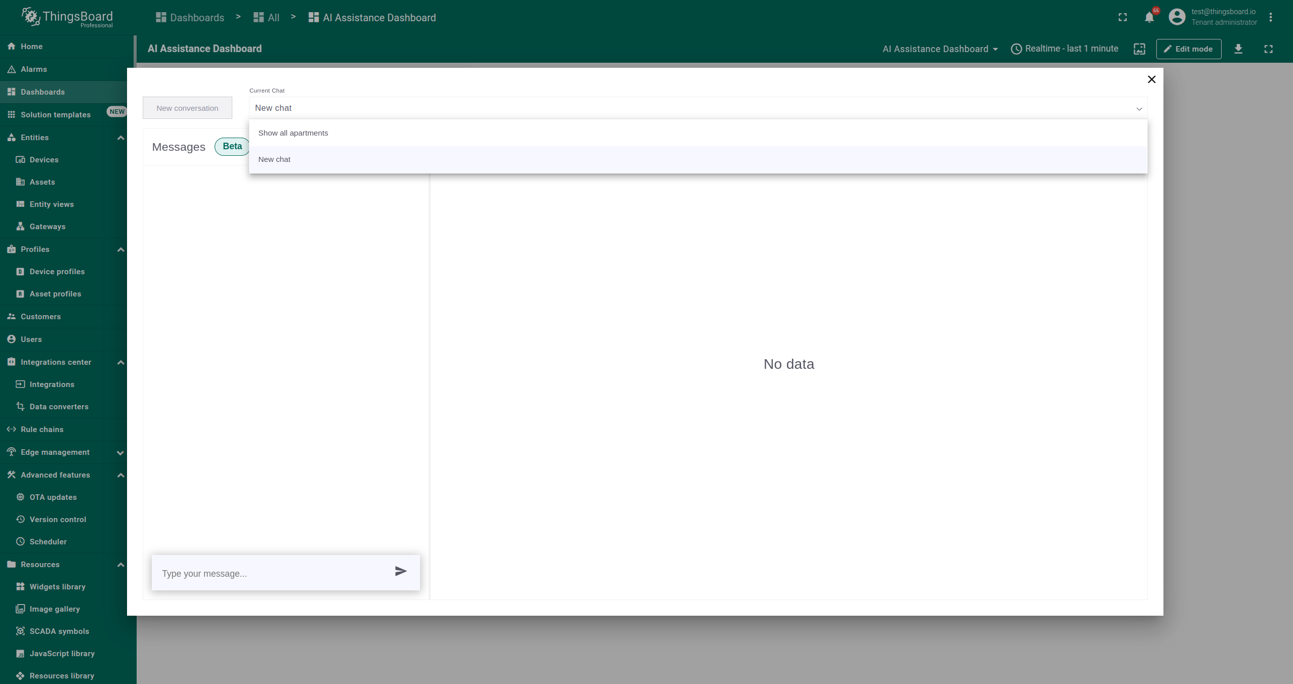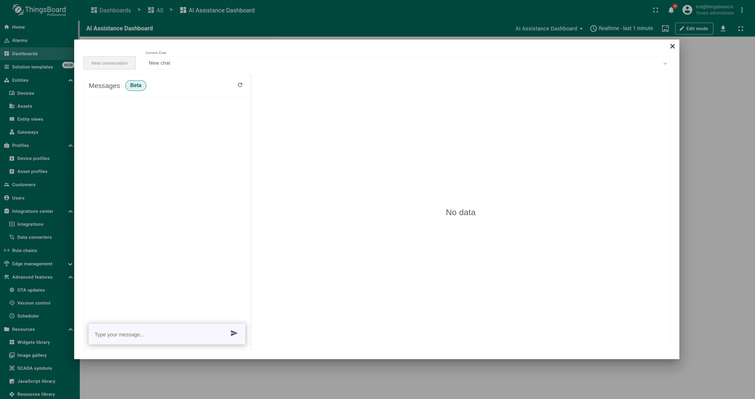 AI 助手部件是一种交互工具,允许用户通过聊天会话快速检索和分析数据。它可添加到ThingsBoard的仪表板中,便于提问并获得即时回复。