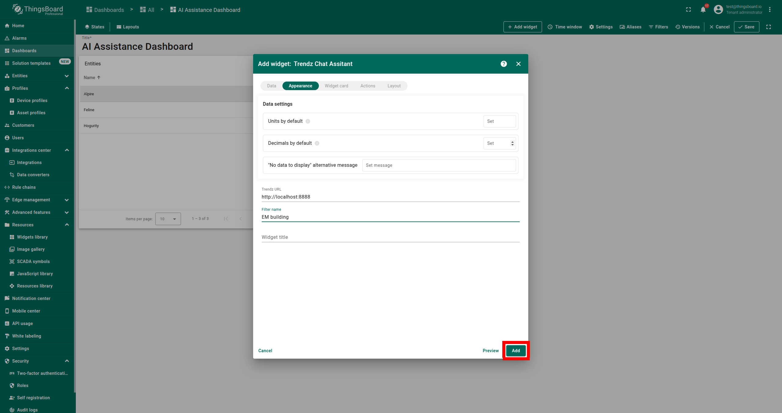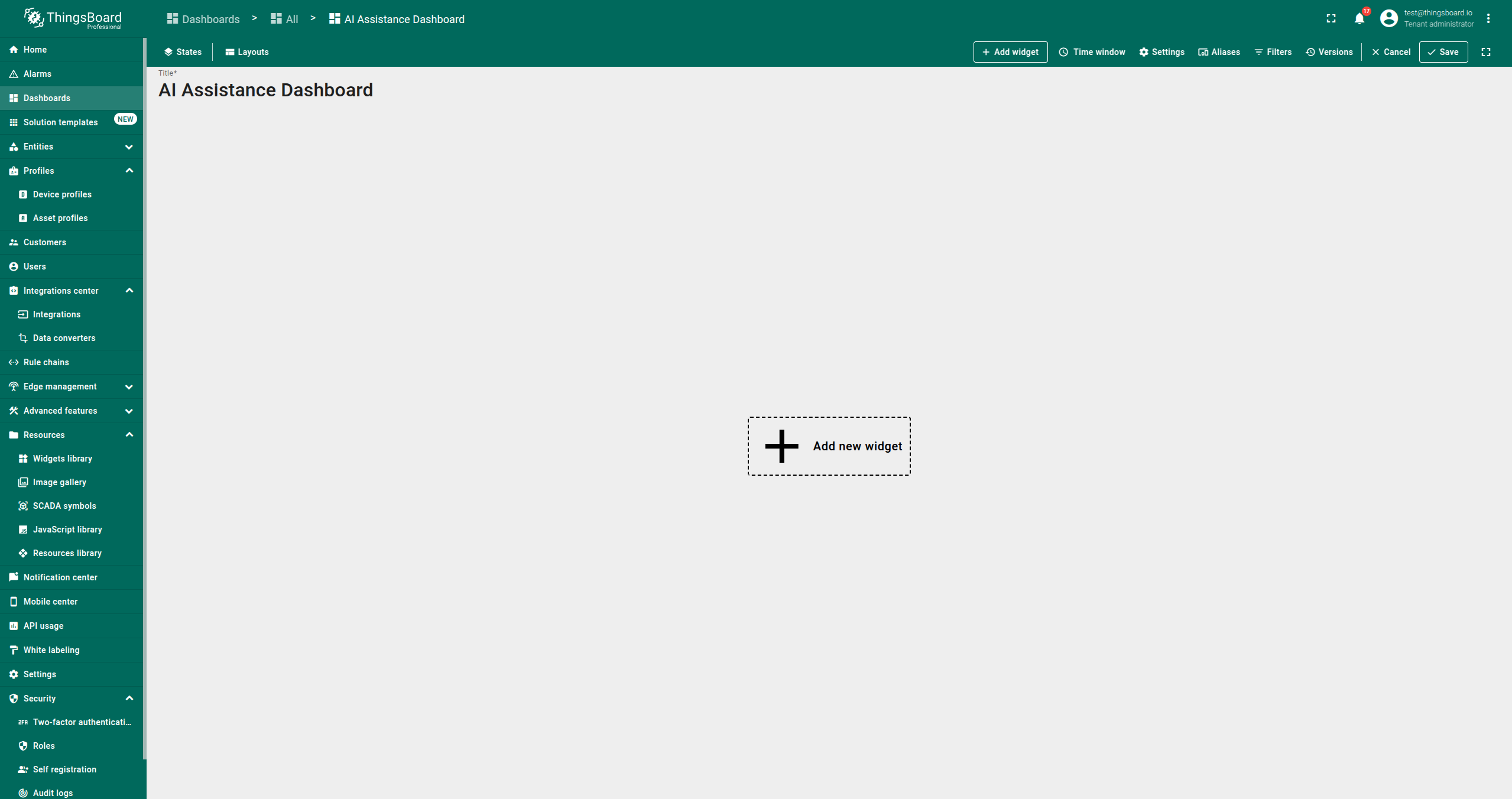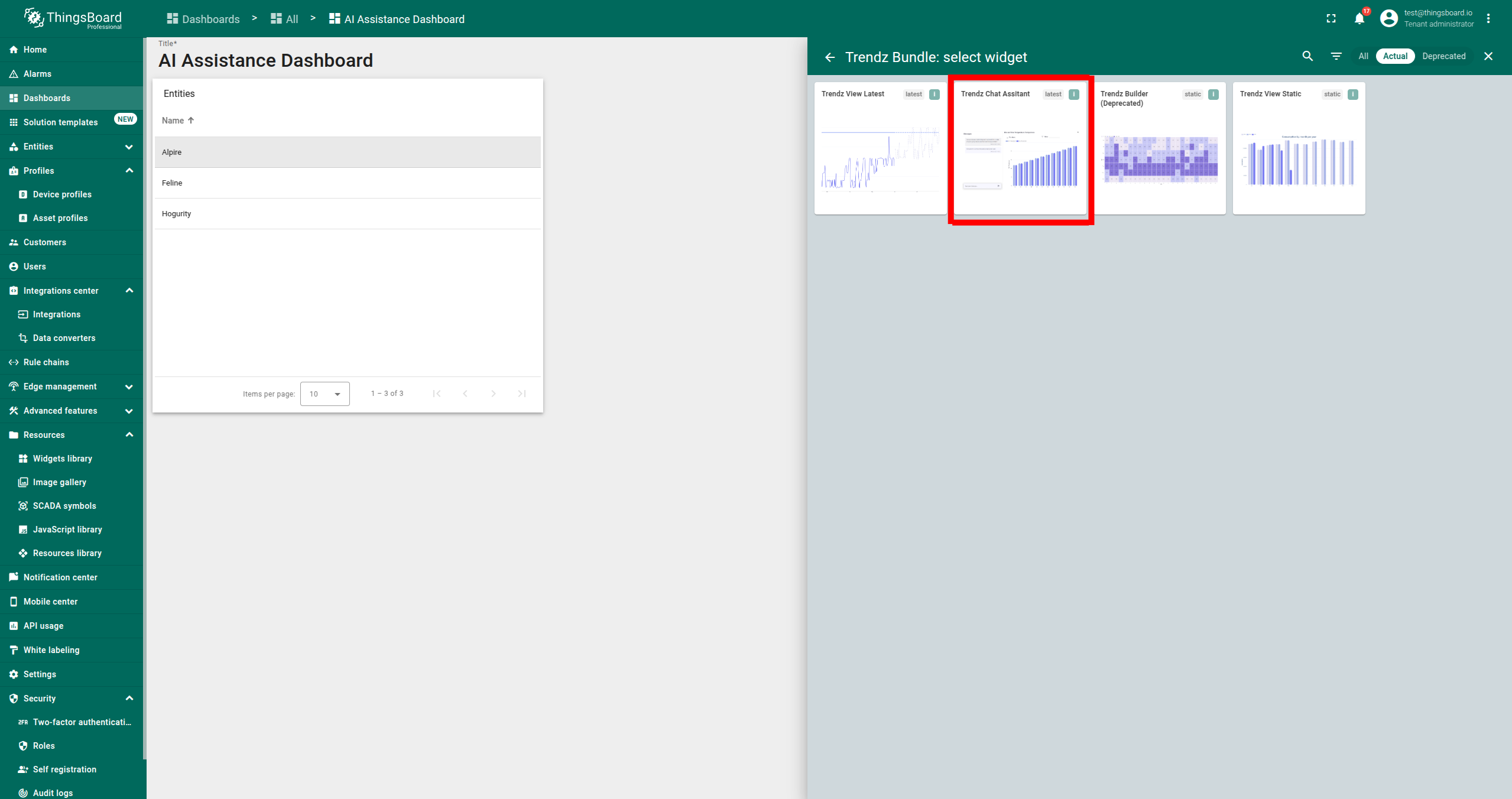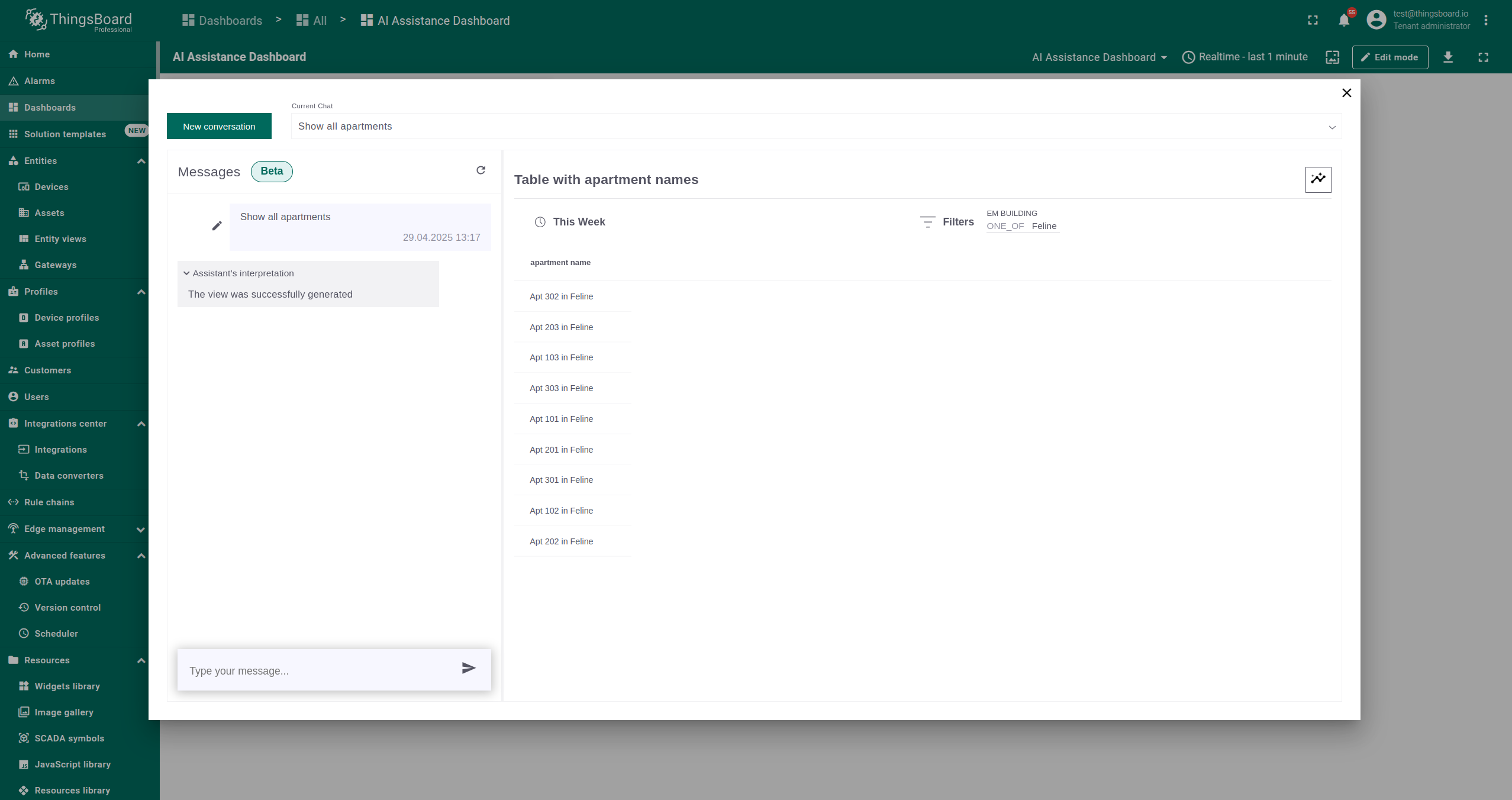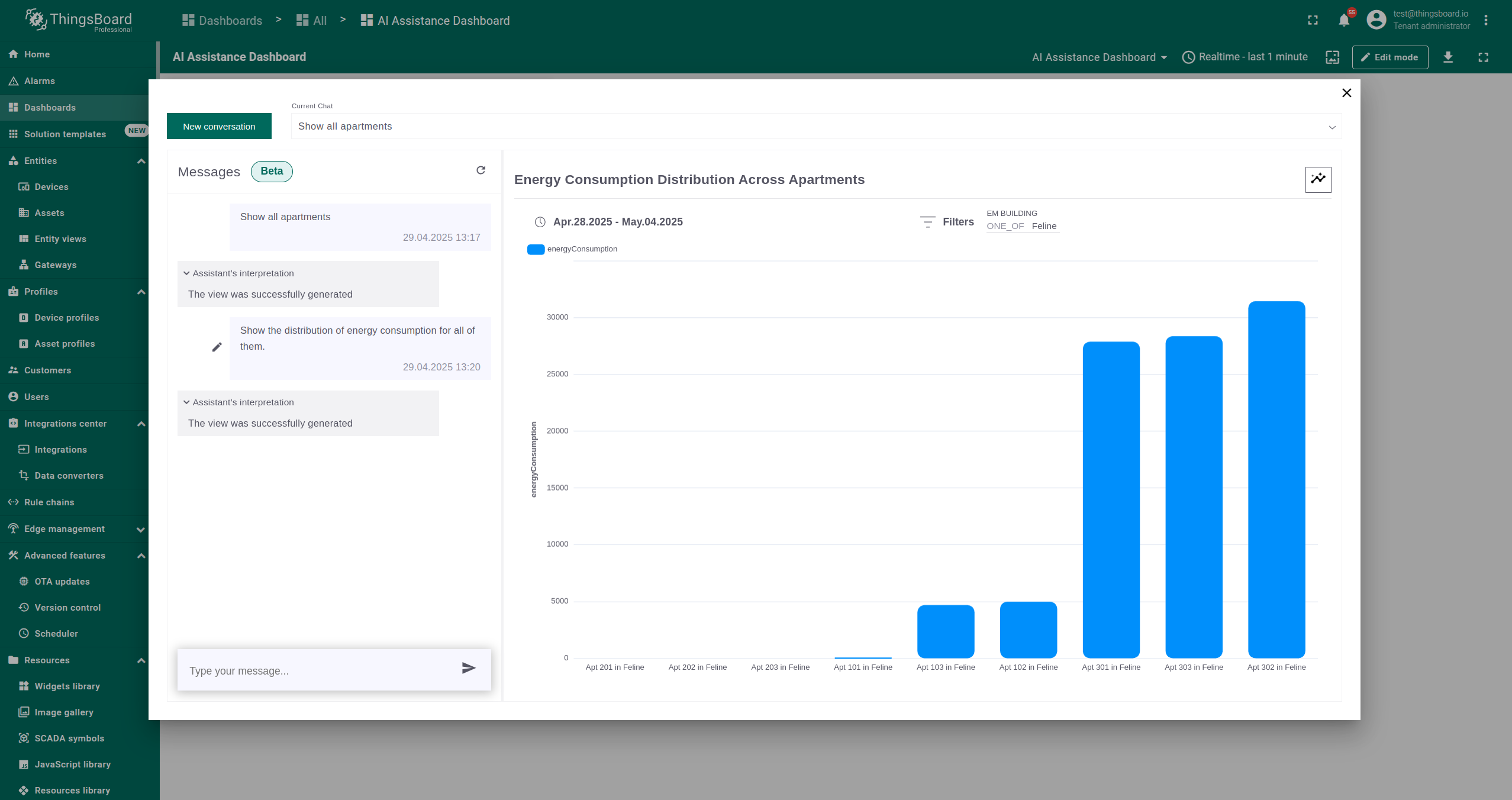 AI 助手部件是一种交互工具,允许用户通过聊天会话快速检索和分析数据。它可添加到ThingsBoard的仪表板中,便于提问并获得即时回复。