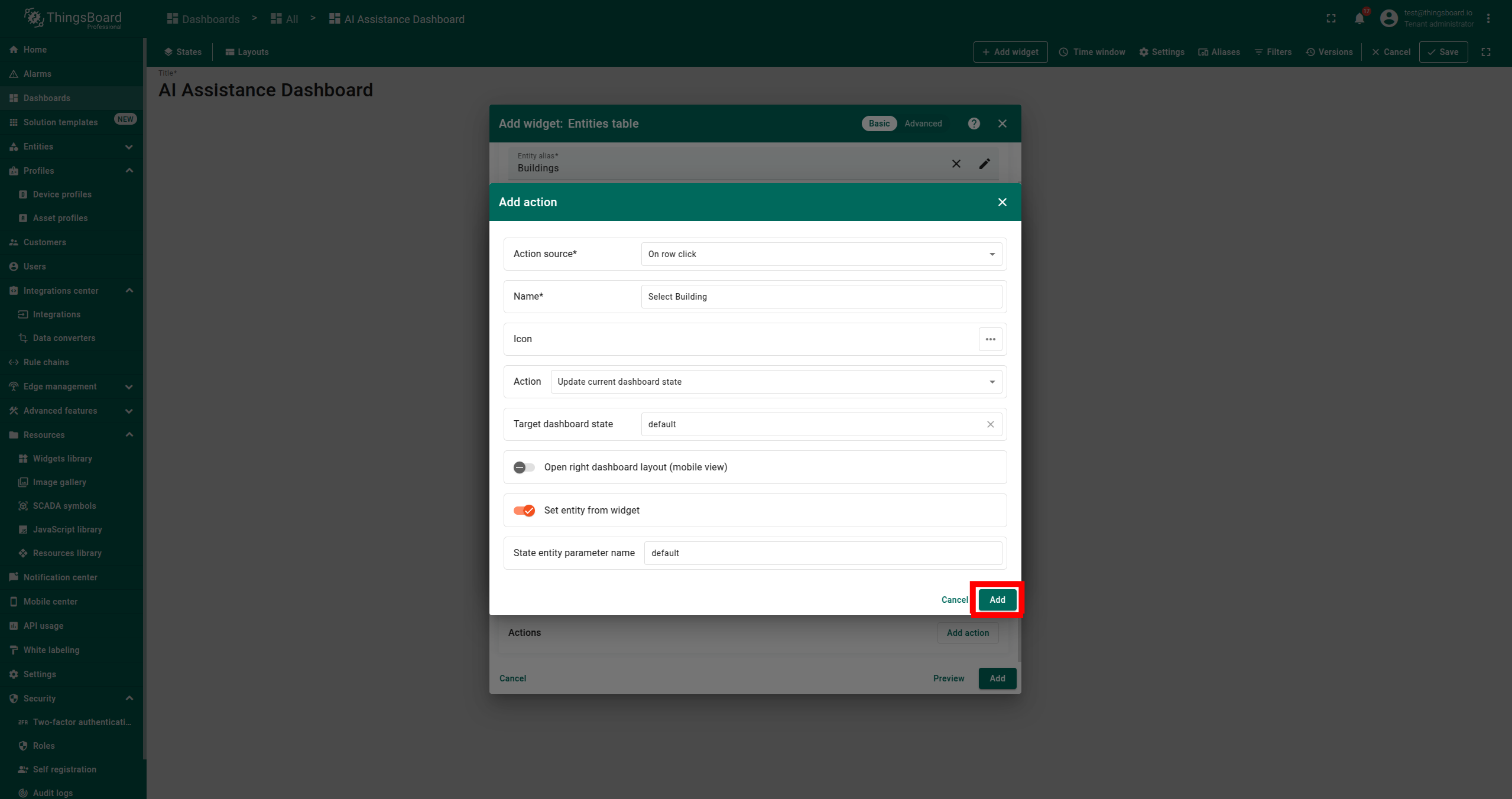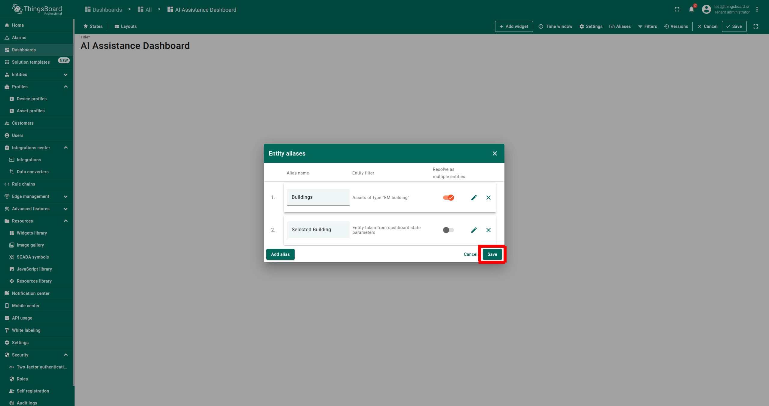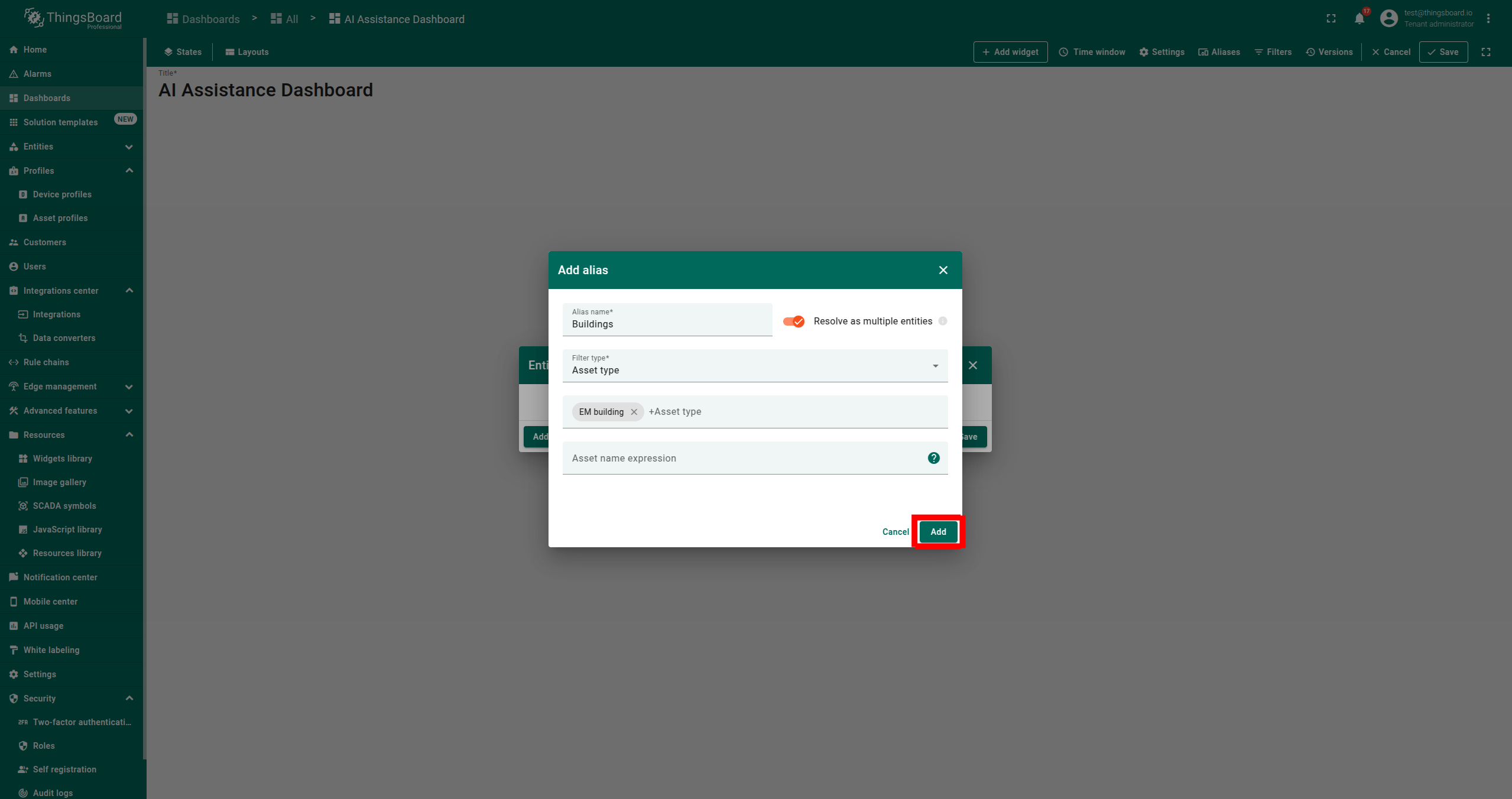 - 添加第二个别名:输入 Alias Name,选择 Filter Type 为 Entity from dashboard state,在 State entity parameter name 中输入 default,点击 Add
