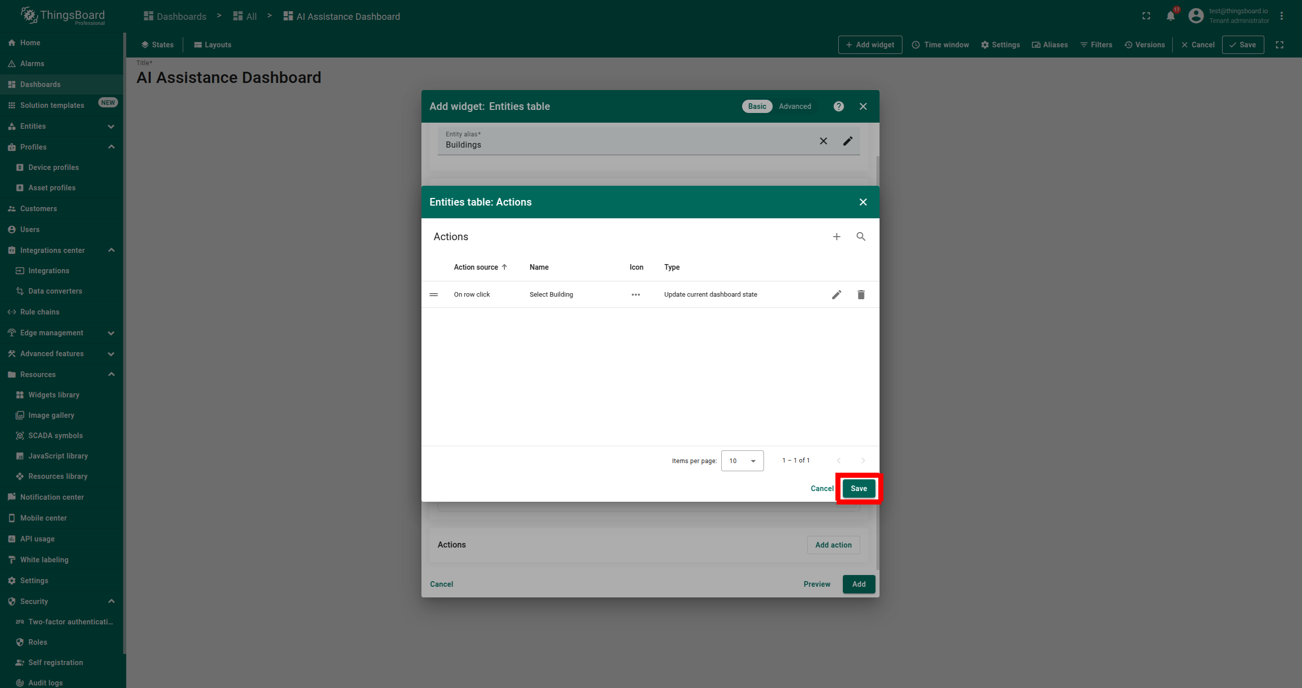 - 确认高级分析聊天助手部件已添加。点击 Save