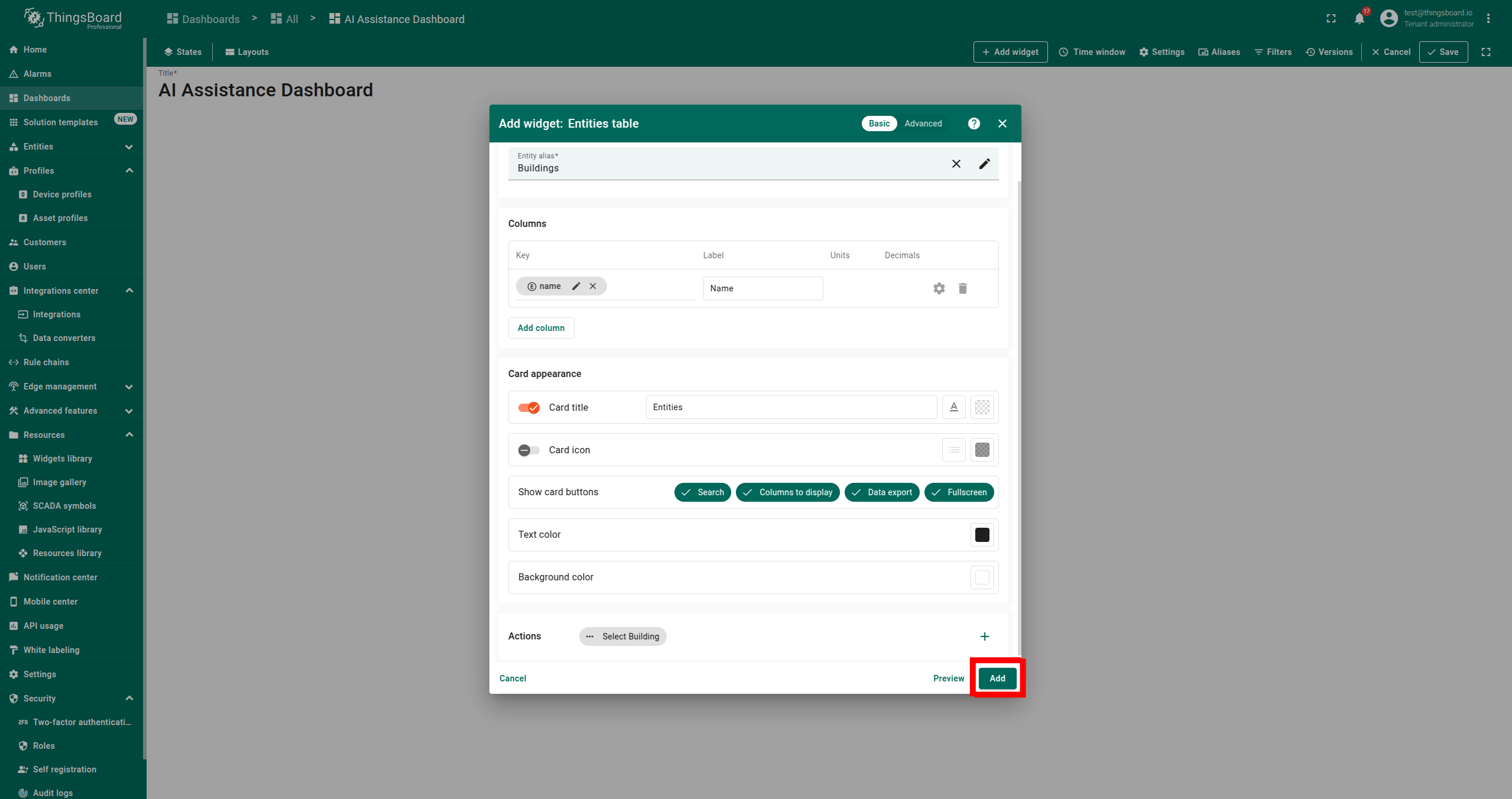 - 点击 Add Widget,选择 “Tables” → “Entities table”