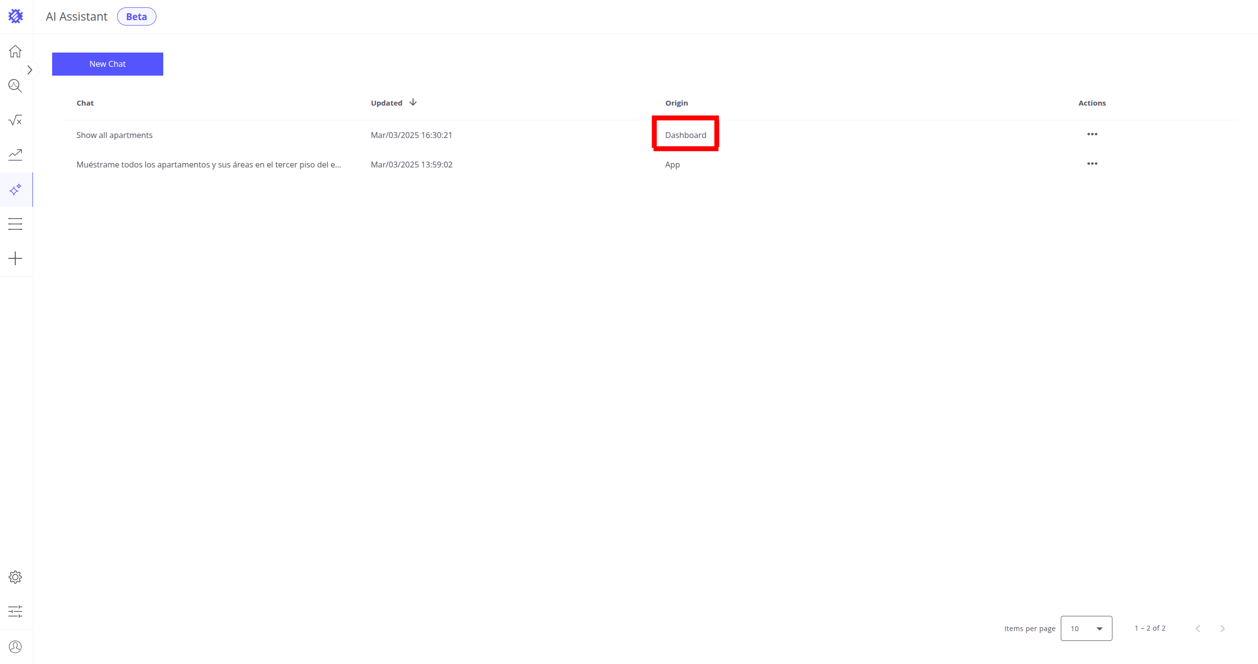 - 可在 Chats 选项卡中查看消息或保存生成的视图,选择带有 Dashboard Origin 的聊天