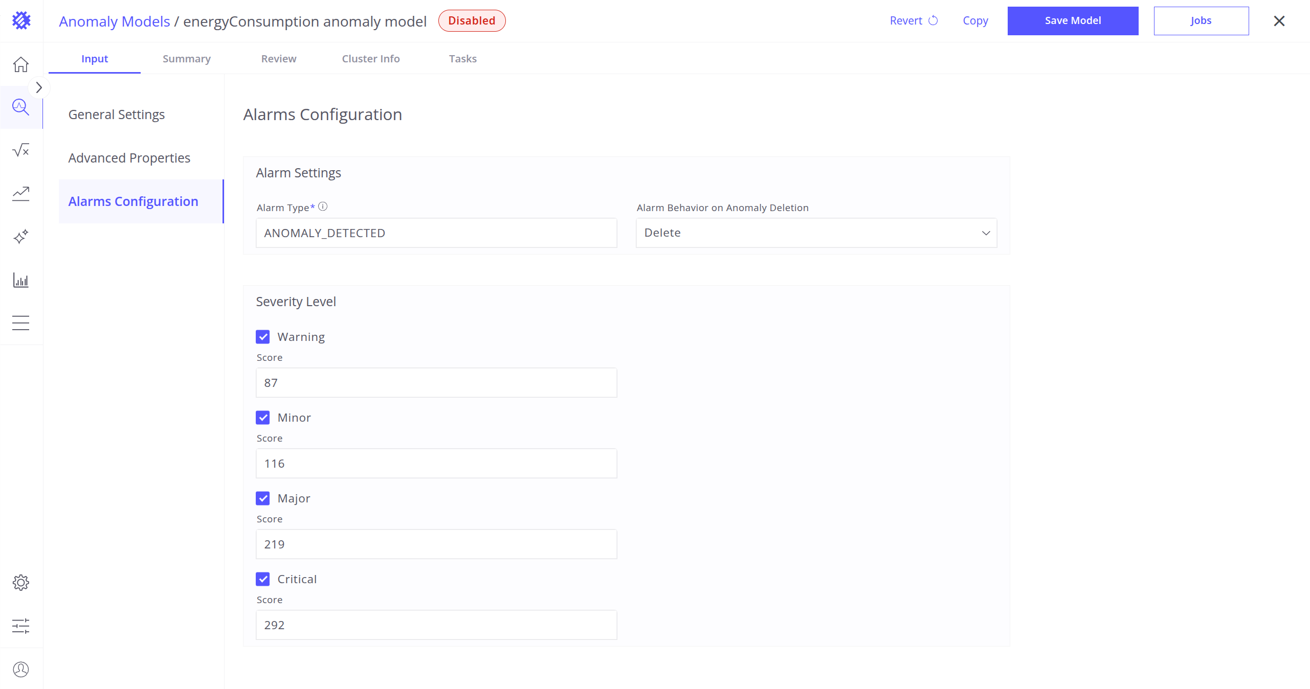 严重程度:首次构建模型后可用,用于配置各告警严重程度(如 Critical、Major、Minor)的阈值。Trendz 会根据异常分数分布自动生成默认阈值。