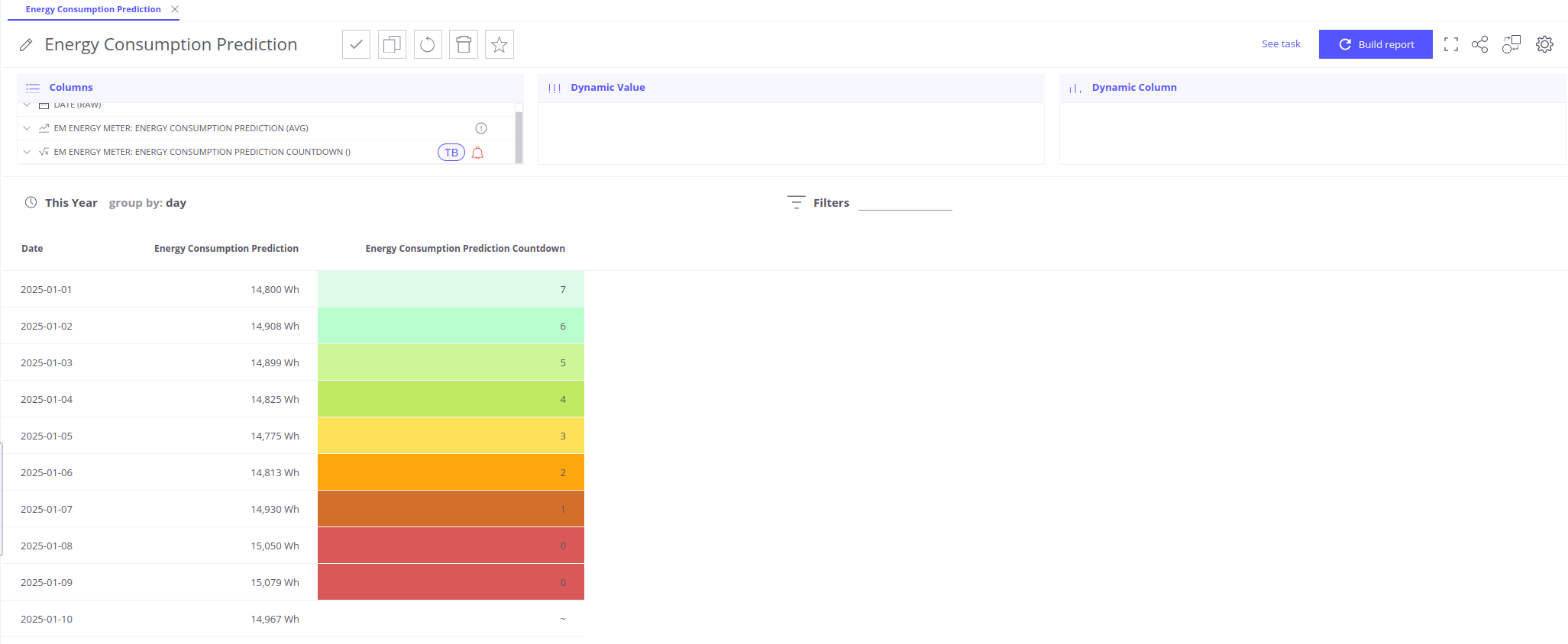 您知道能耗超过 15 kWh 对表来说过高(例如),并希望在其发生前 3 天做出反应。因此,15 kWh 为遥测阈值,3 天为时间阈值。故条件为“能耗预测”>= 15000。