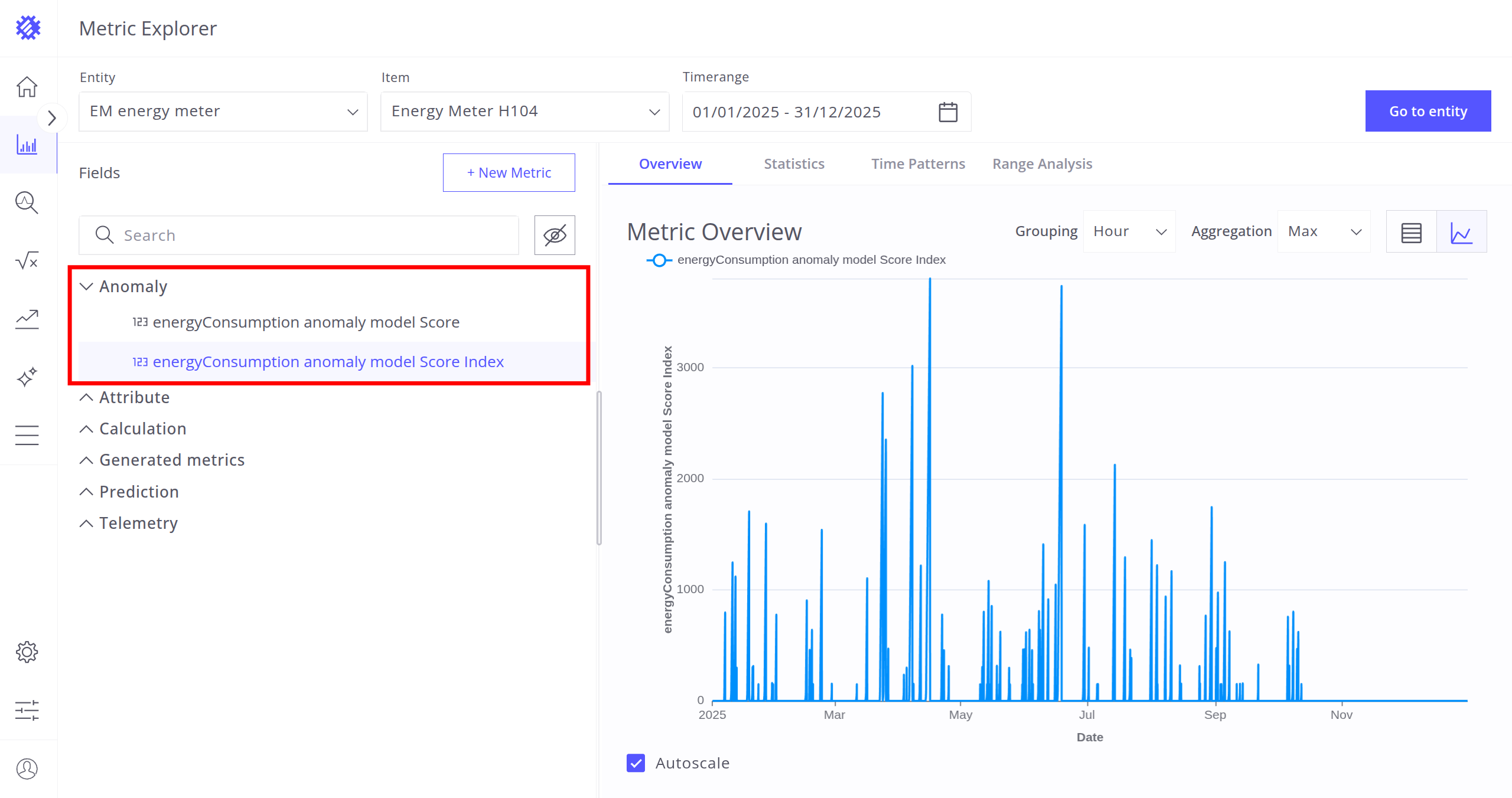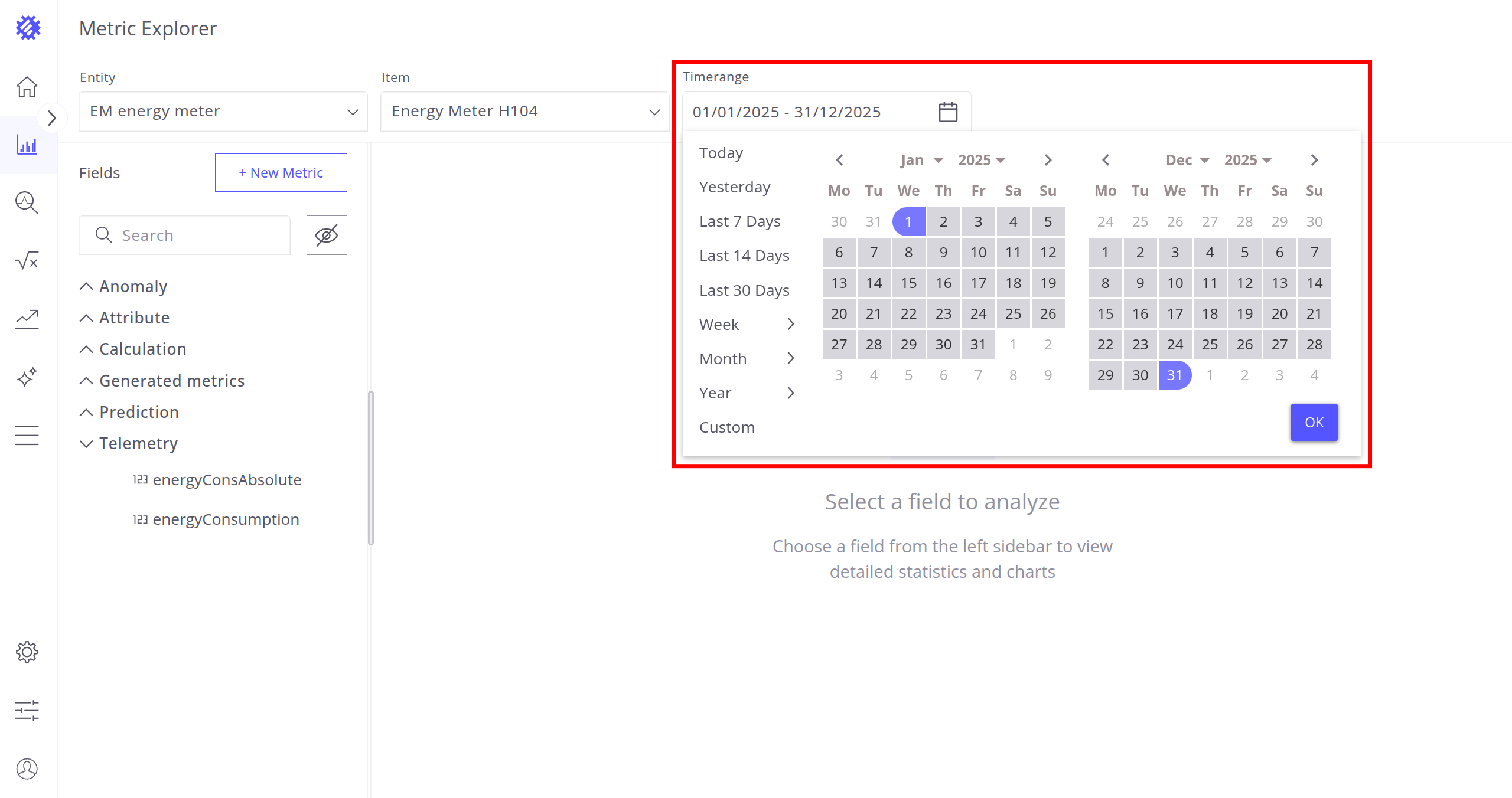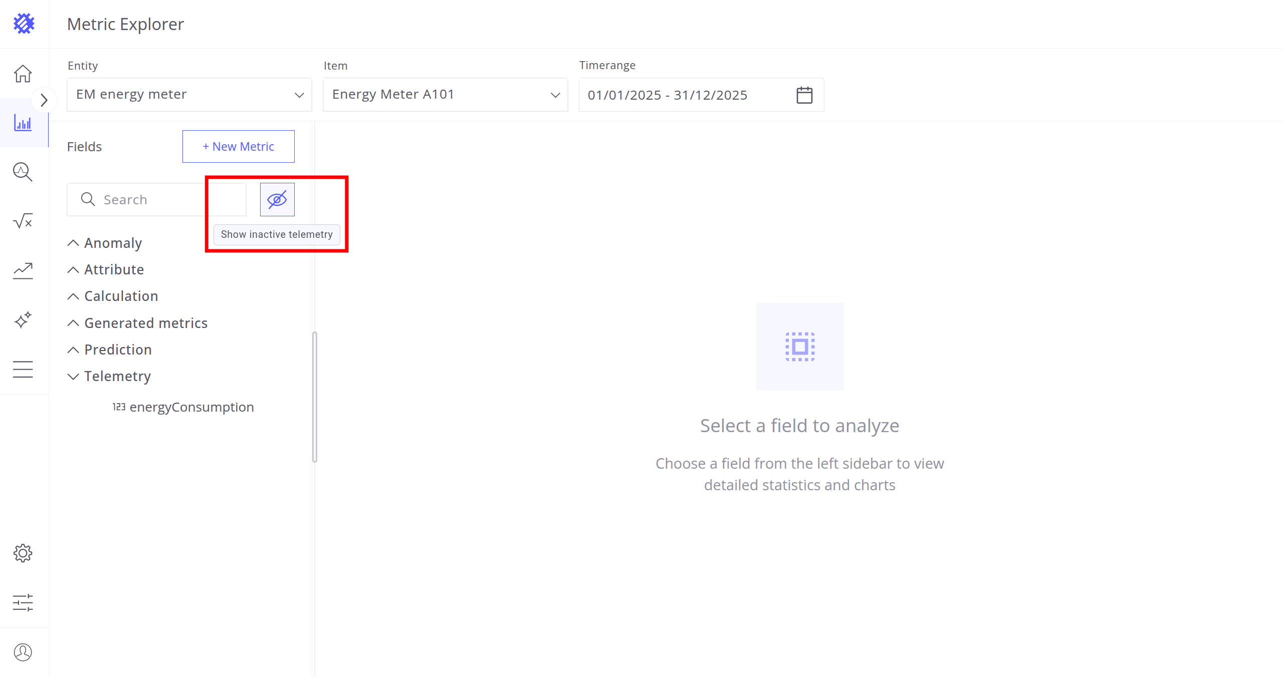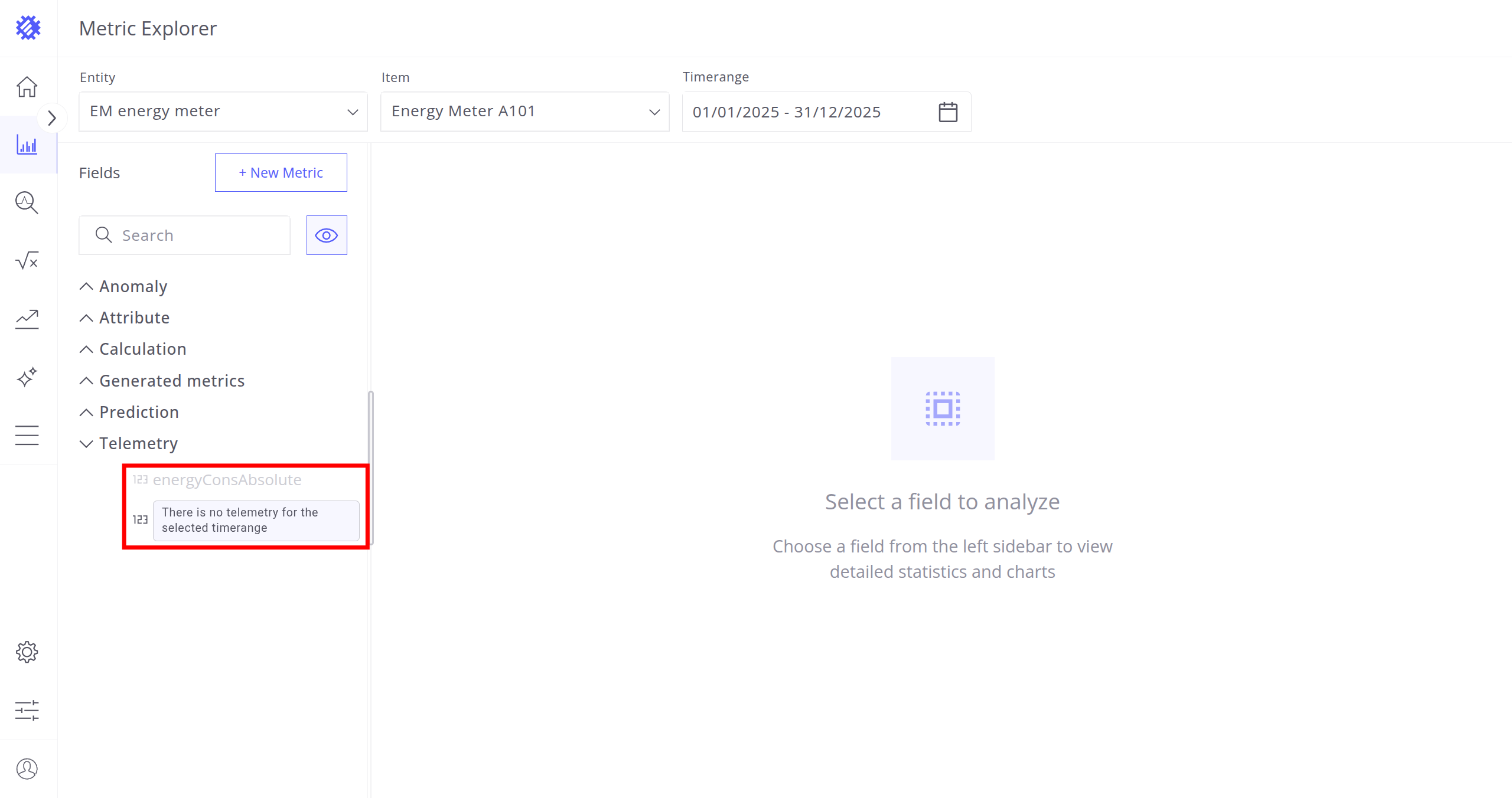 After selecting the entity, item, and timerange, choose a metric (telemetry or attribute) for analysis. Interaction with metrics is described in the next section.