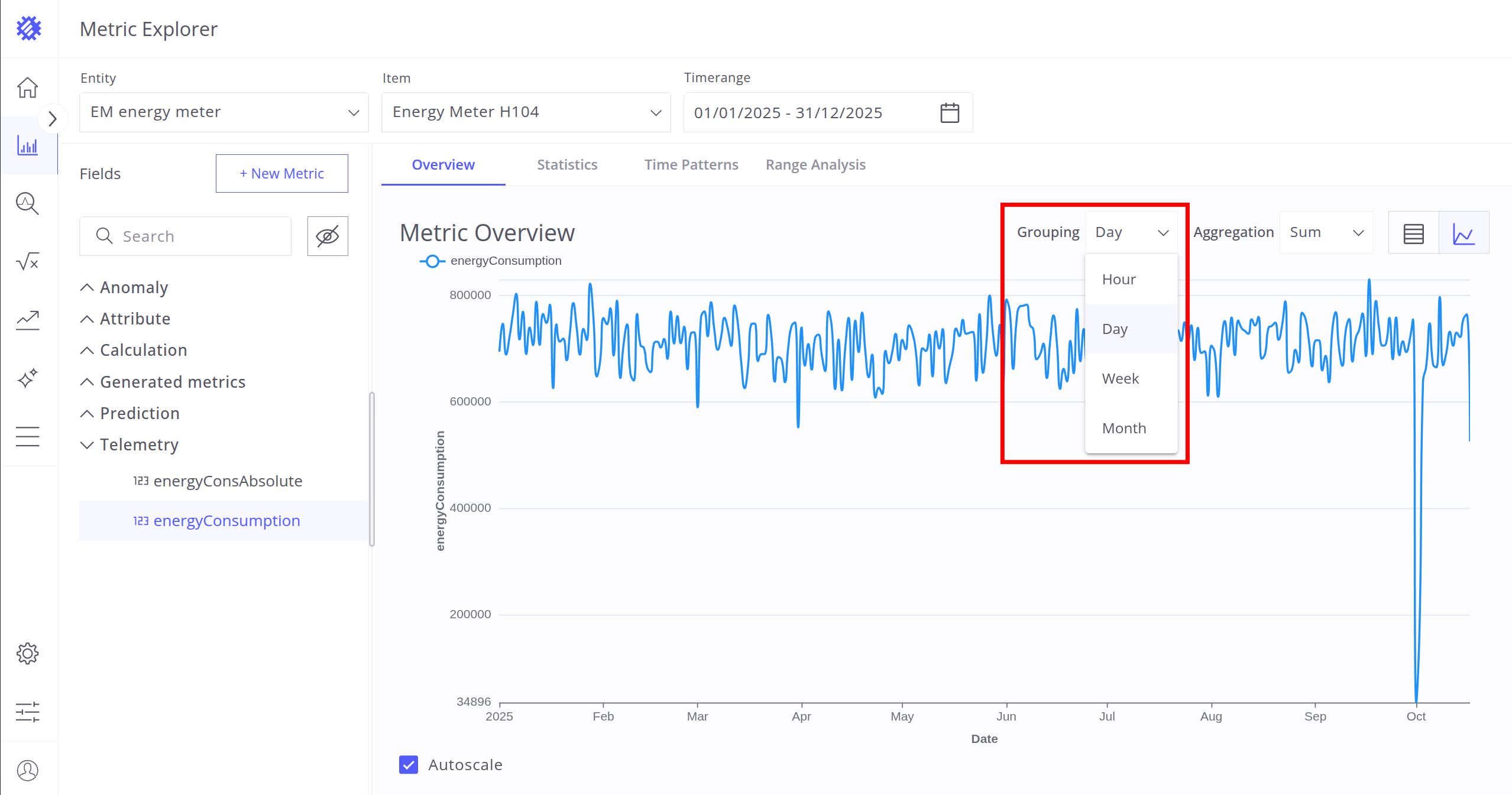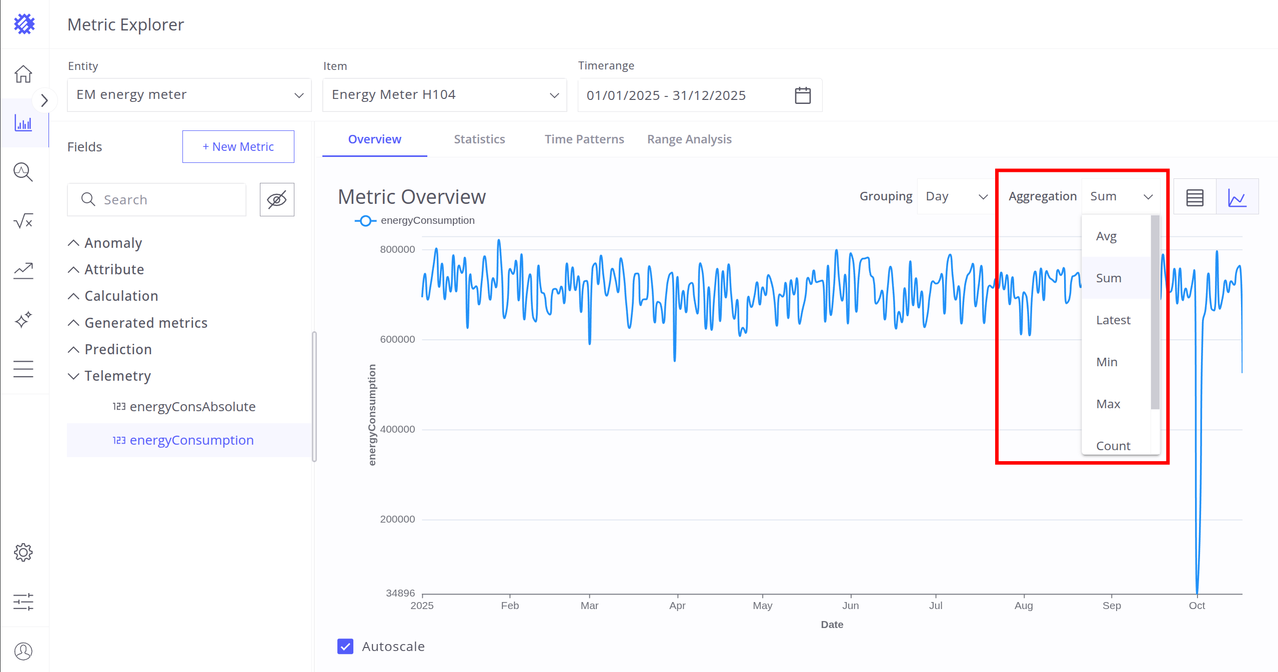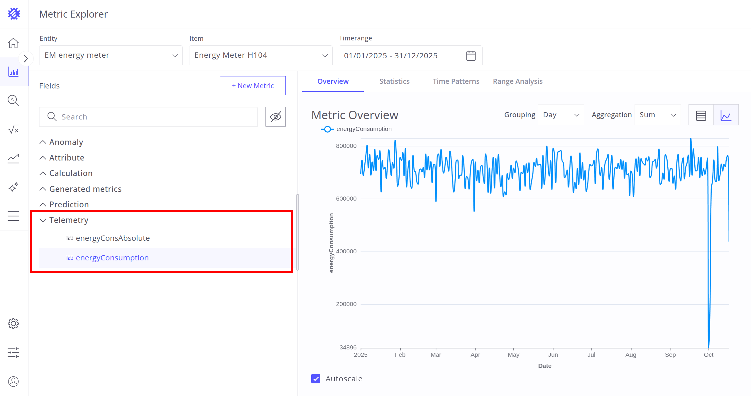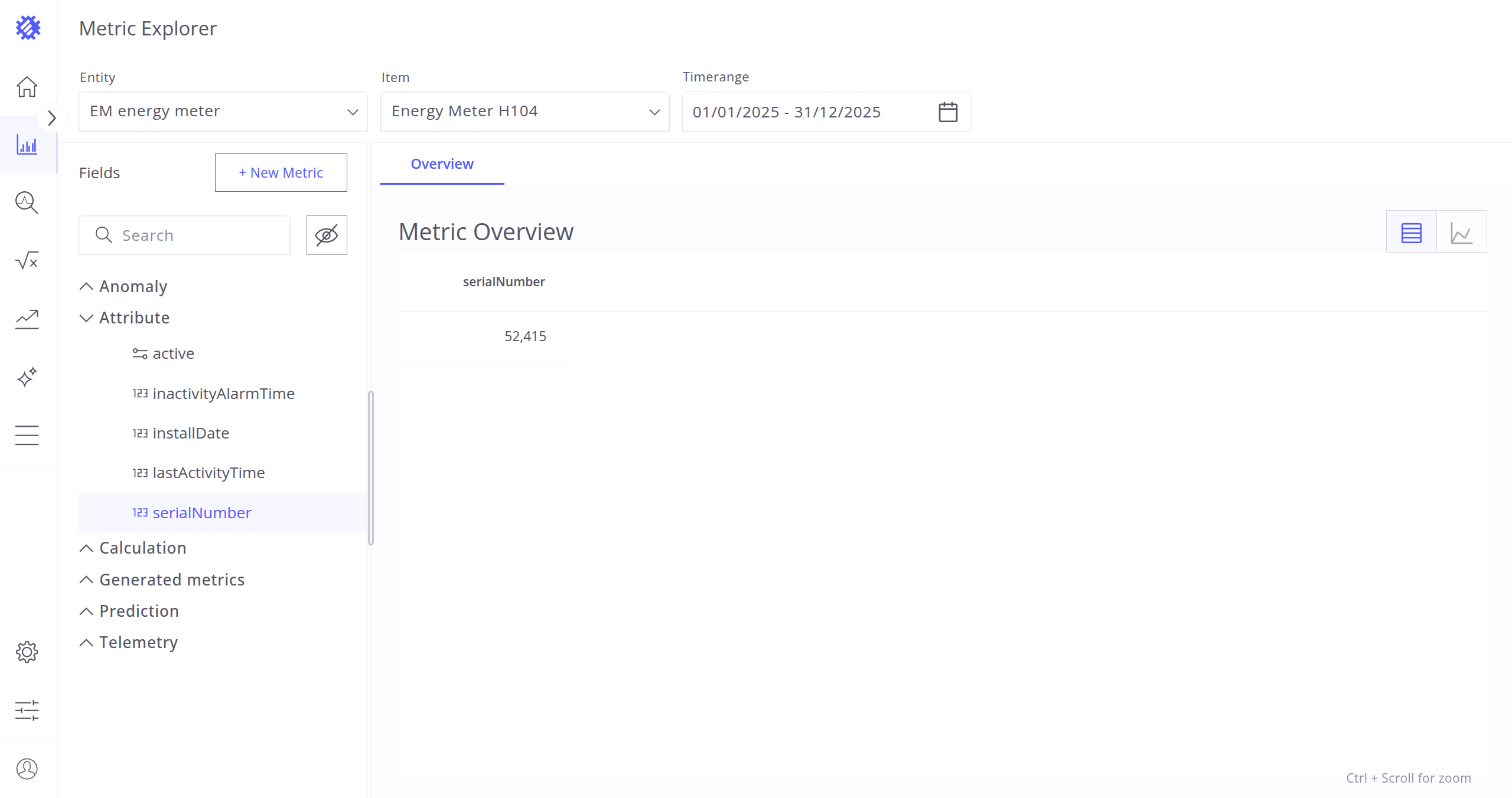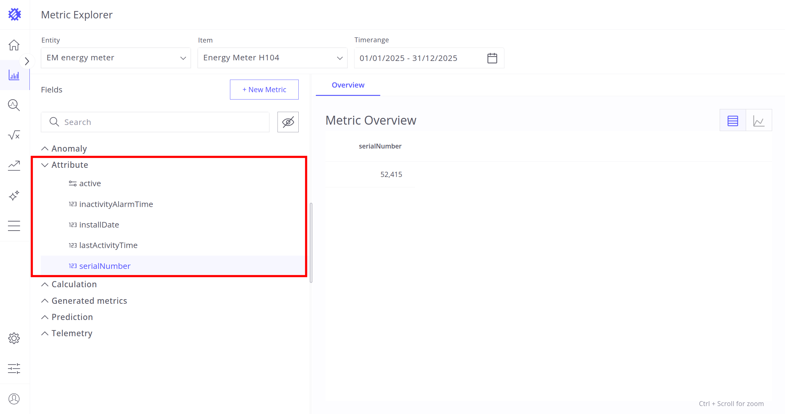 After selecting the entity, item, and timerange, choose a metric (telemetry or attribute) for analysis. Interaction with metrics is described in the next section.