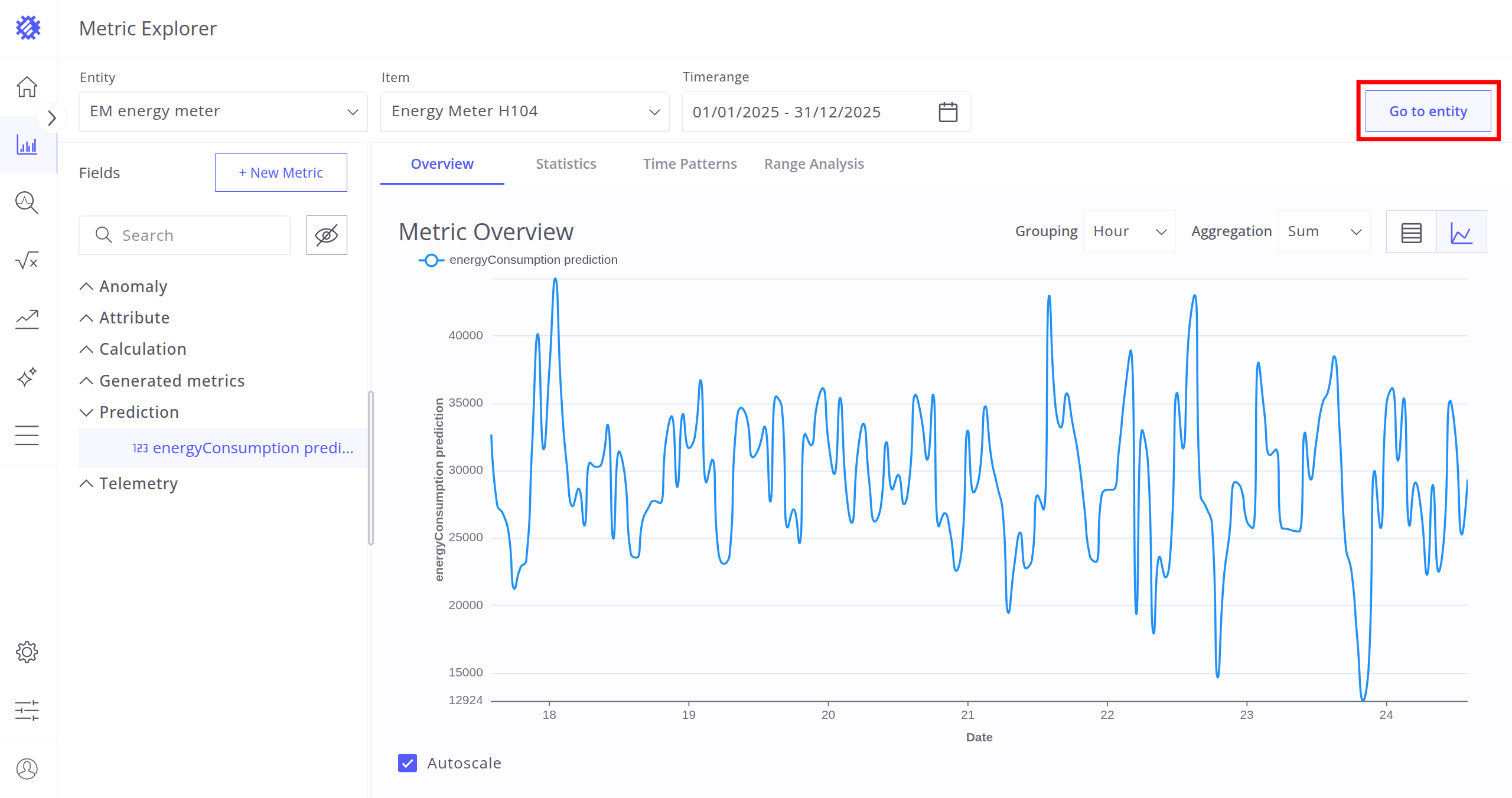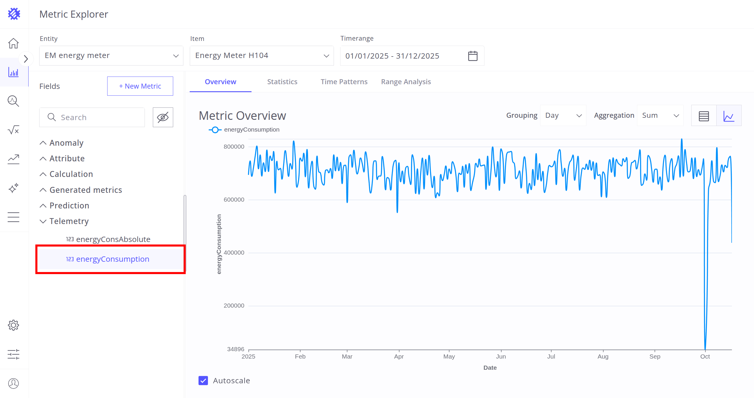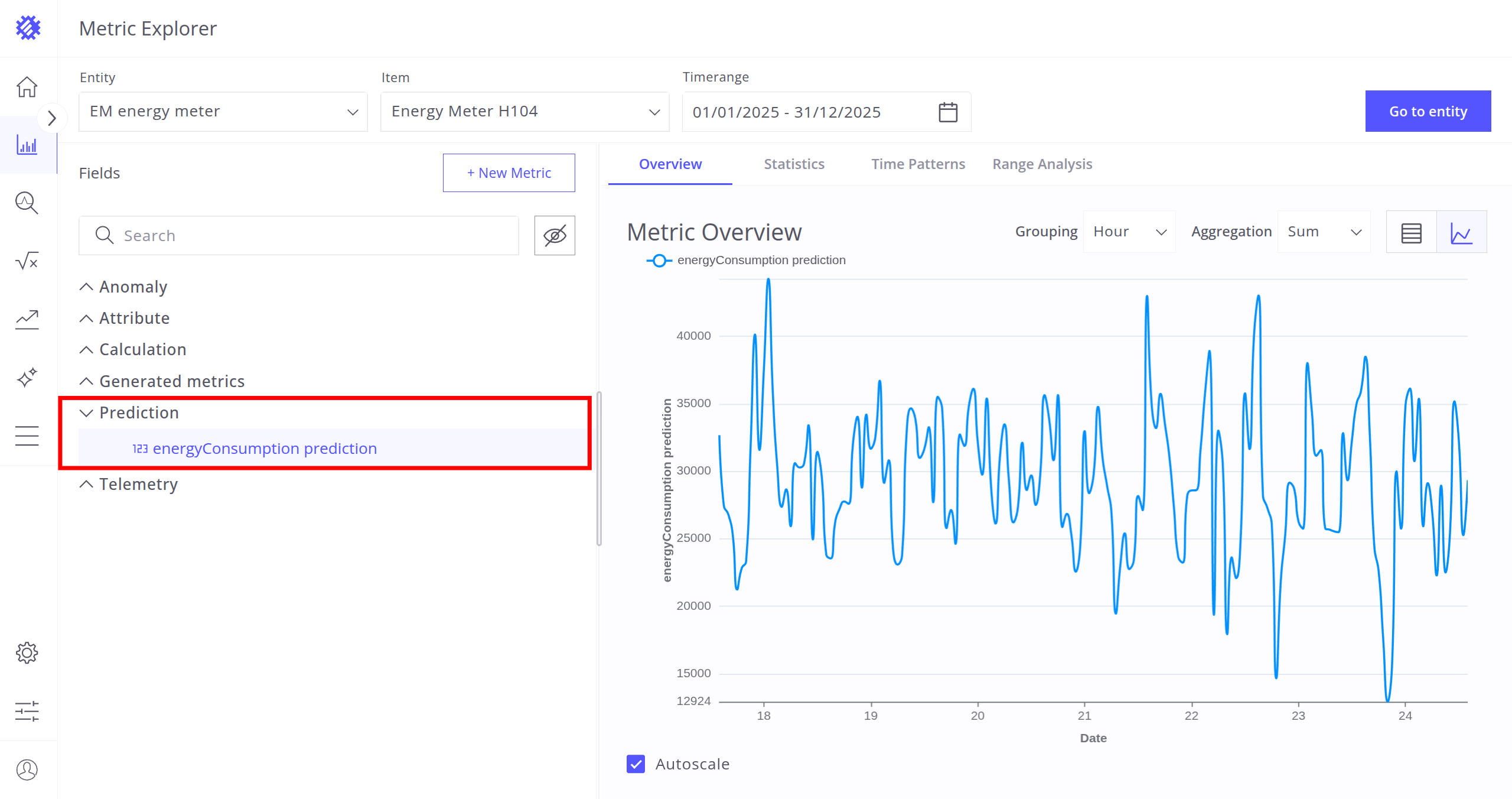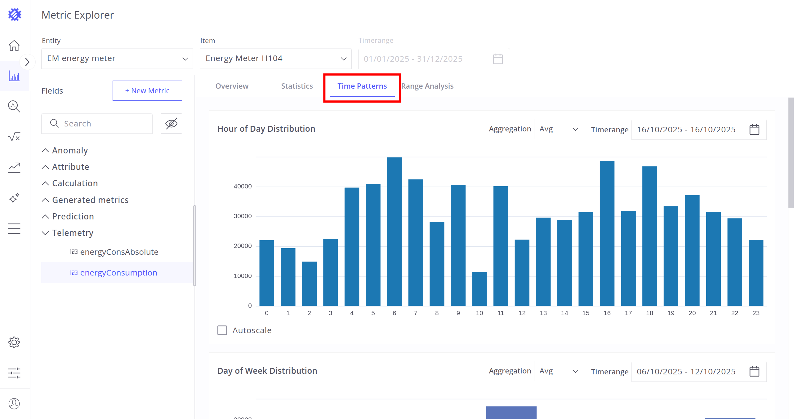 After selecting the entity, item, and timerange, choose a metric (telemetry or attribute) for analysis. Interaction with metrics is described in the next section.