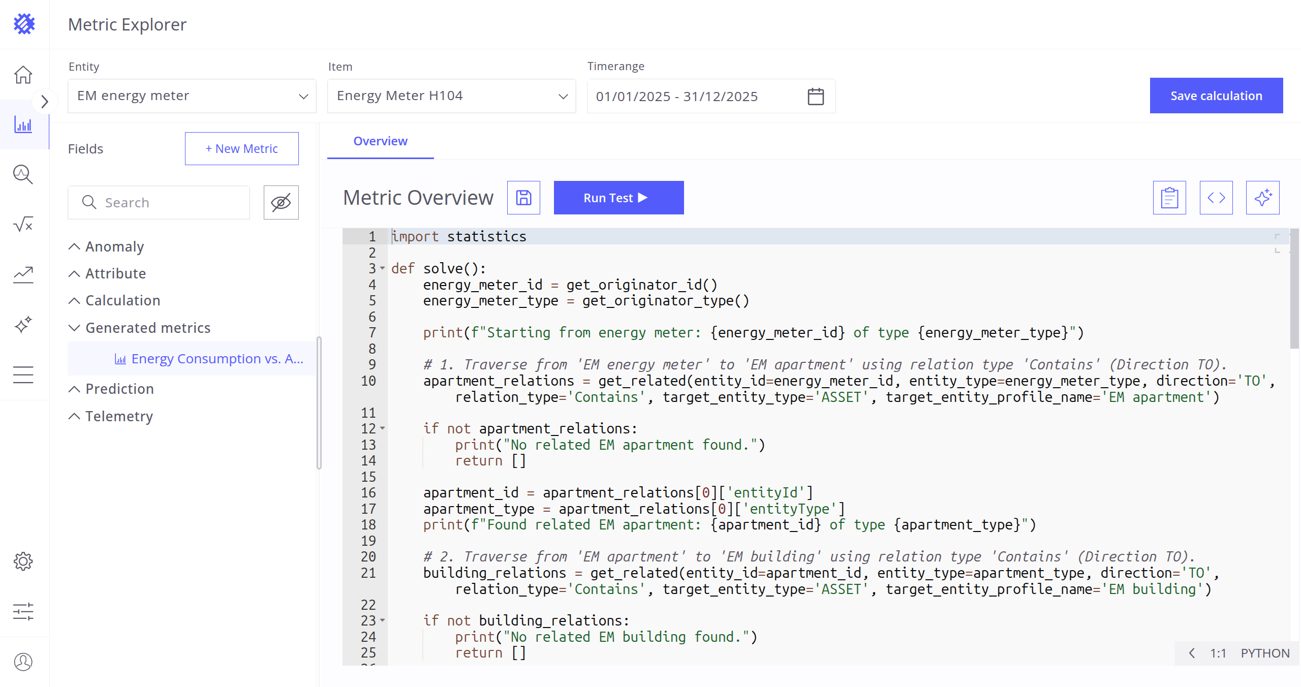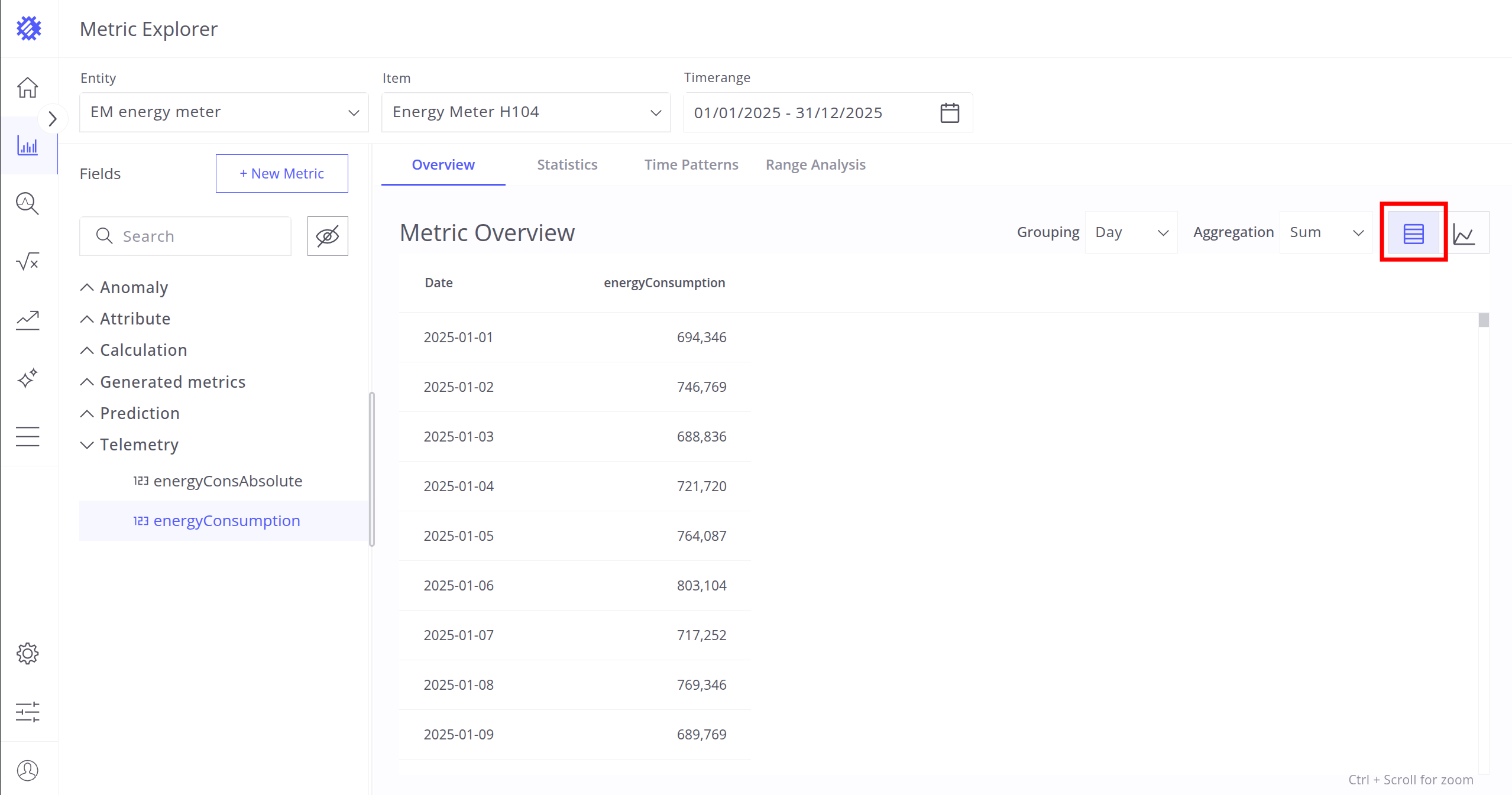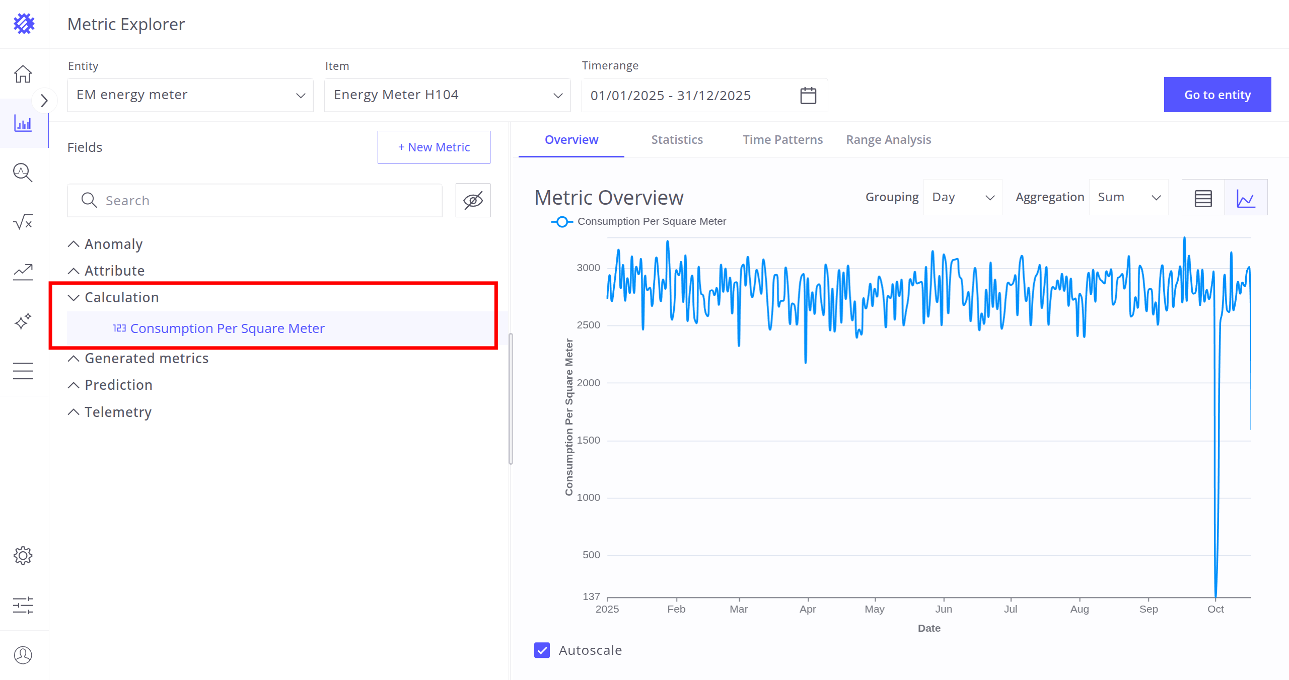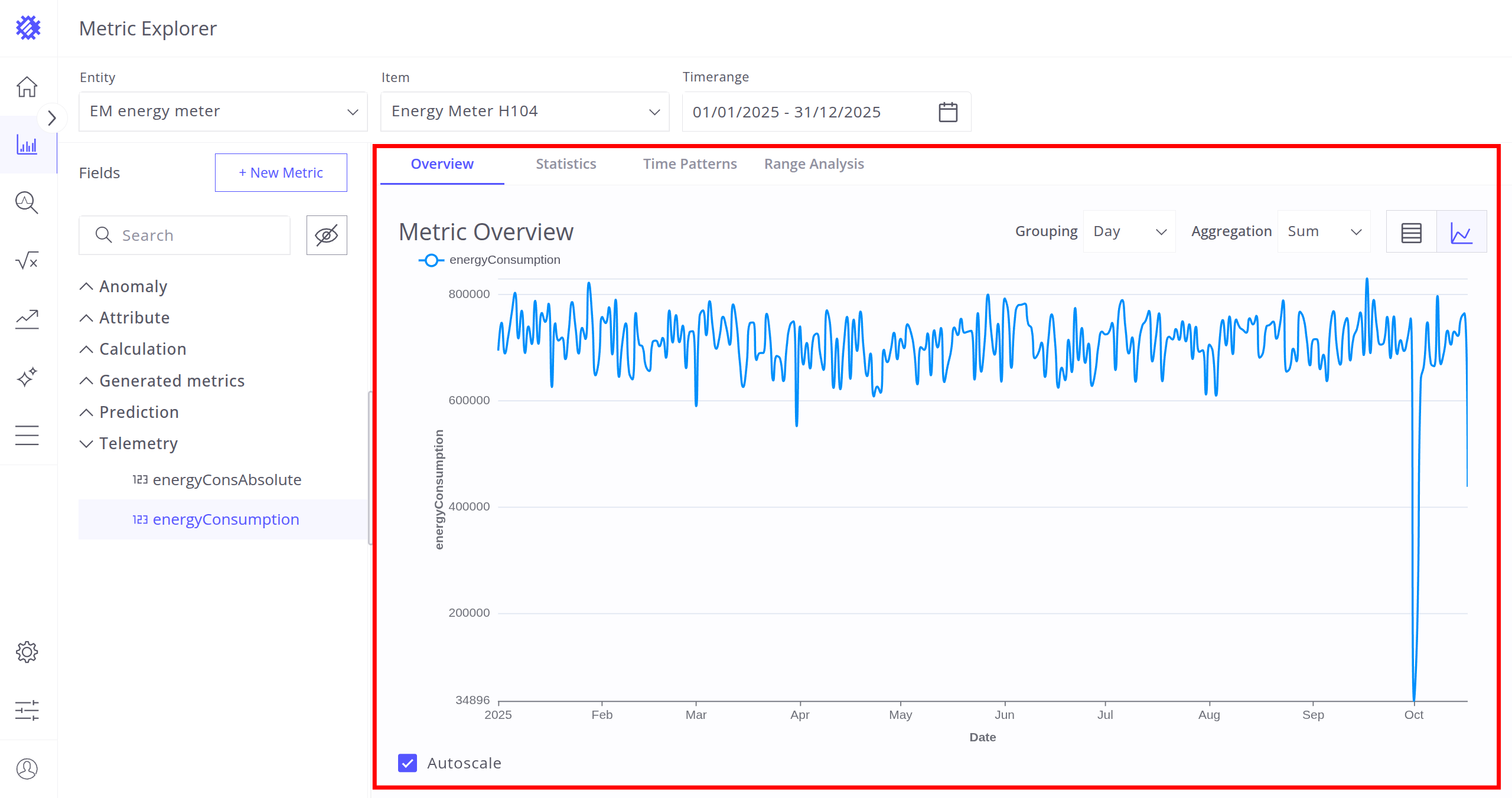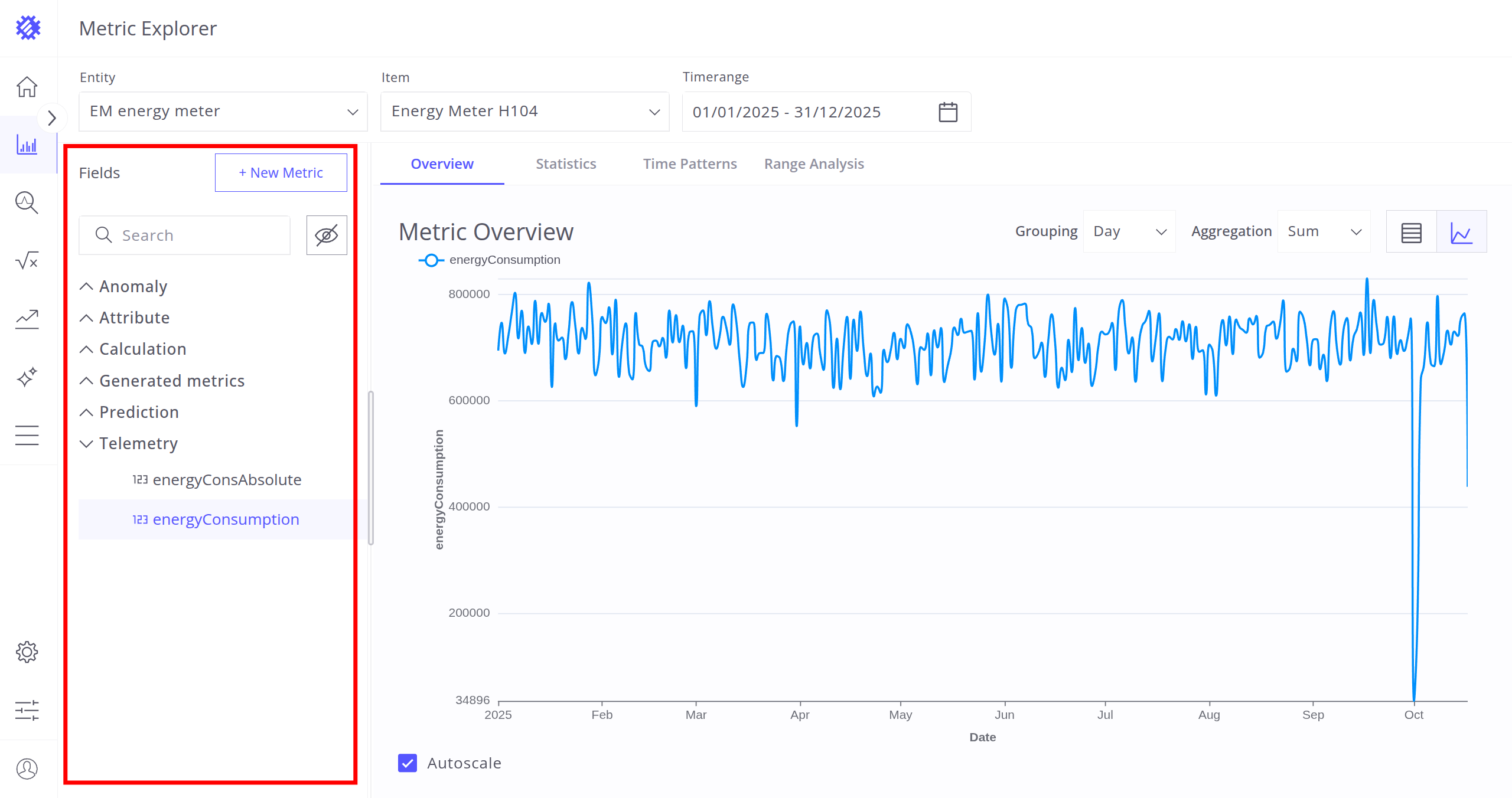 After selecting the entity, item, and timerange, choose a metric (telemetry or attribute) for analysis. Interaction with metrics is described in the next section.