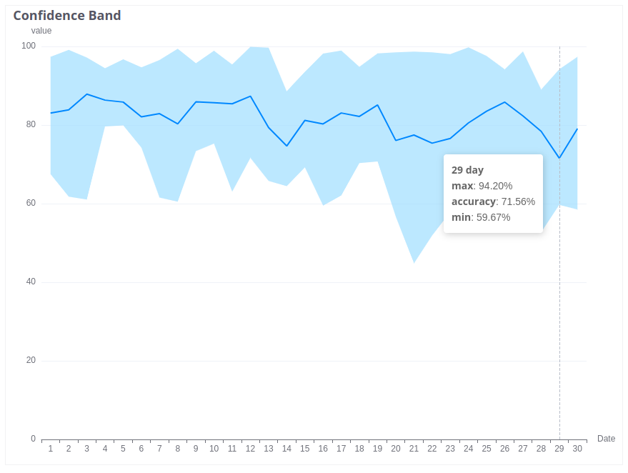 This chart shows the prediction’s accuracy as a binary feature. The result is marked as “true” if the distance between expected and actual values (in terms of both value and time) is within the thresholds defined in the configuration. Otherwise, the result is “false.” Accuracy is calculated per time unit for each segment and aggregated across the entire segment. The chart displays the average of these binary results.