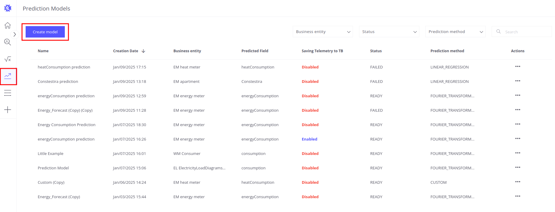 在此部分内,表格列出所有已创建的预测模型及关键详情。您可以打开、修改或对这些字段执行其他操作。要创建新的遥测预测,请单击”创建模型”按钮。