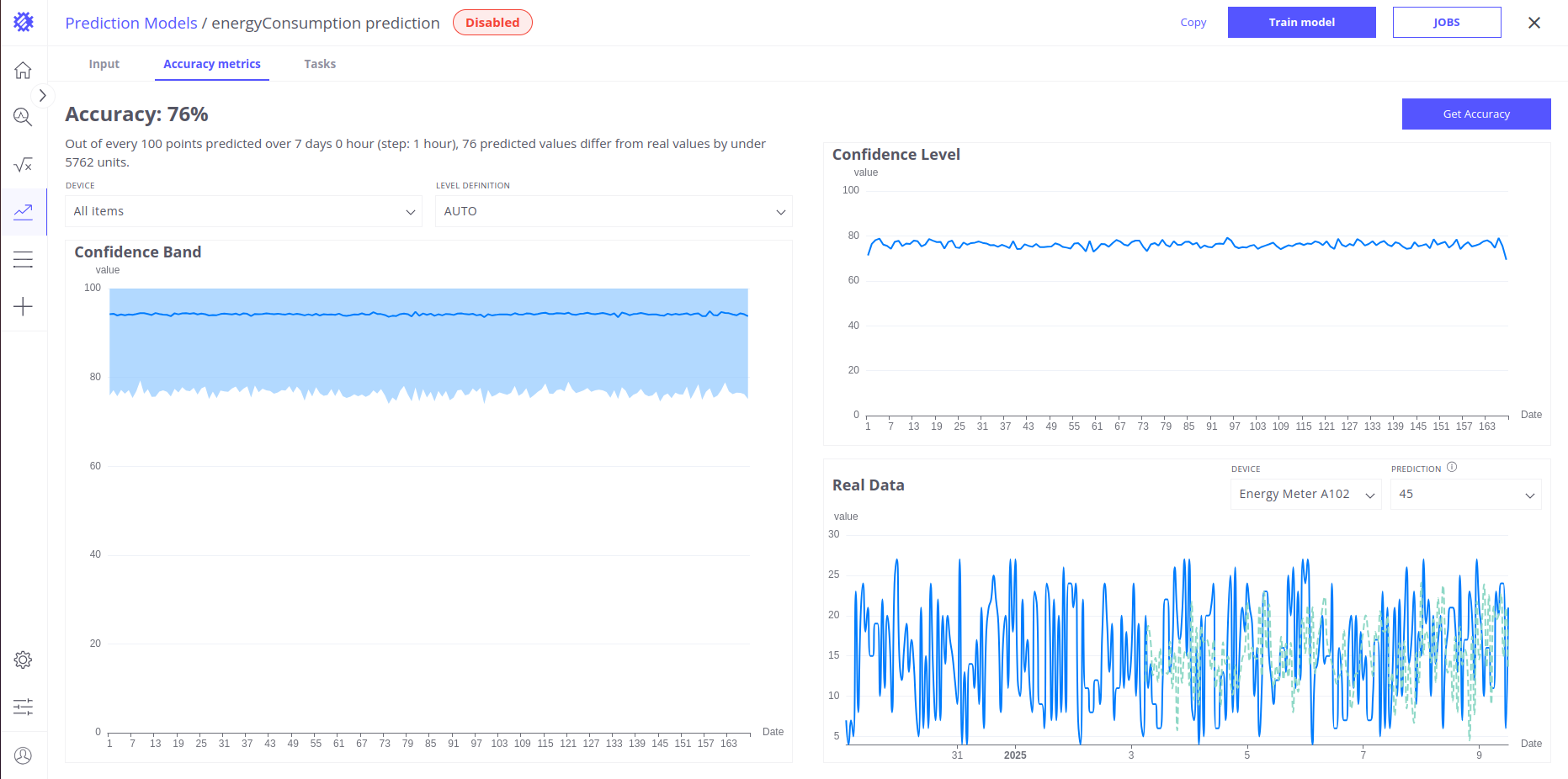 This chart illustrates the prediction’s accuracy by comparing the expected and actual telemetry values. The accuracy is calculated as the percentage difference (error function) between these values, measured per time unit within each segment. The min, max, and accuracy (average) values displayed on the chart are aggregated across all segments in the training range. These aggregated values represent the accuracy for the selected percentile of “correct” values, filtering out less useful data.