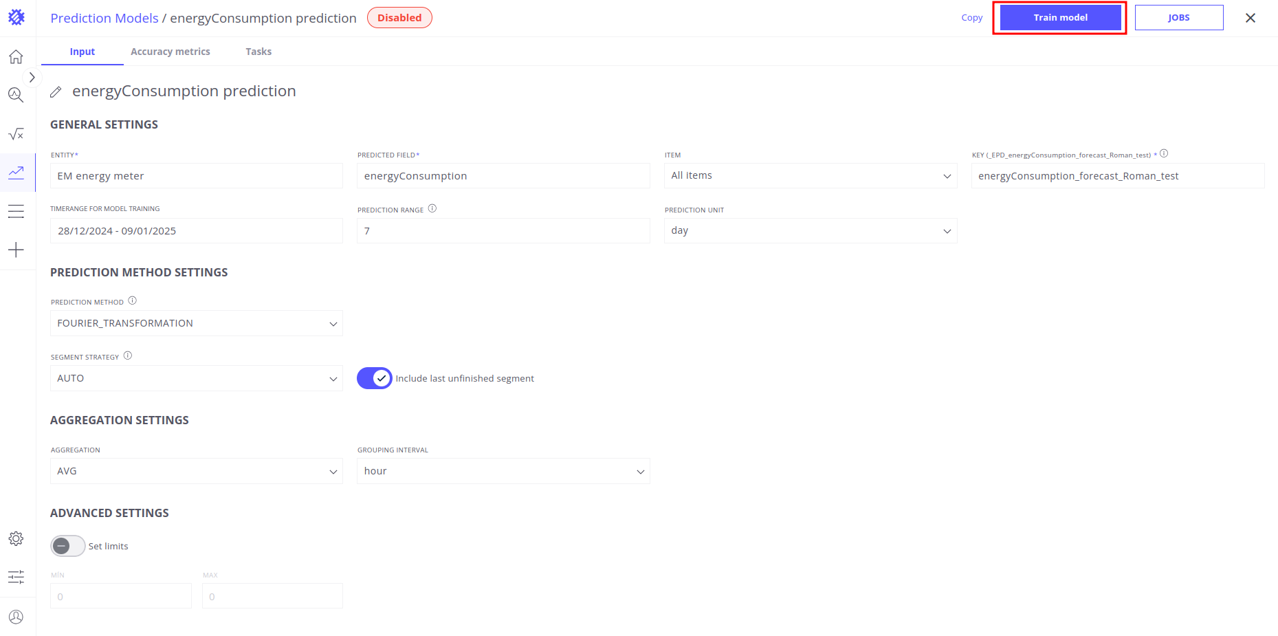 In the Advanced Settings of the prediction model configuration, you can define limits for predicted telemetry values. To enable this feature and instruct the model to restrict predictions within specific bounds, follow these steps:
