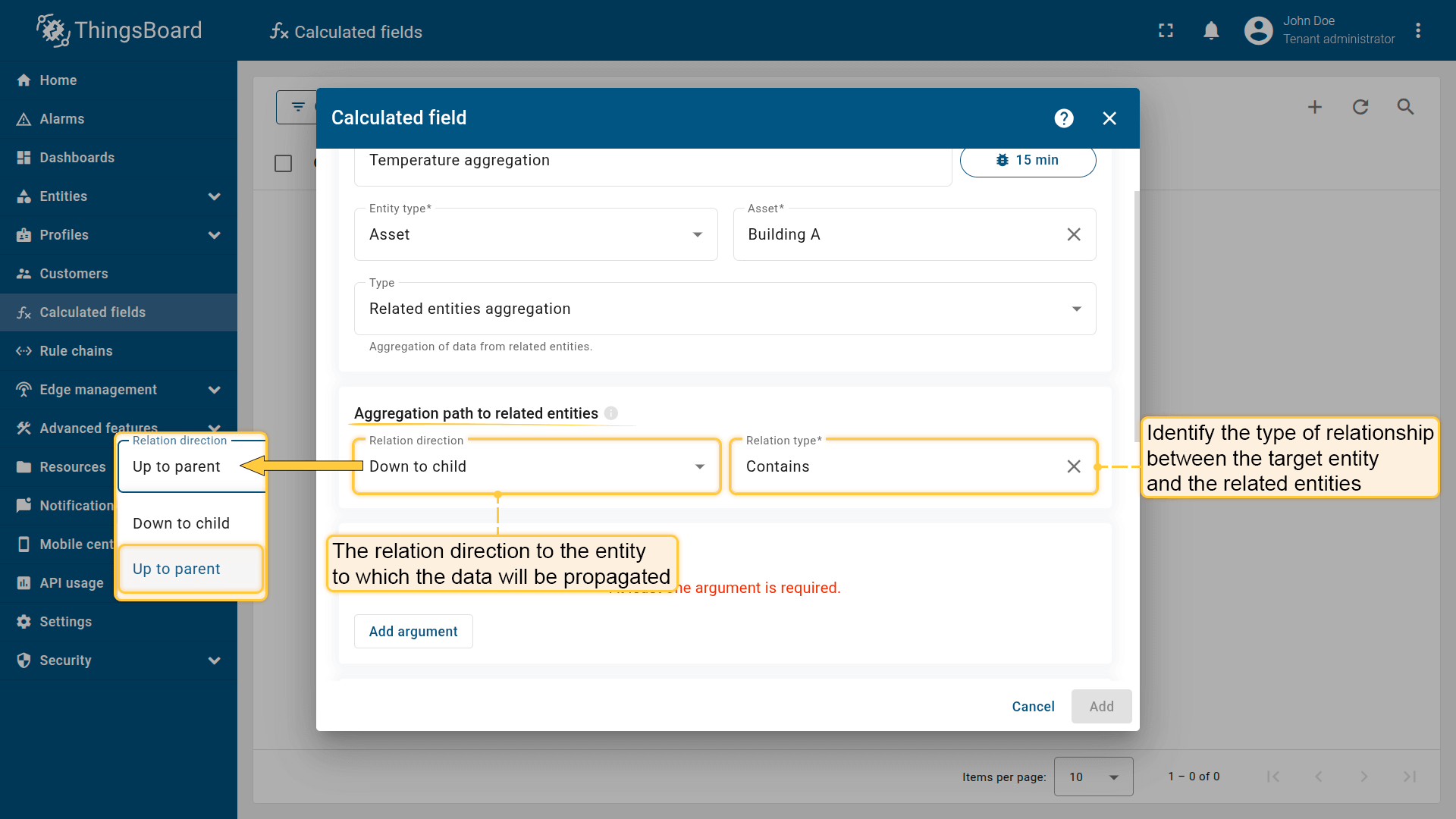 ThingsBoard will collect data for aggregation from all entities that match the selected relationship direction and relationship type.
