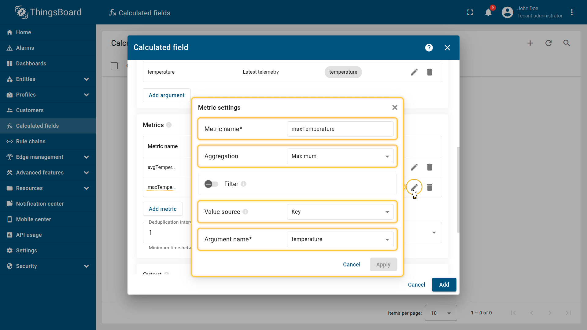 select the Argument type (2), specify the Time series key / Attribute key (3) to read data from, enter the Argument name (4) that will be used in the metrics, and set the Default value (5).