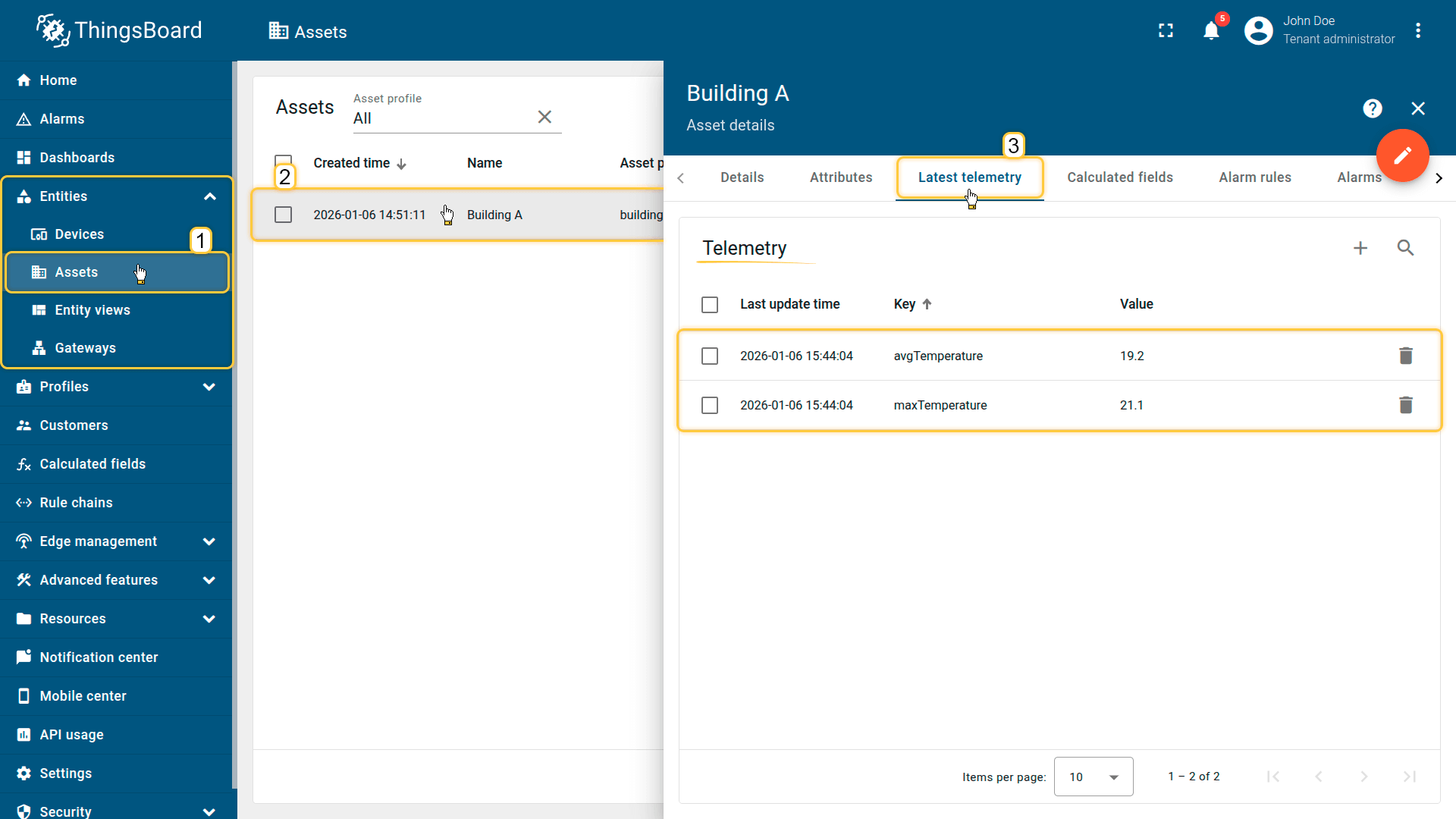 将两个值作为“遥测”存储在“Building A”资产上。