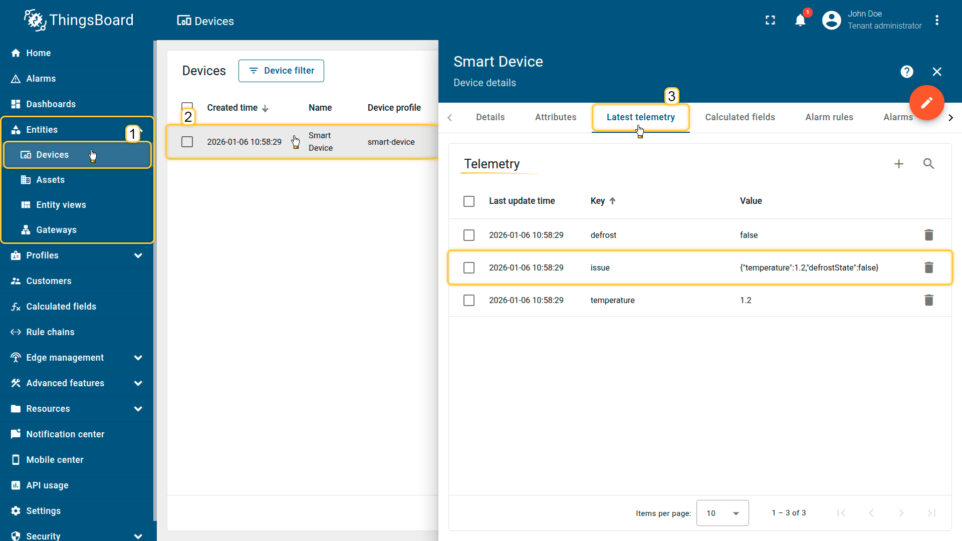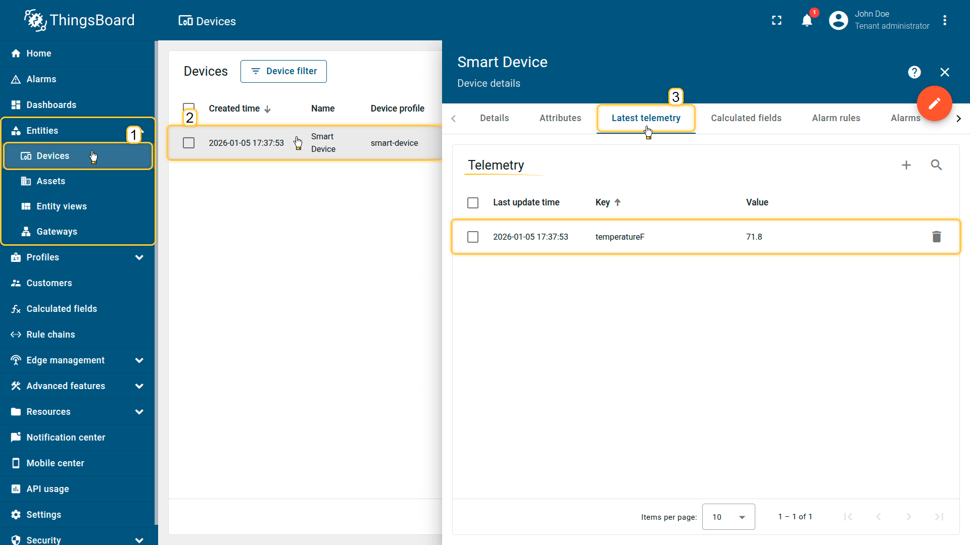 导入的“Smart Device”设备将“temperature”发布为遥测数据。