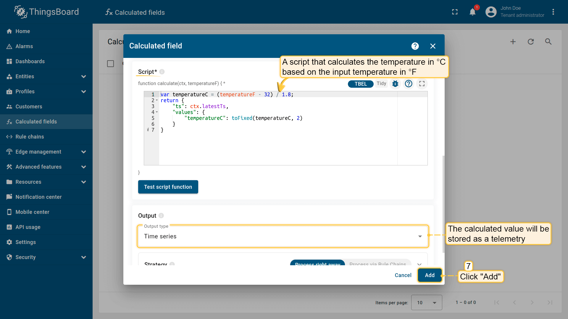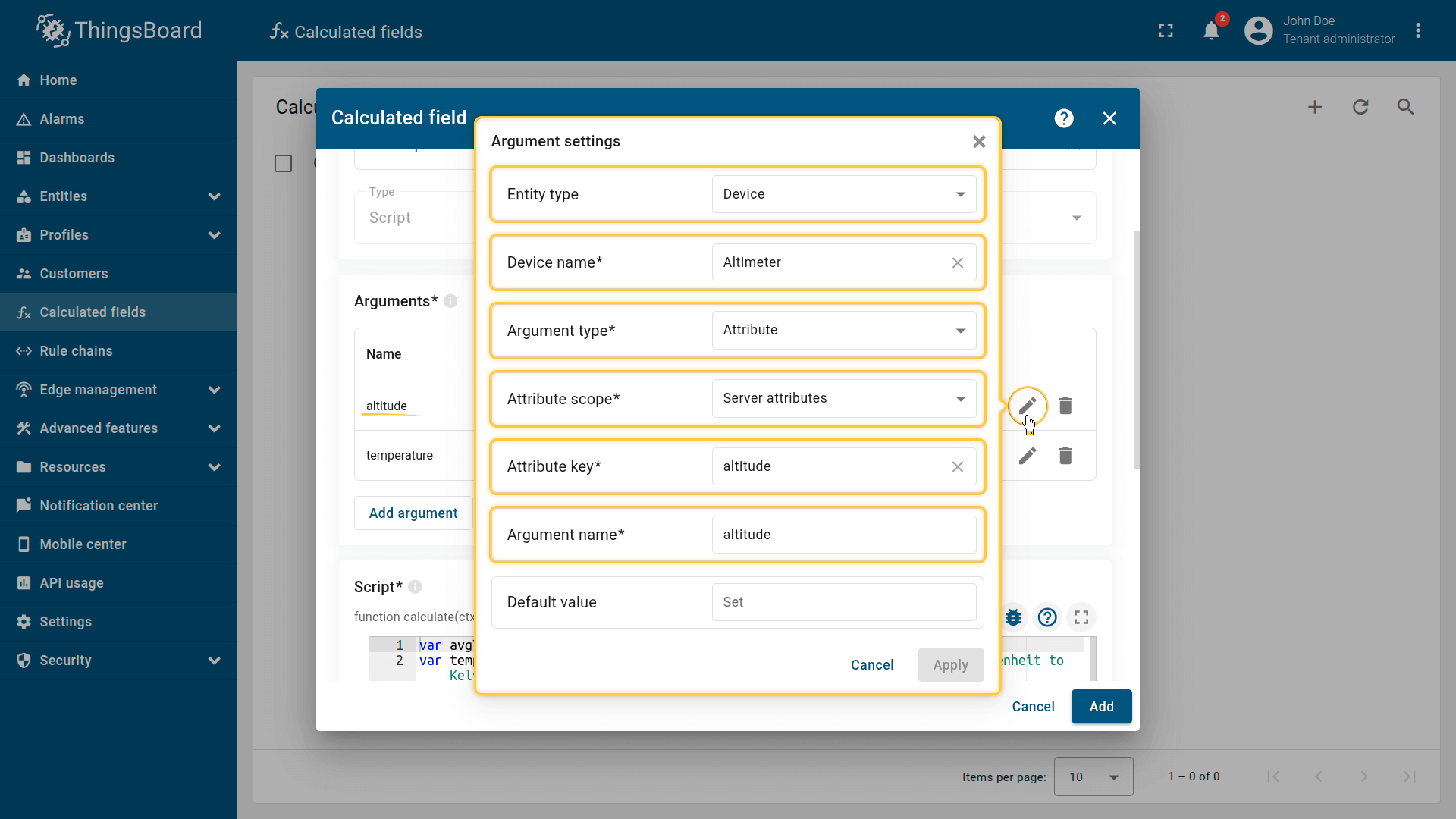 Arguments定义传入脚本的数据源和key。Script字段计算的arguments可为 Latest telemetry、Attribute 或 time series rolling。