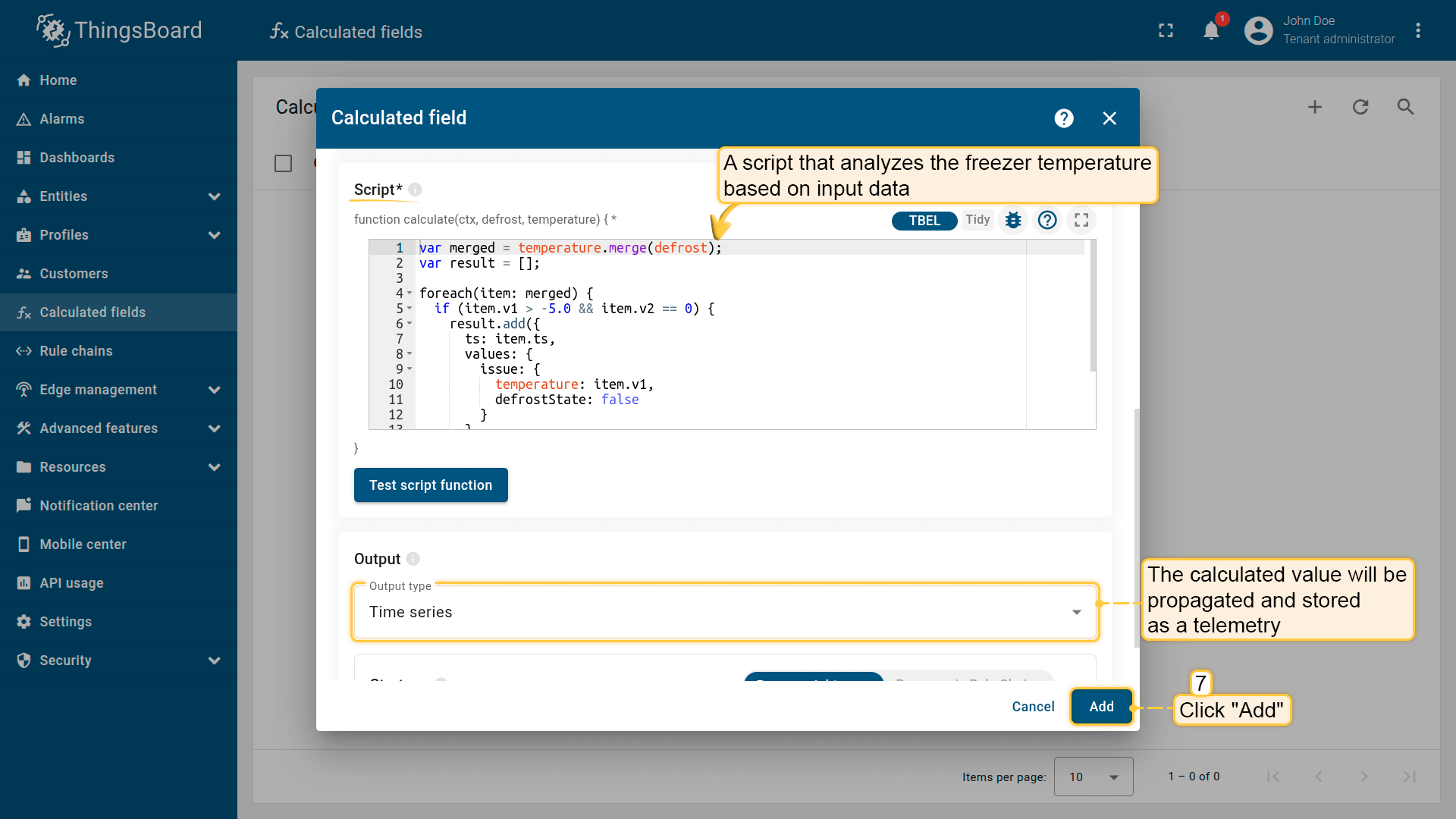 Script字段计算使用 TBEL(ThingsBoard Expression Language)对遥测与属性执行高级实时计算。与Simple字段不同,Script字段支持条件逻辑、对滚动时序值的迭代、历史窗口处理,以及单次执行返回多个结果。