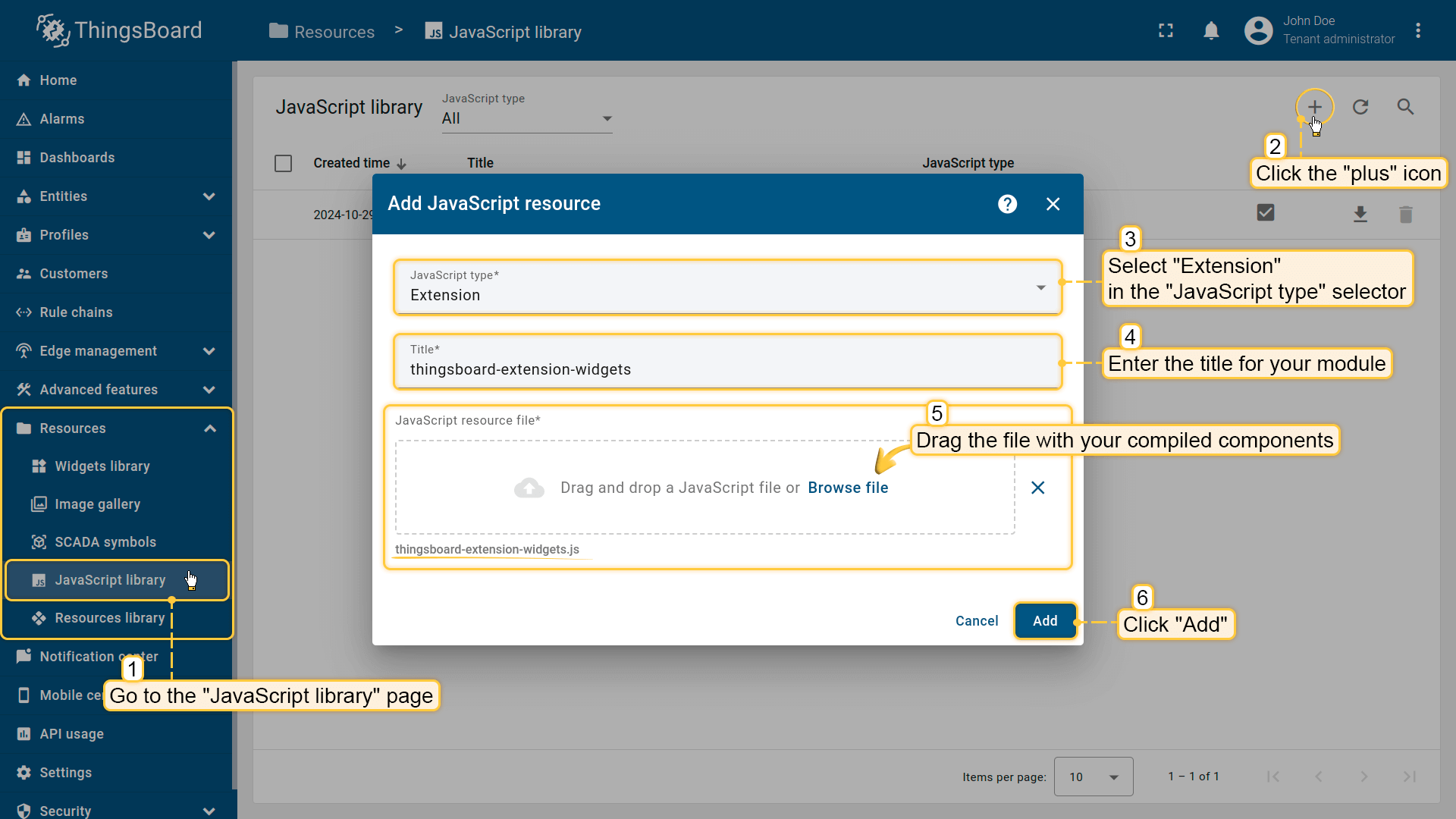 首先需要准备包含已编译组件的文件。默认文件名为 thingsboard-extension-widgets.js。创建该文件的说明请参阅 ThingsBoard extensionsREADME 文件。