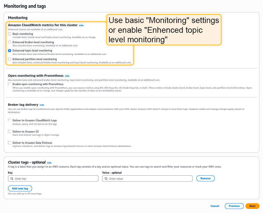 - 打开 AWS 控制台,前往 MSK,点击“创建集群”按钮。