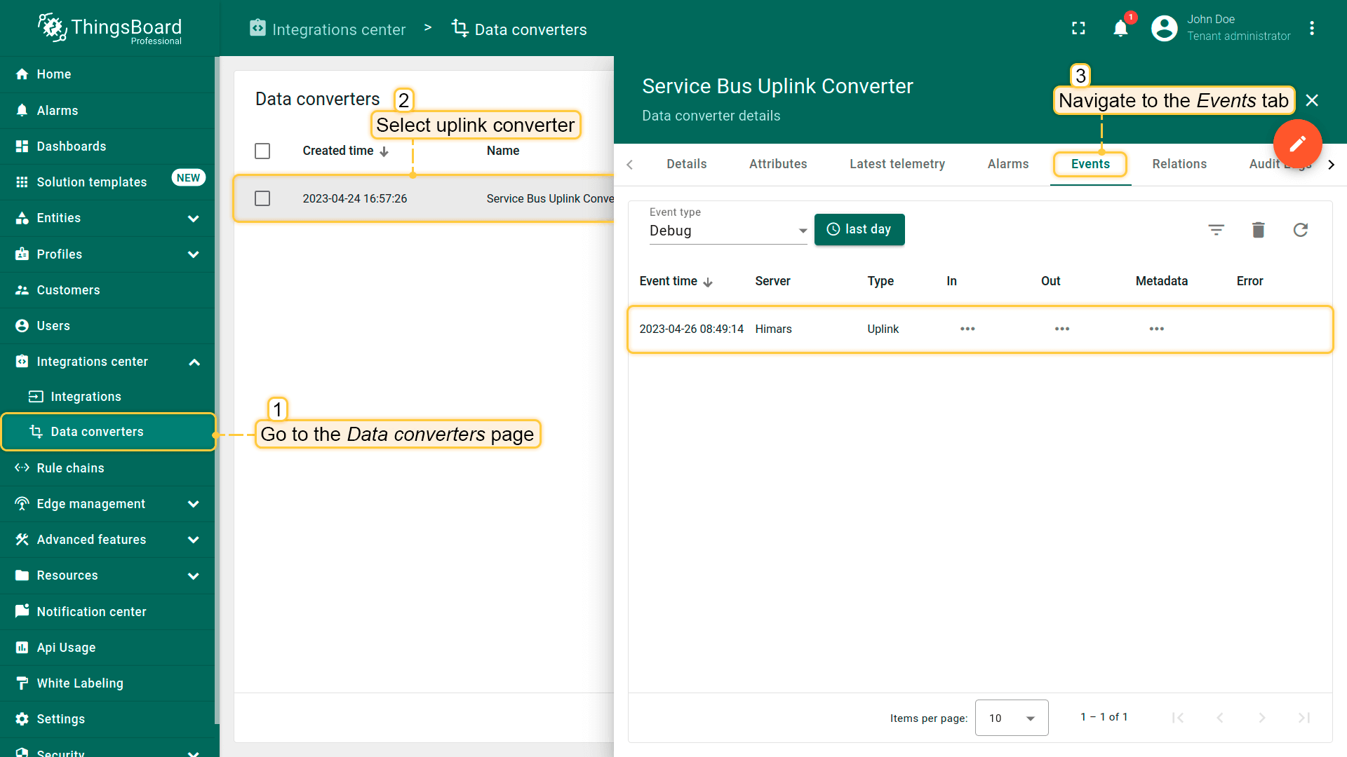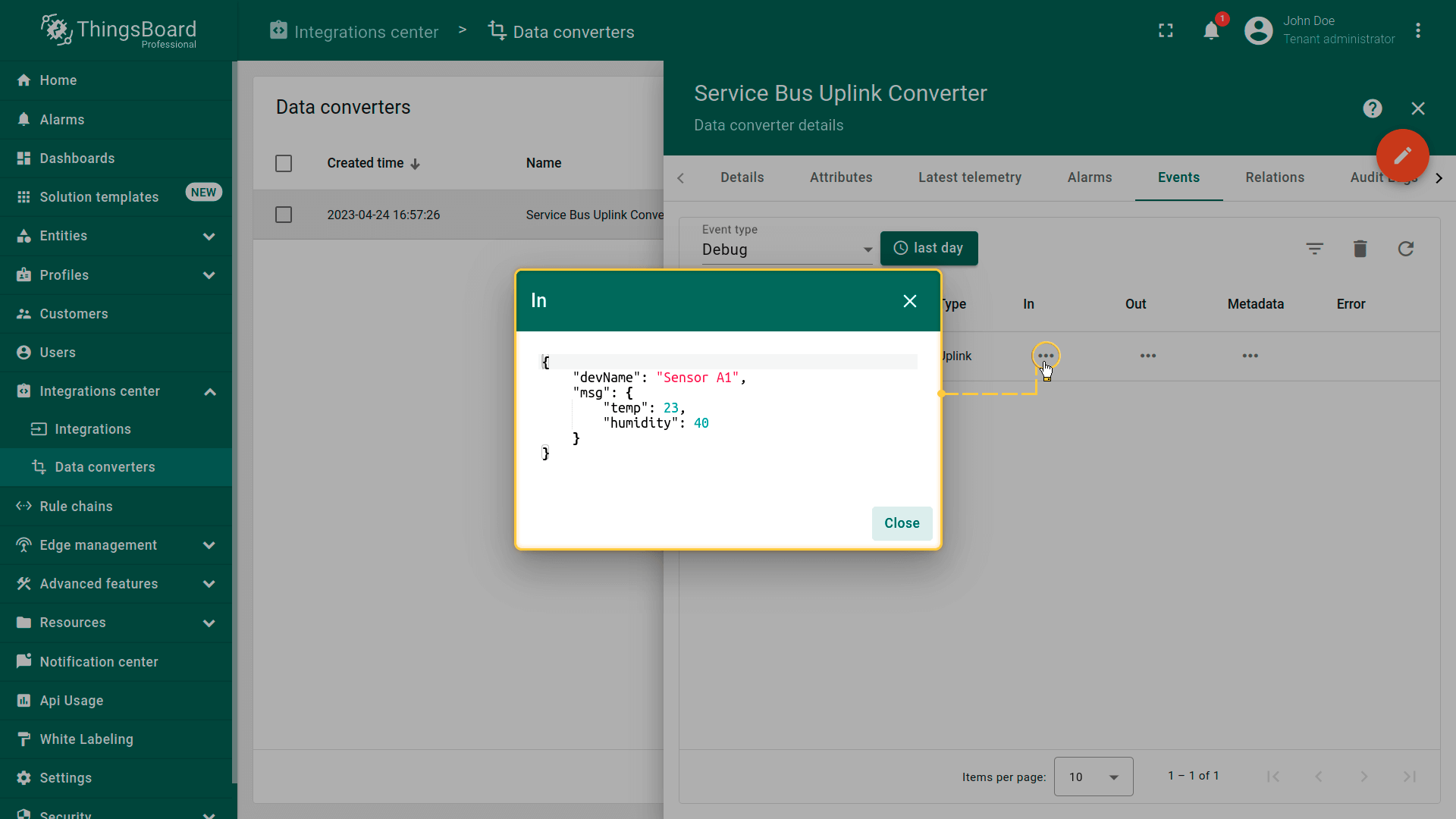接收到的数据可以在上行转换器中查看。在“Events”选项卡的“In”和“Out”区域中: