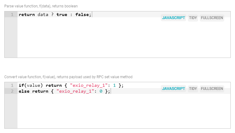 In Convert value function enter following code for changing switch state. Data is published to topic v1/devices/me/request+.