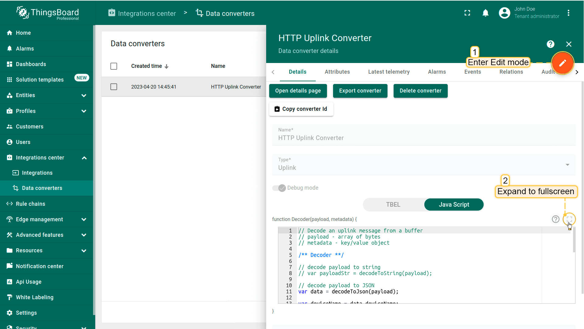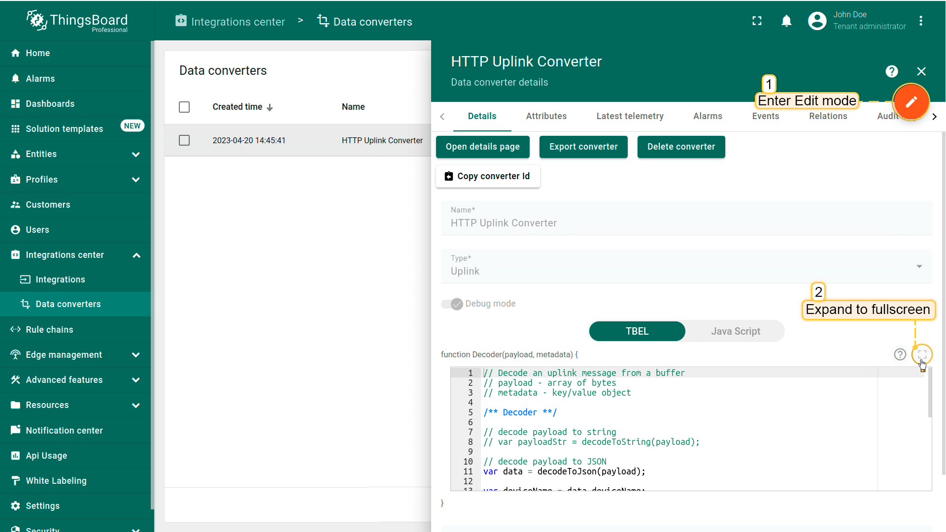 创建集成前,需在Data converters中创建上行转换器。上行转换器用于将设备入站数据转换为ThingsBoard展示所需的格式。