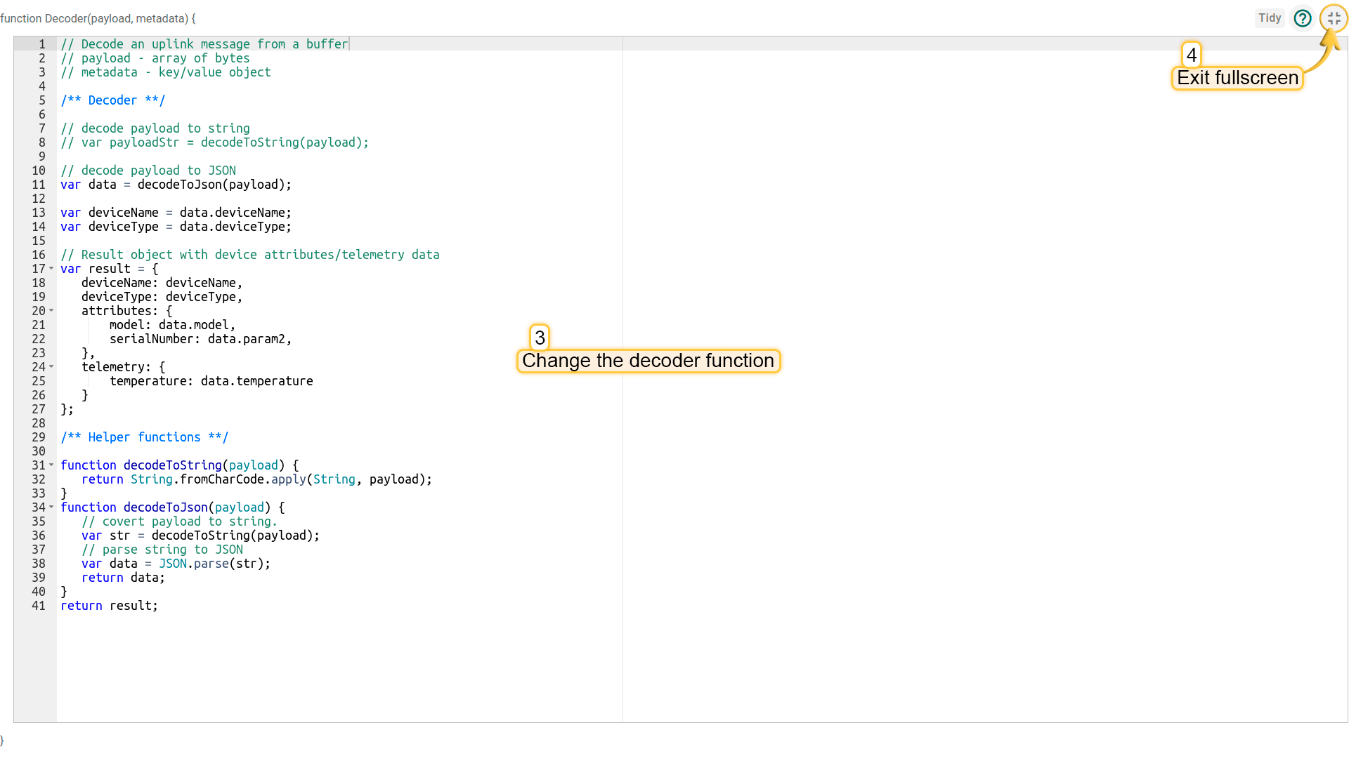 Let’s consider an example where we send an attribute update message. So we should change code in the downlink encoder function under line //downlink data input: