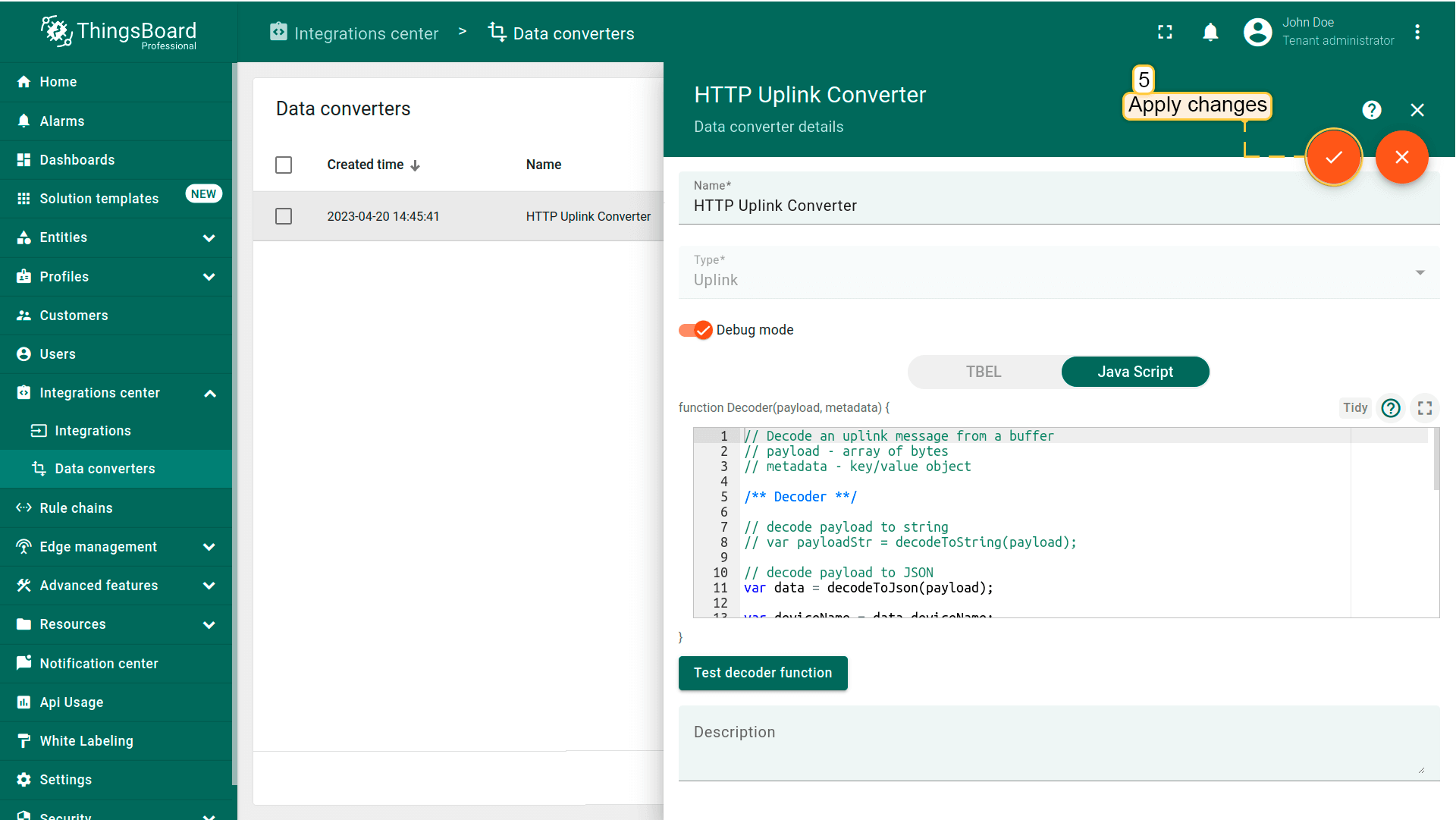 复制 converter 的配置示例(或您自己的配置)并插入到 decoder function 中。点击「勾选」图标保存更改。