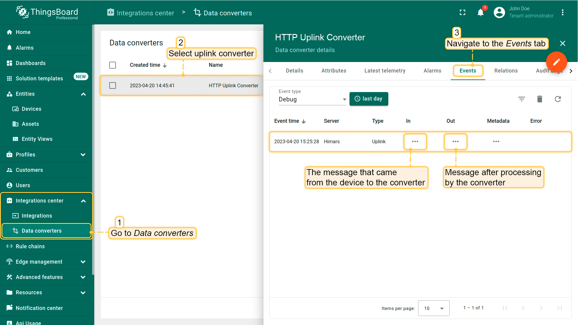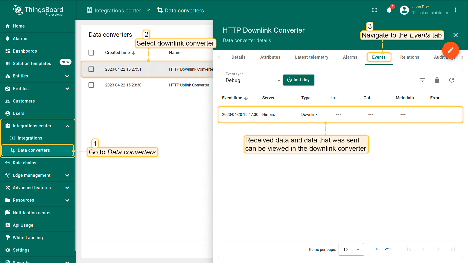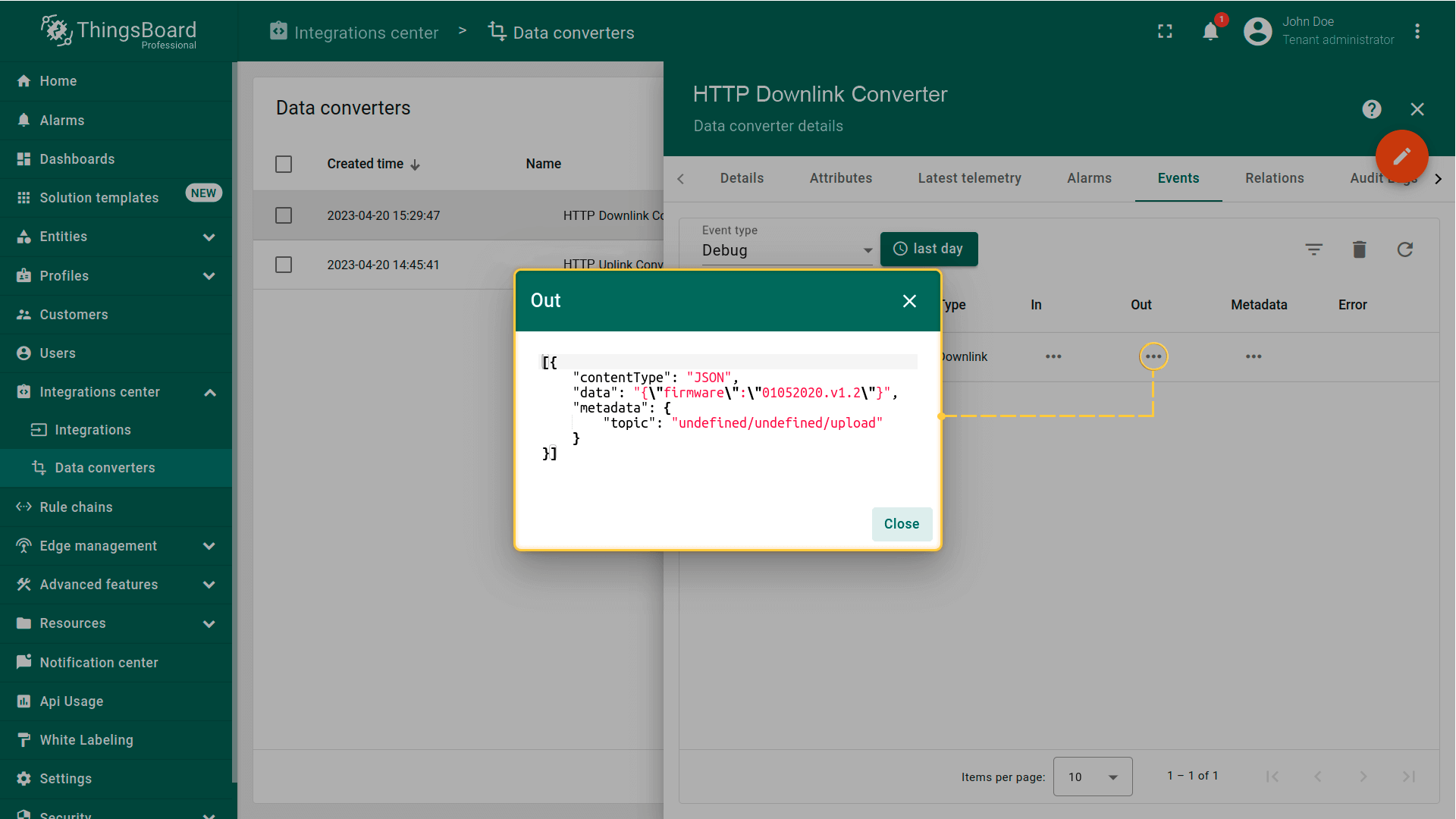 在“Data converters ”页面创建下行转换器。要查看事件请启用“Debug mode”。