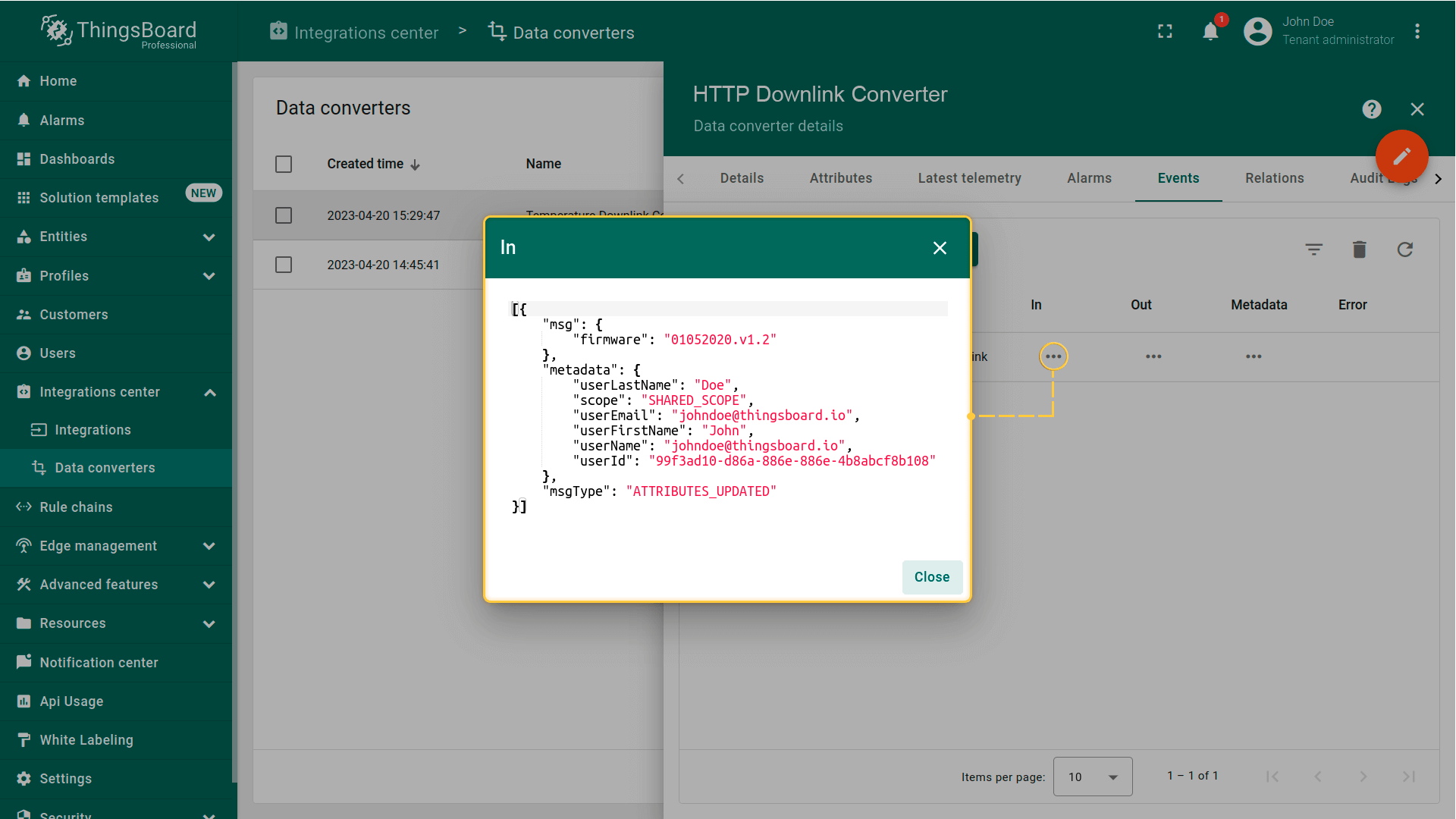 接收和发送的数据可在下行转换器查看。Events标签的“In”块显示入站数据,“Out”字段显示发给设备的消息: