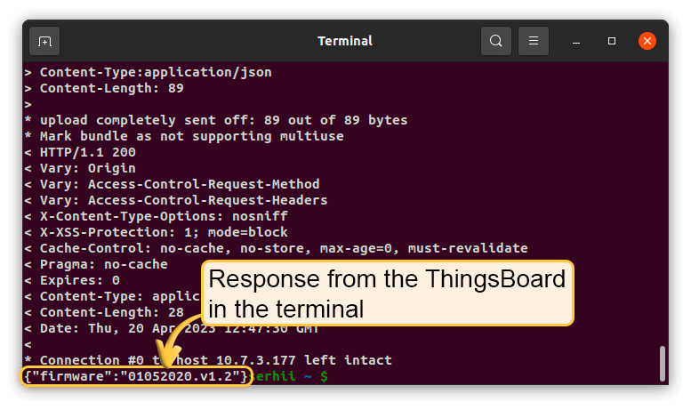 再次发送上行消息。终端中会收到ThingsBoard的响应: