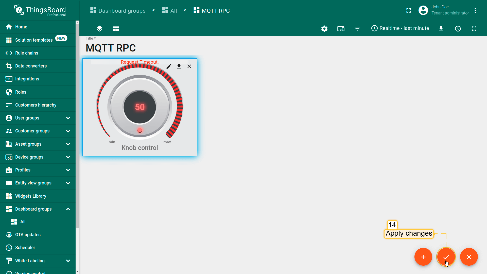 Go to Dashboard Groups -> All section and create a new dashboard named MQTT RPC. Open the dashboard add an alias by clicking on Entity Aliases icon on the top-right.