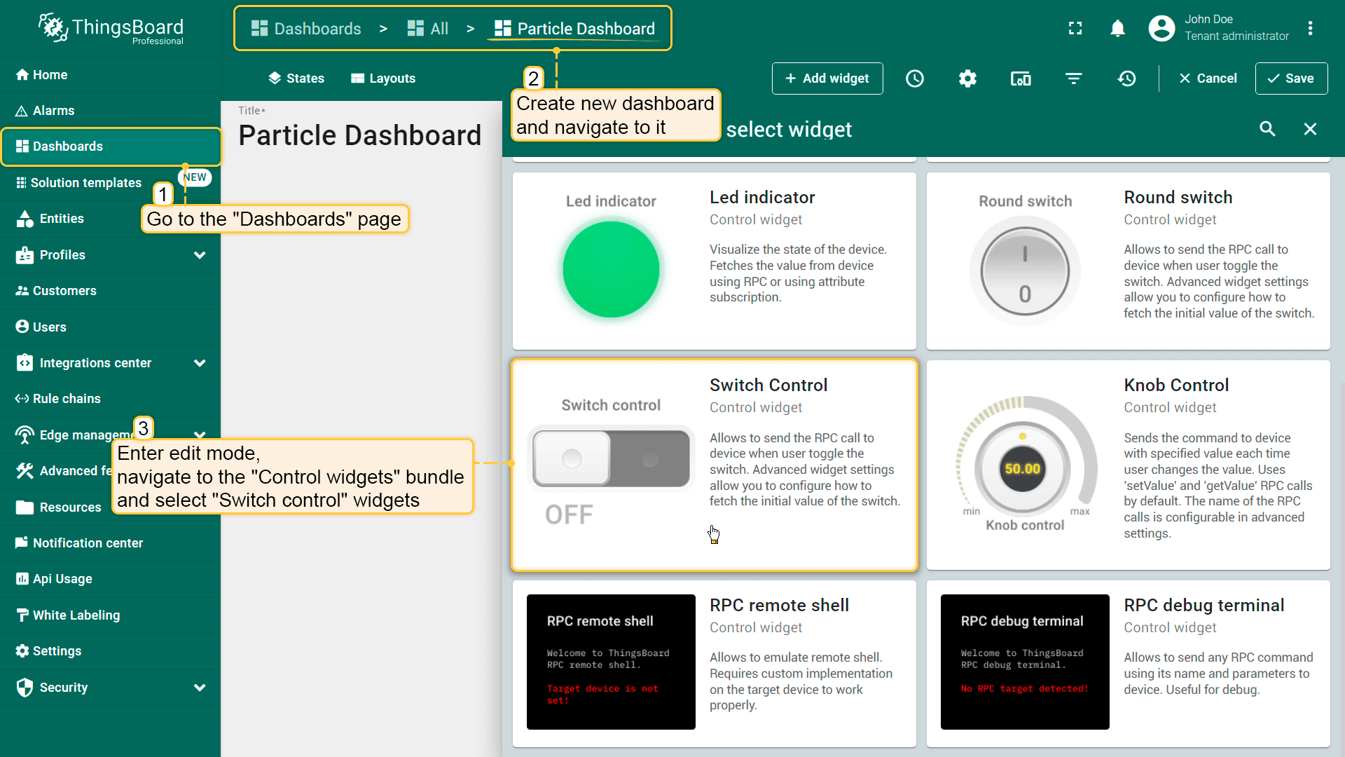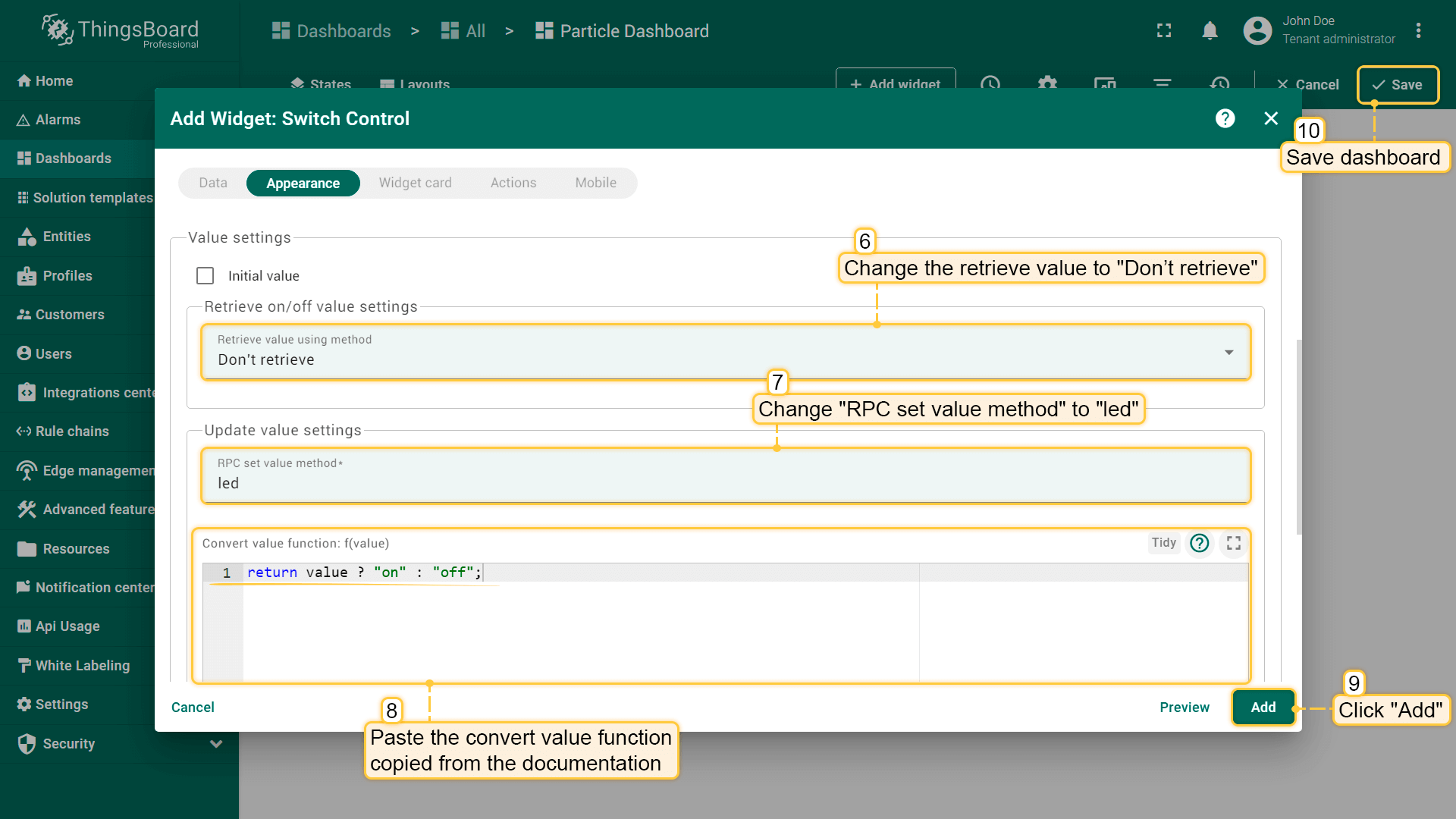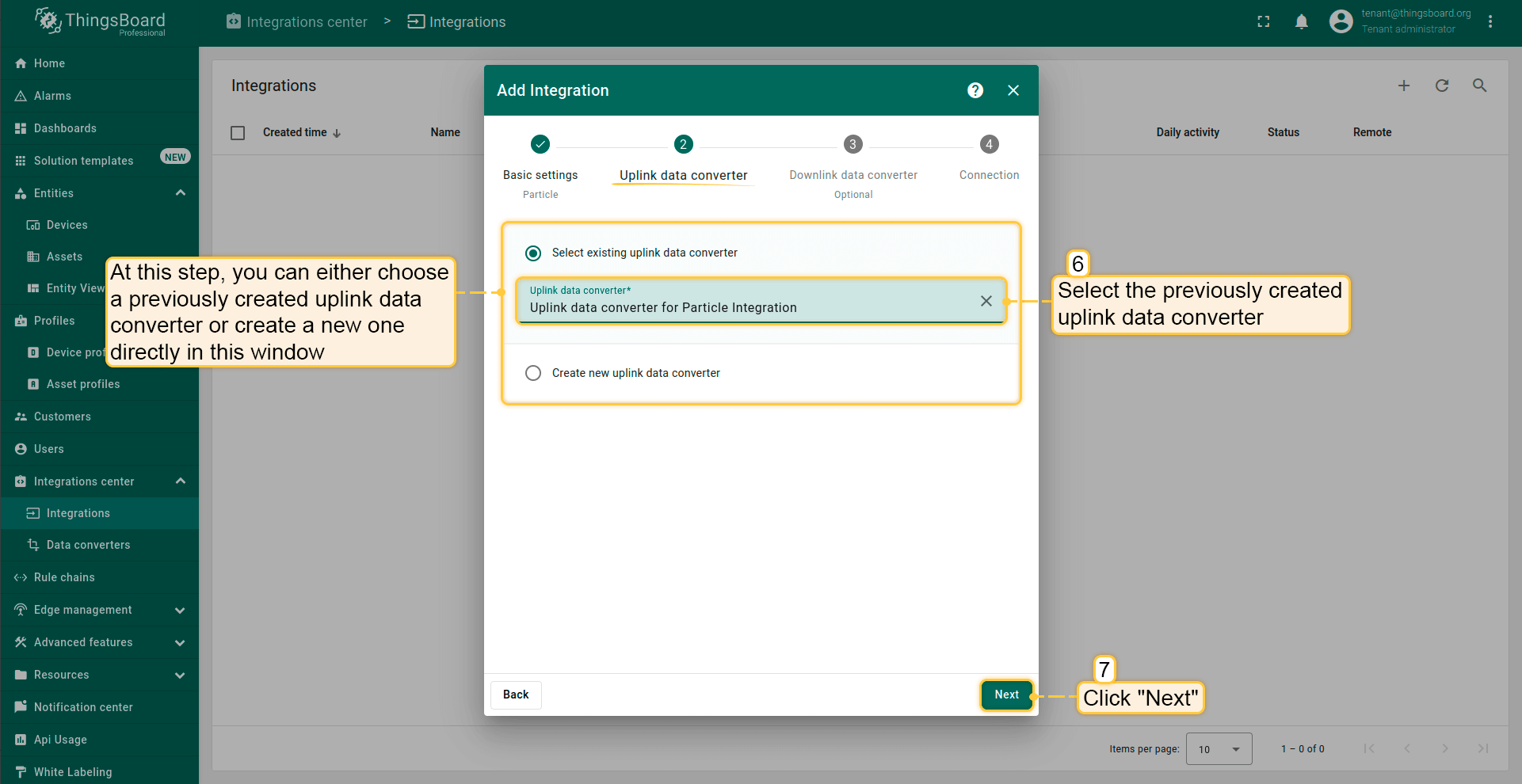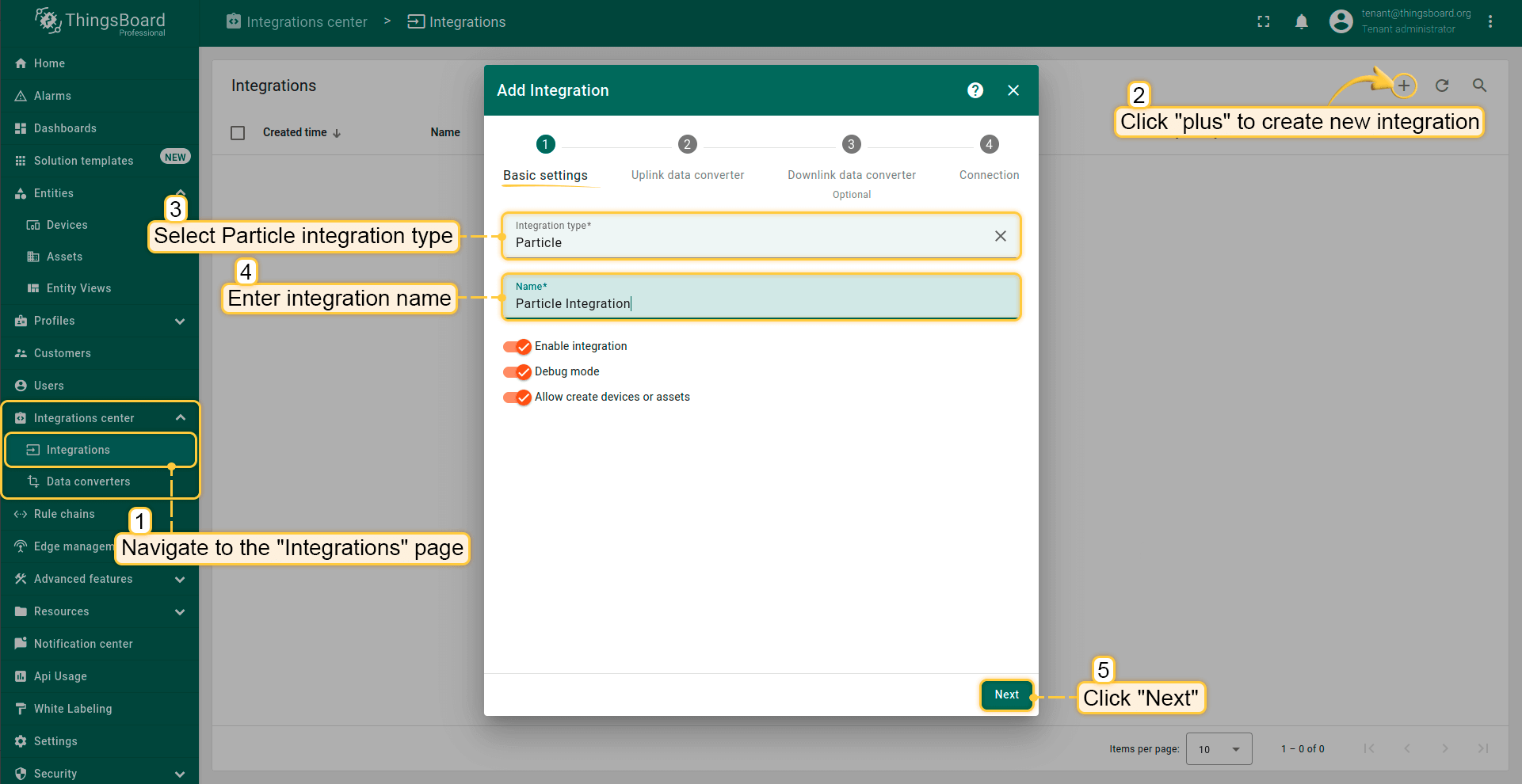 要创建上行数据转换器,请进入Data Converters页面,点击Add new data converter -> Create new converter,将其命名为“Uplink data converter for Particle Integration”,并选择类型为Uplink。目前请使用调试模式。