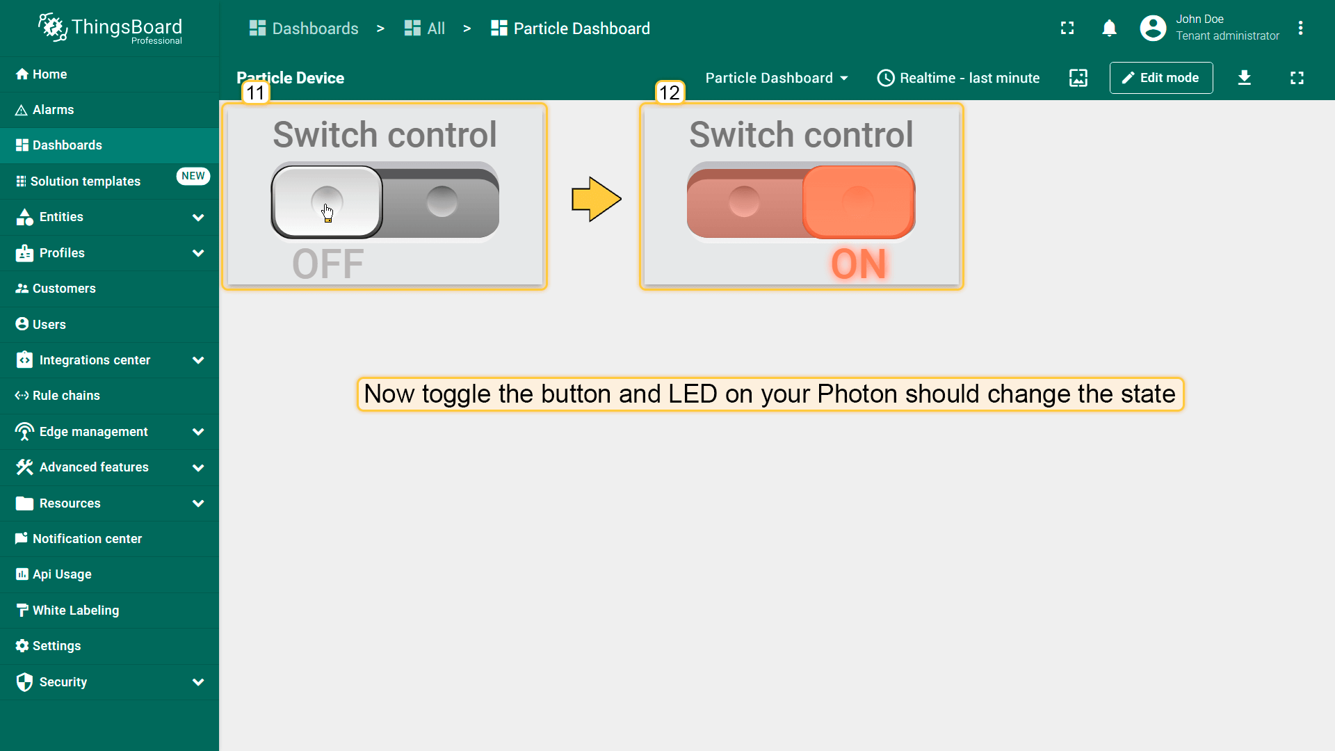 // Decode an uplink message from a buffer// payload - array of bytes// metadata - key/value object/** Decoder **/// decode payload to JSONvardata=decodeToJson(payload);if(data.coreid!="api"){vardeviceName=data.coreid;vardeviceType='Photon';vargroupName='Particle devices';varattributes={integrationName:metadata['integrationName']};vartelemetry={};if(data.data=='online'||data.data=='offline'){attributes.status=data.data;}else{telemetry.rawData=data.data;}// Result object with device/asset attributes/telemetry datavarresult={// Use deviceName and deviceType or assetName and assetType, but not both.deviceName:deviceName,deviceType:deviceType,groupName:groupName,attributes:attributes,telemetry:telemetry};/** Helper functions 'decodeToString' and 'decodeToJson' are already built-in **/returnresult;}/** Helper functions **/functiondecodeToString(payload){returnString.fromCharCode.apply(String,payload);}functiondecodeToJson(payload){// covert payload to string.varstr=decodeToString(payload);// parse string to JSONvardata=JSON.parse(str);returndata;}