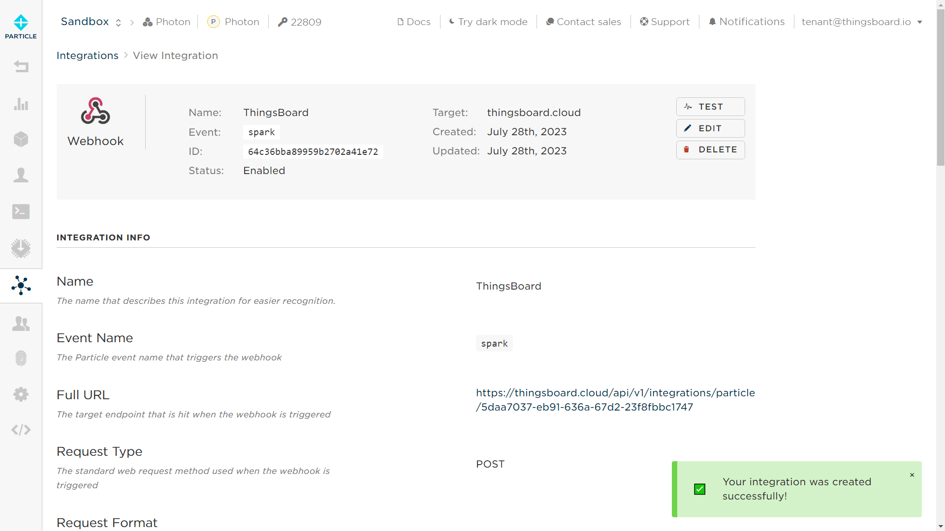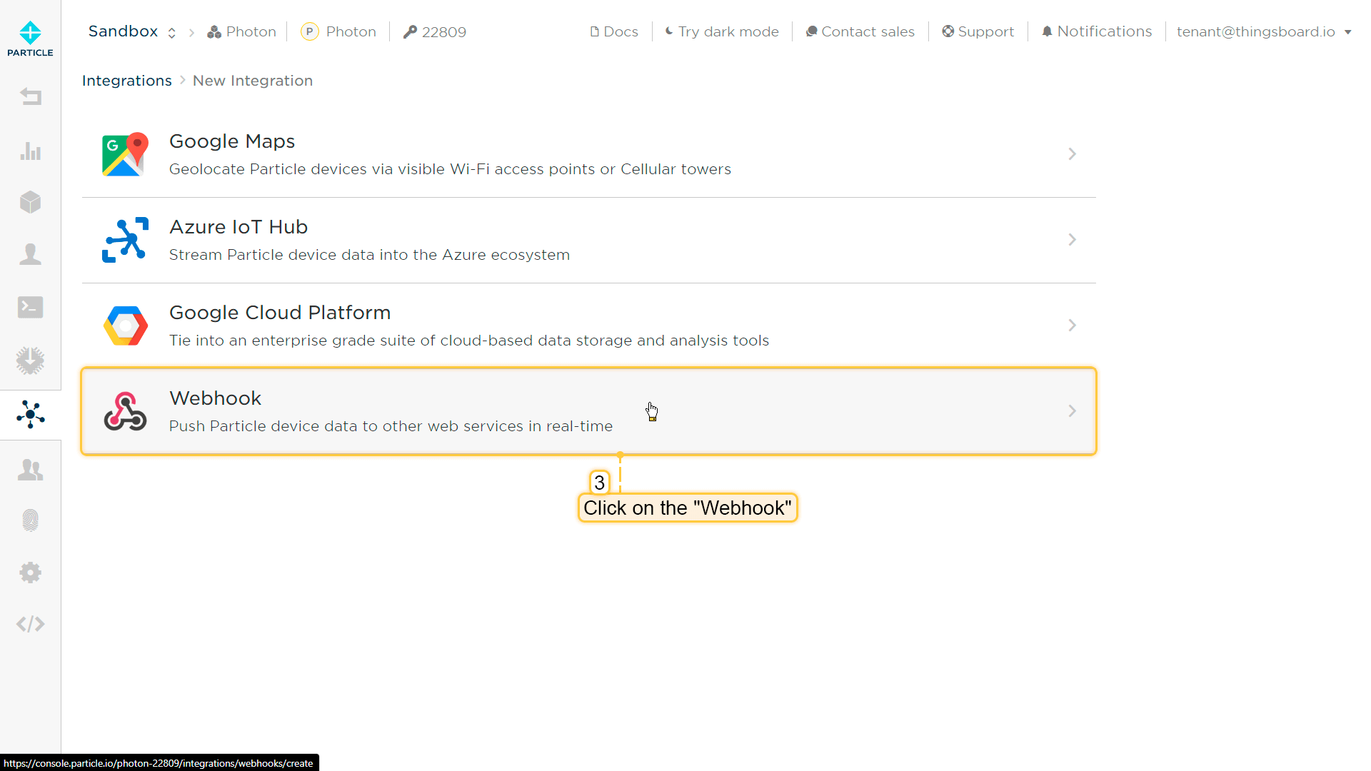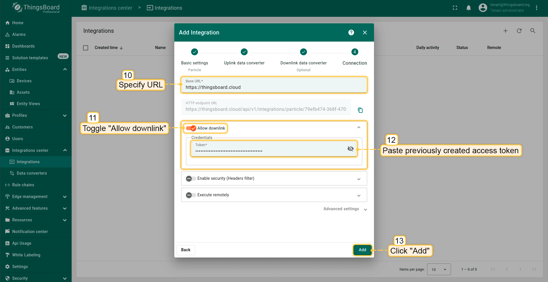 创建另一个转换器,命名为“Downlink data converter for Particle Integration”,类型选择Downlink。要查看事件,请启用调试模式。