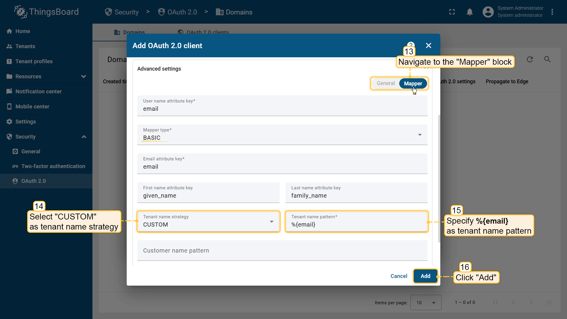 映射器配置是OAuth设置的关键部分,因为它控制自动租户/客户供应逻辑。 有关将外部用户信息映射到ThingsBoard用户的更多详细信息,请参见此处。
