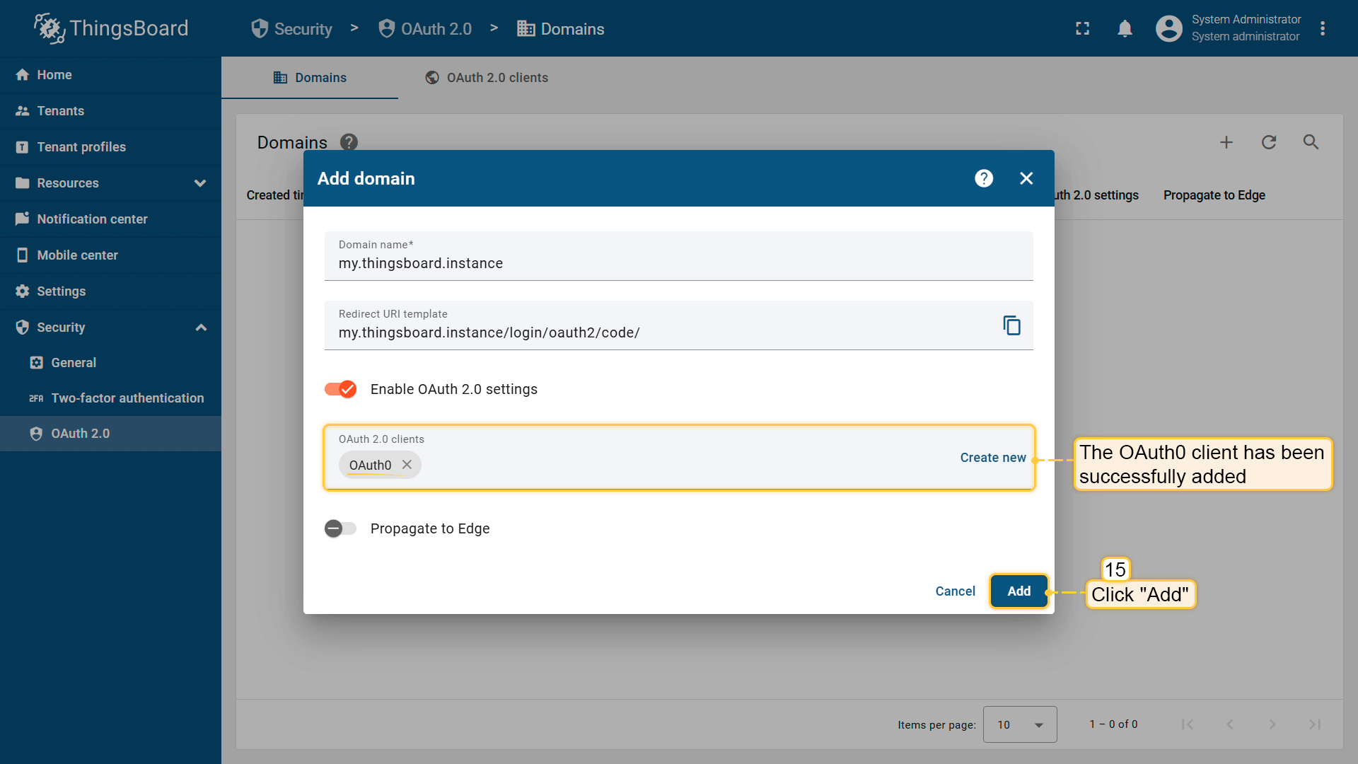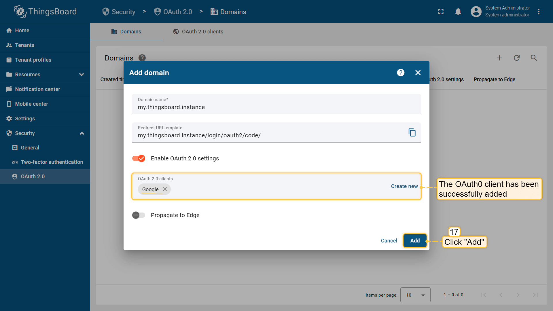 创建OAuth 2.0客户端后,您必须将其分配给域。 此步骤定义用户通过特定域访问ThingsBoard时,登录页面上将显示哪些认证提供商。
