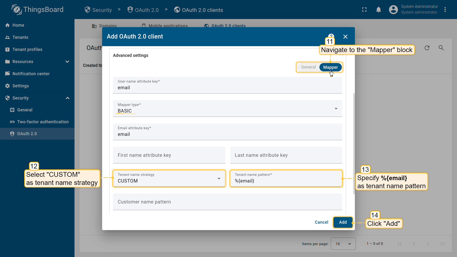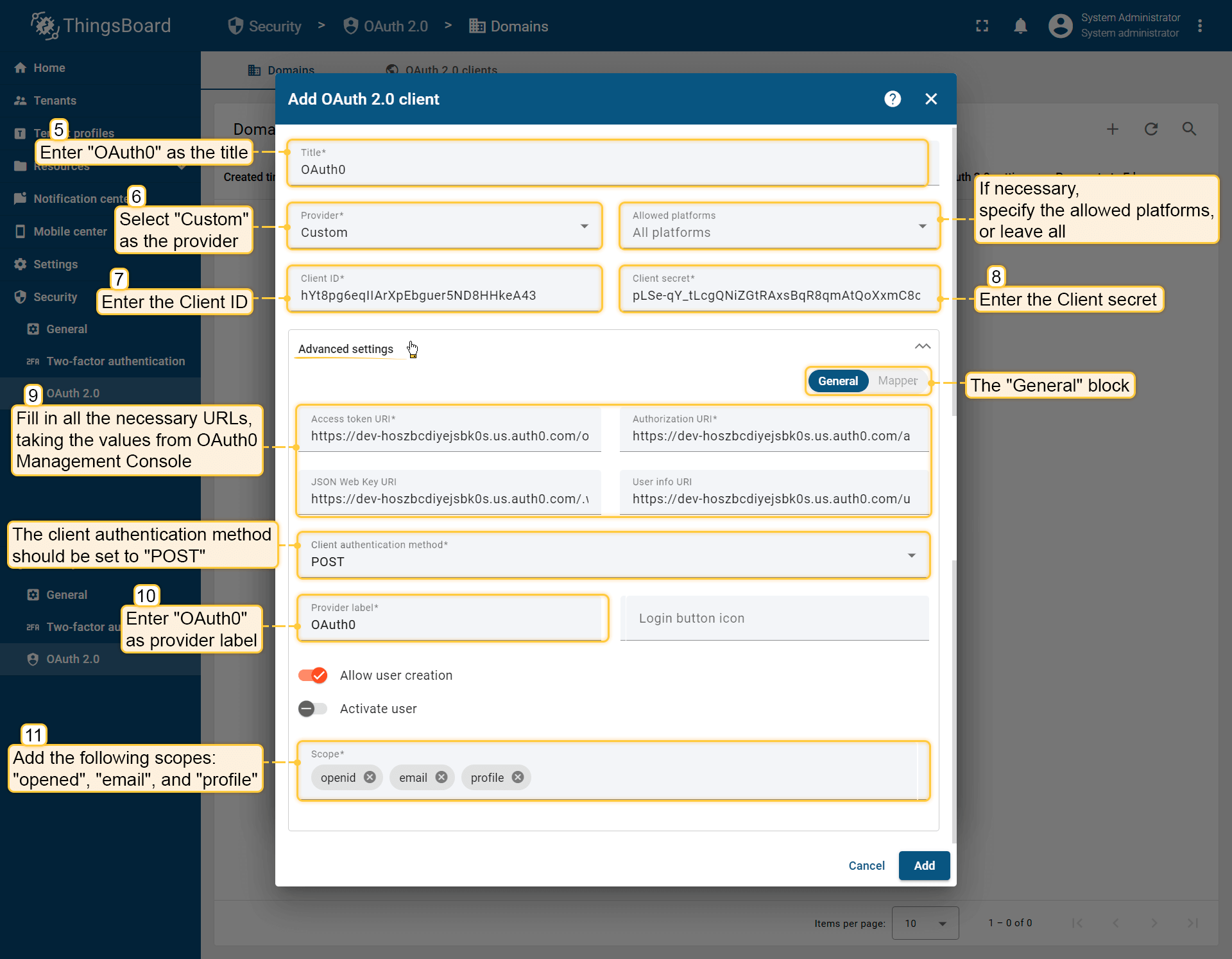 - 在ThingsBoard中添加对应的OAuth 2.0客户端,并配置所有必需的端点、scope和mapper设置。