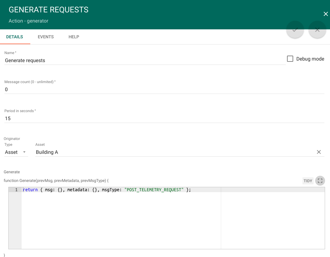 - Add the Generator node. This rule node Generates empty messages to trigger REST API calls.