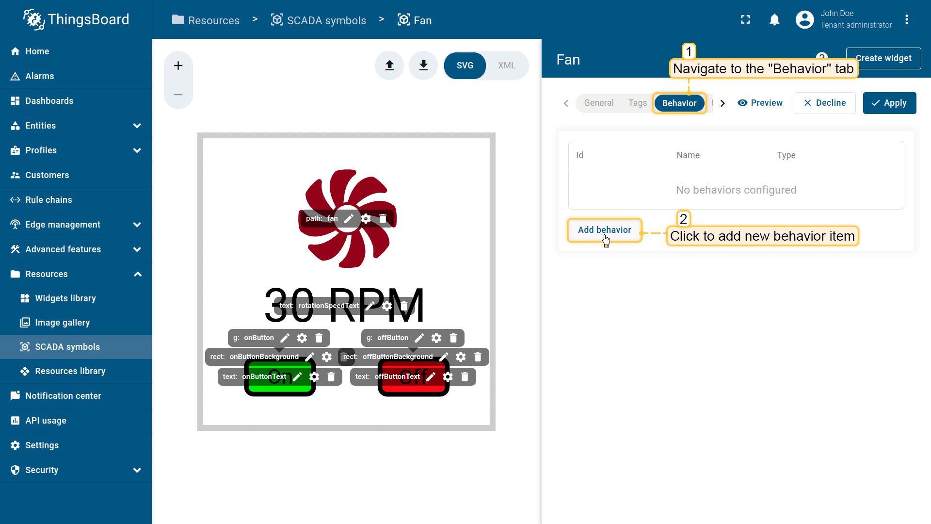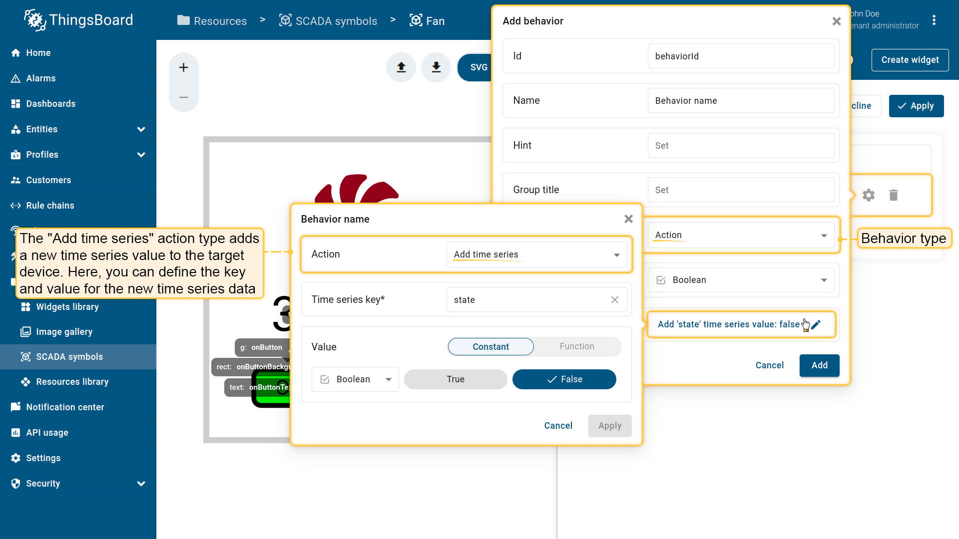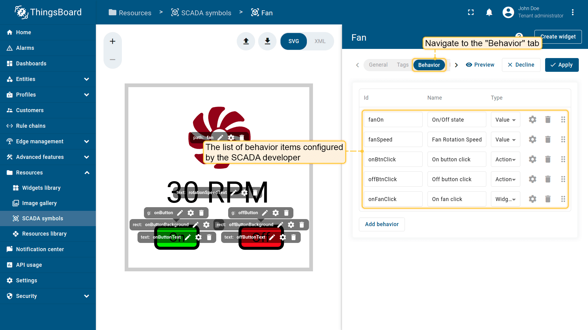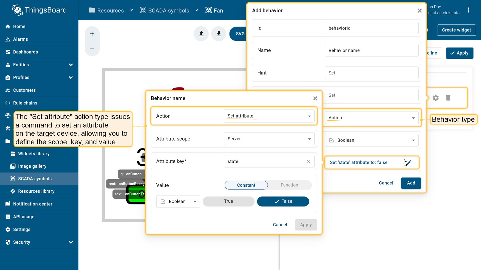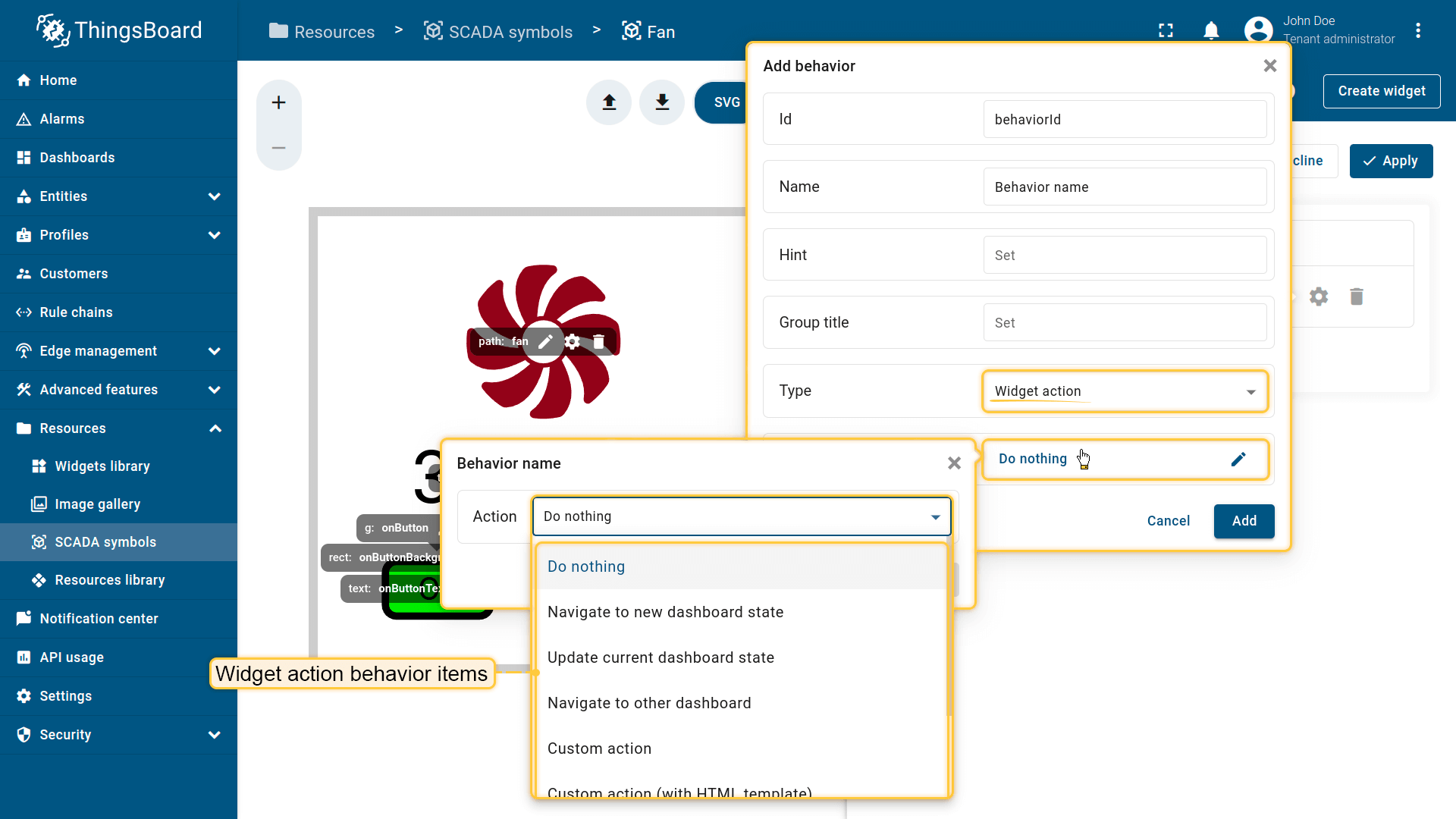Behavior:描述SCADA symbol如何从平台接收数据,以及其在device或dashboard上触发的操作;