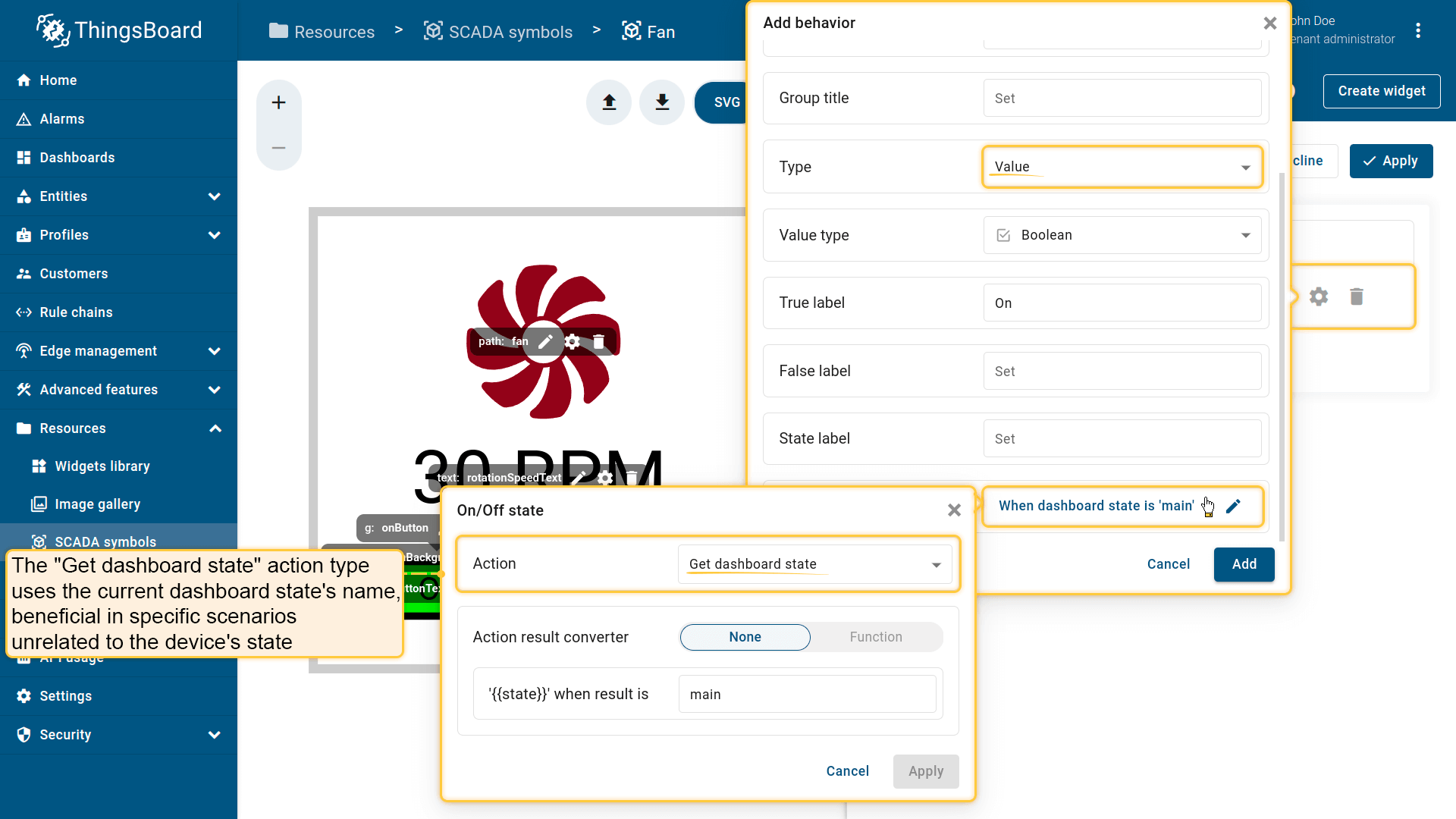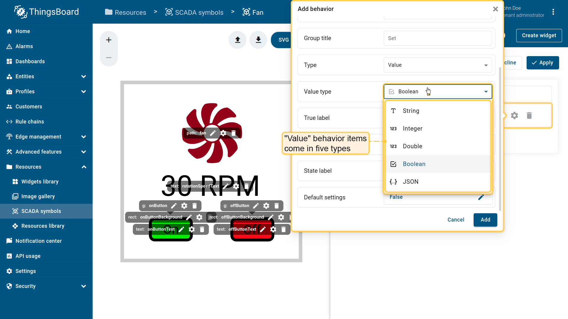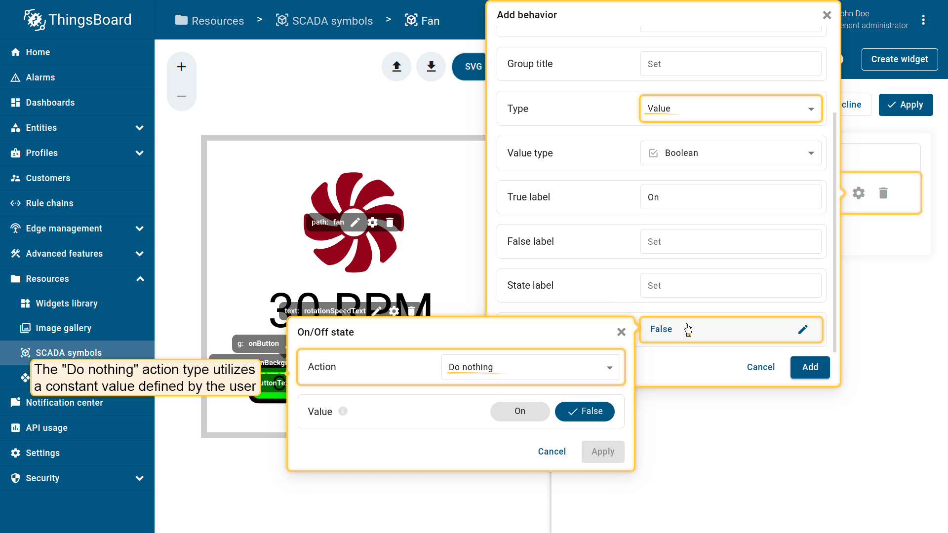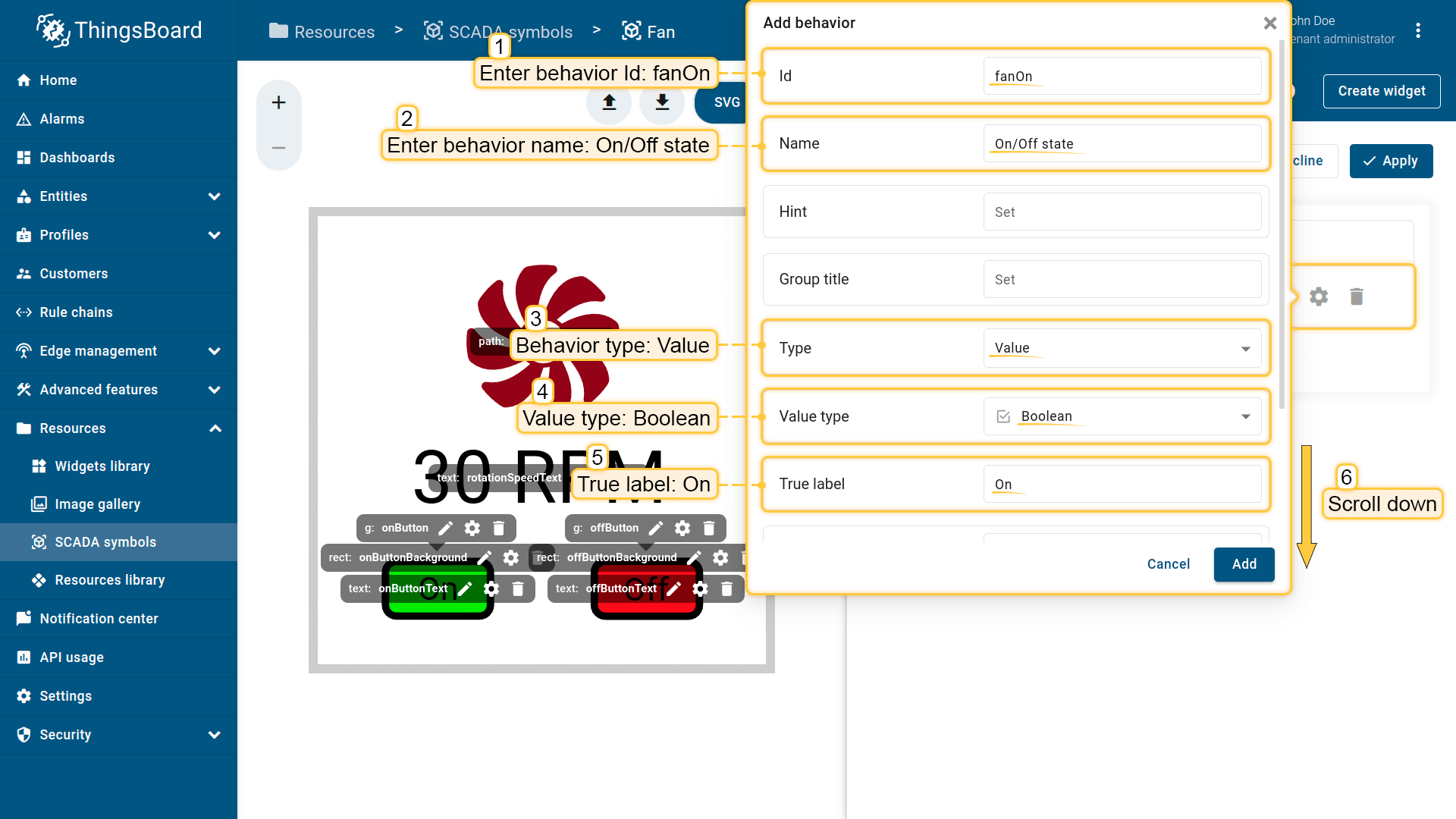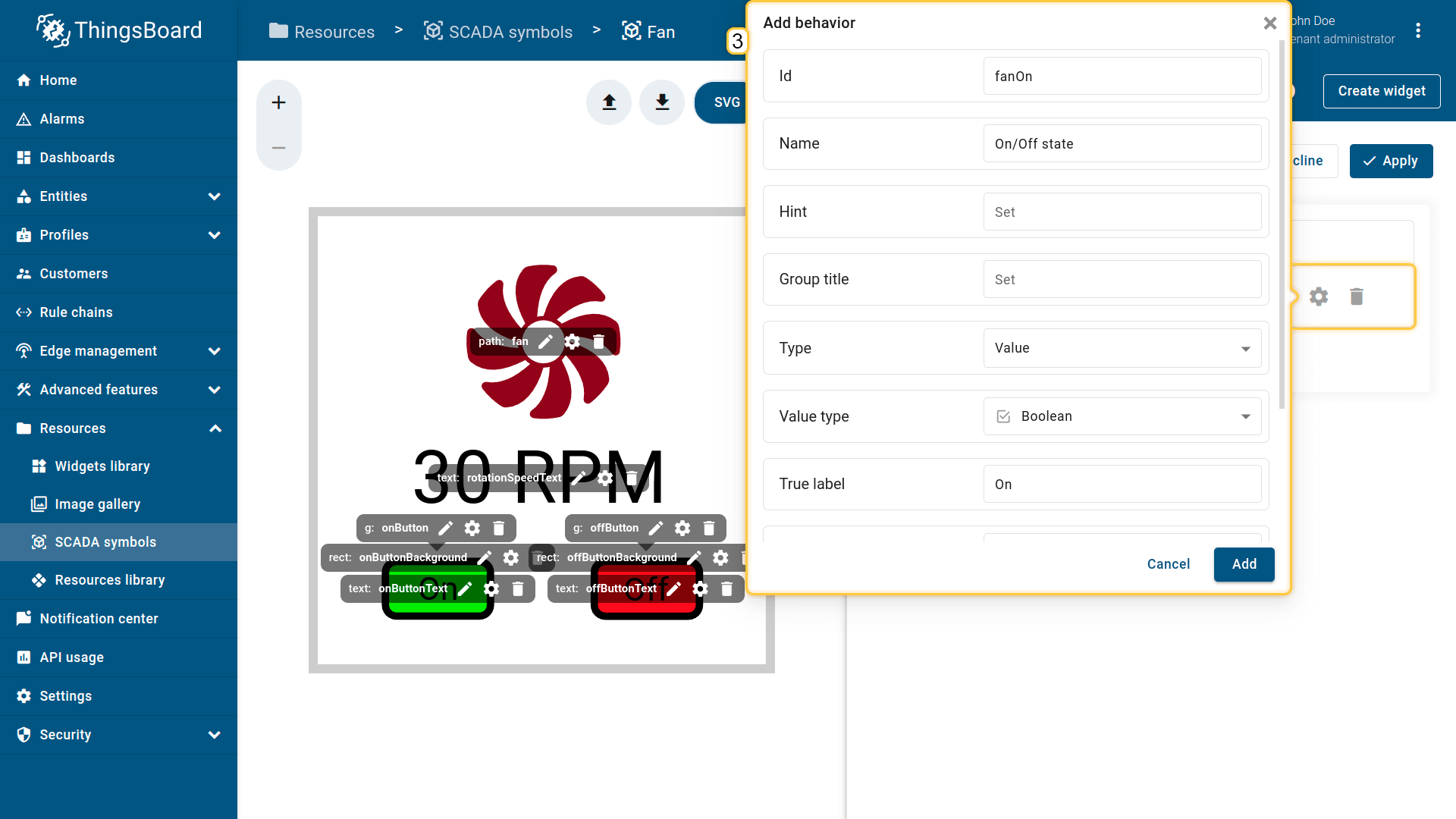Behavior:描述SCADA symbol如何从平台接收数据,以及其在device或dashboard上触发的操作;