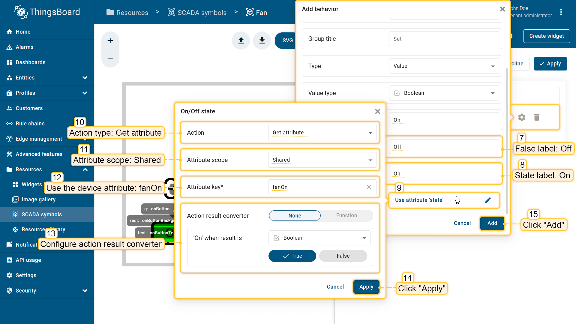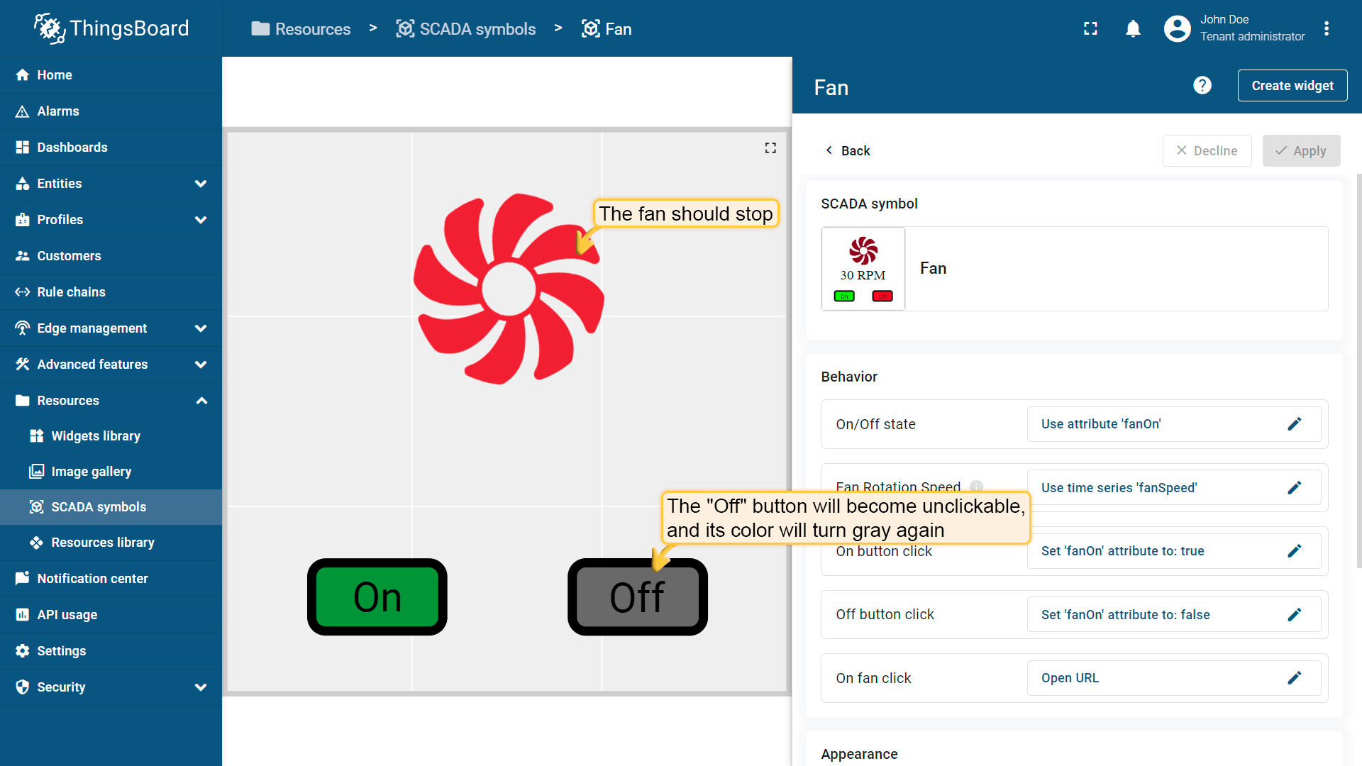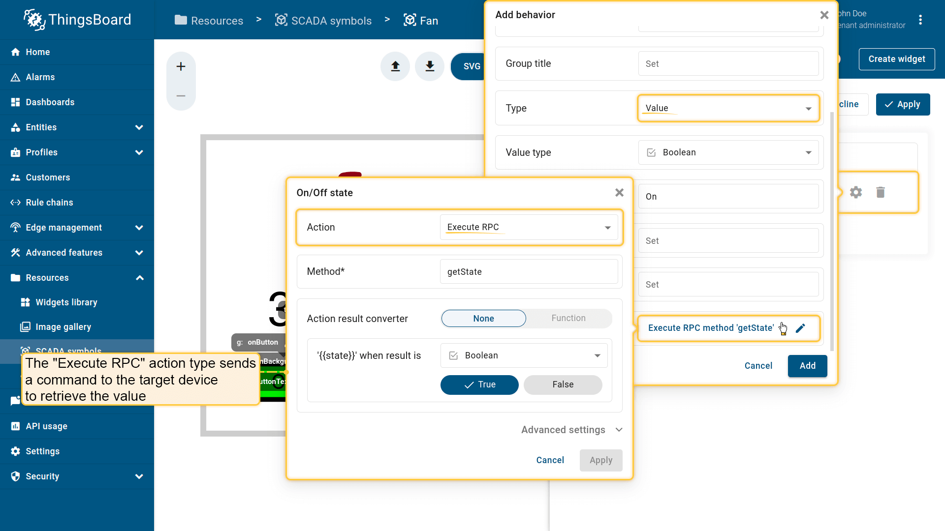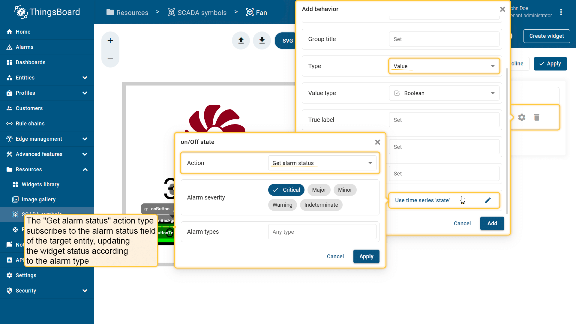 Behavior:描述SCADA symbol如何从平台接收数据,以及其在device或dashboard上触发的操作;