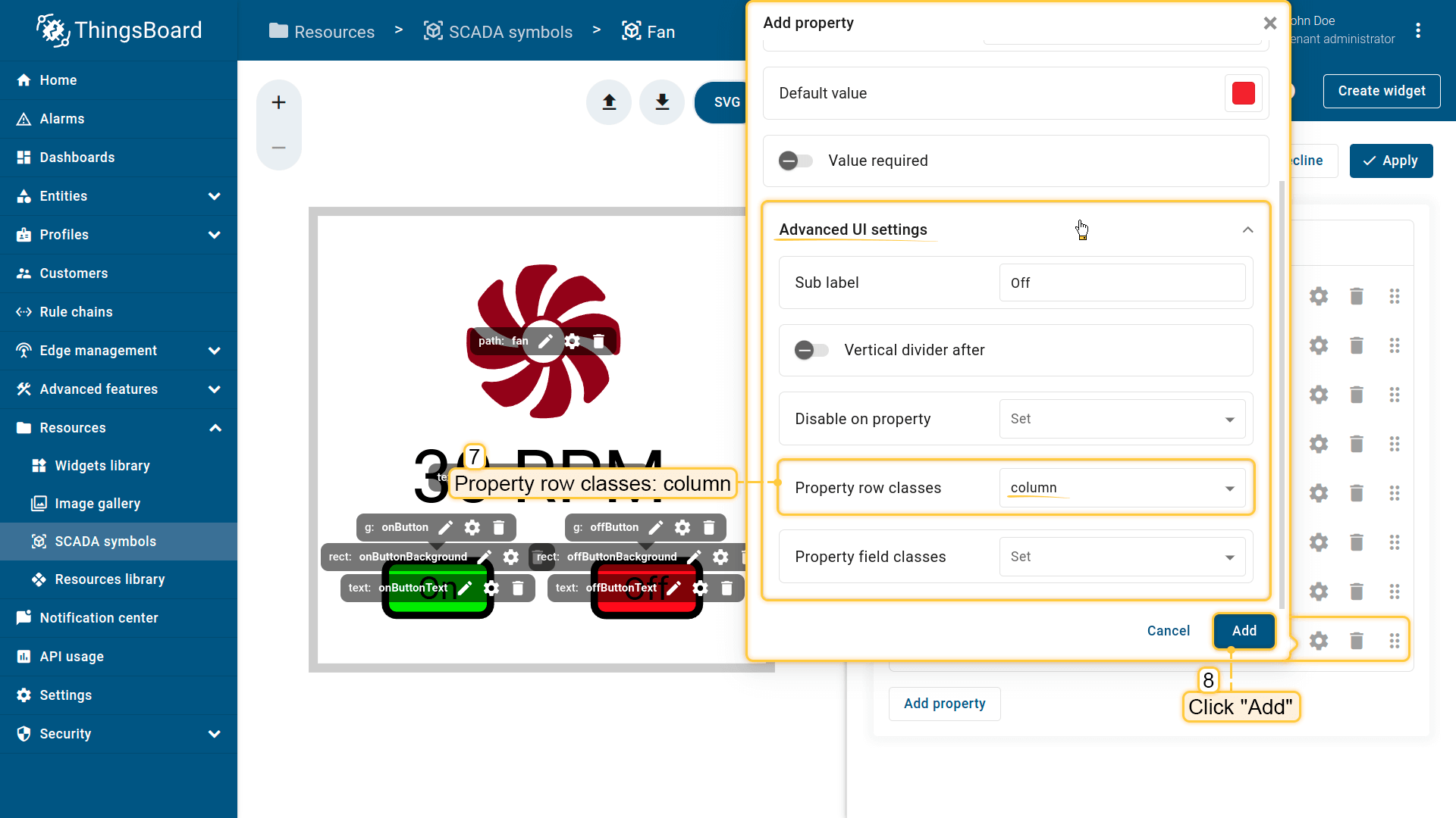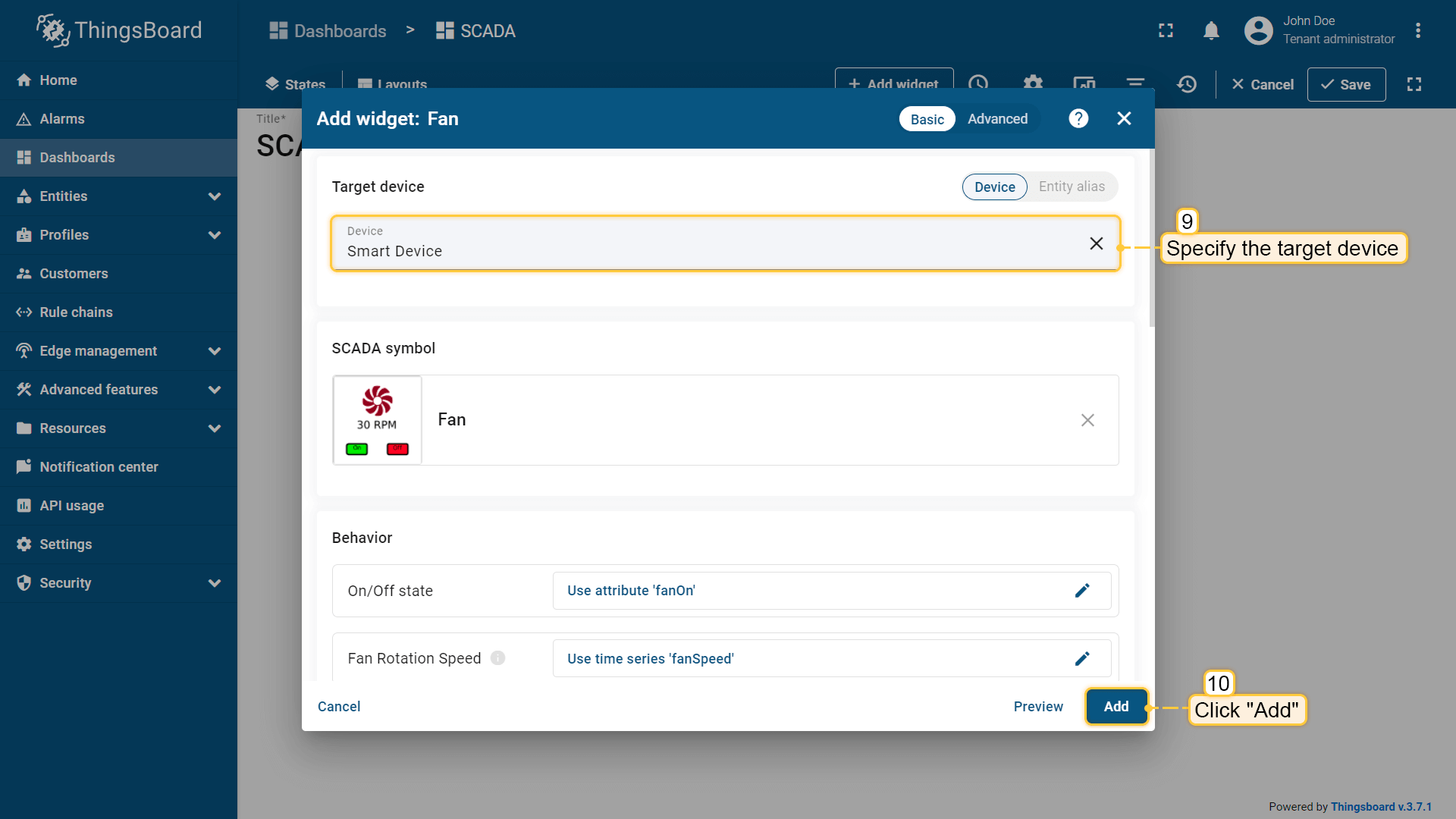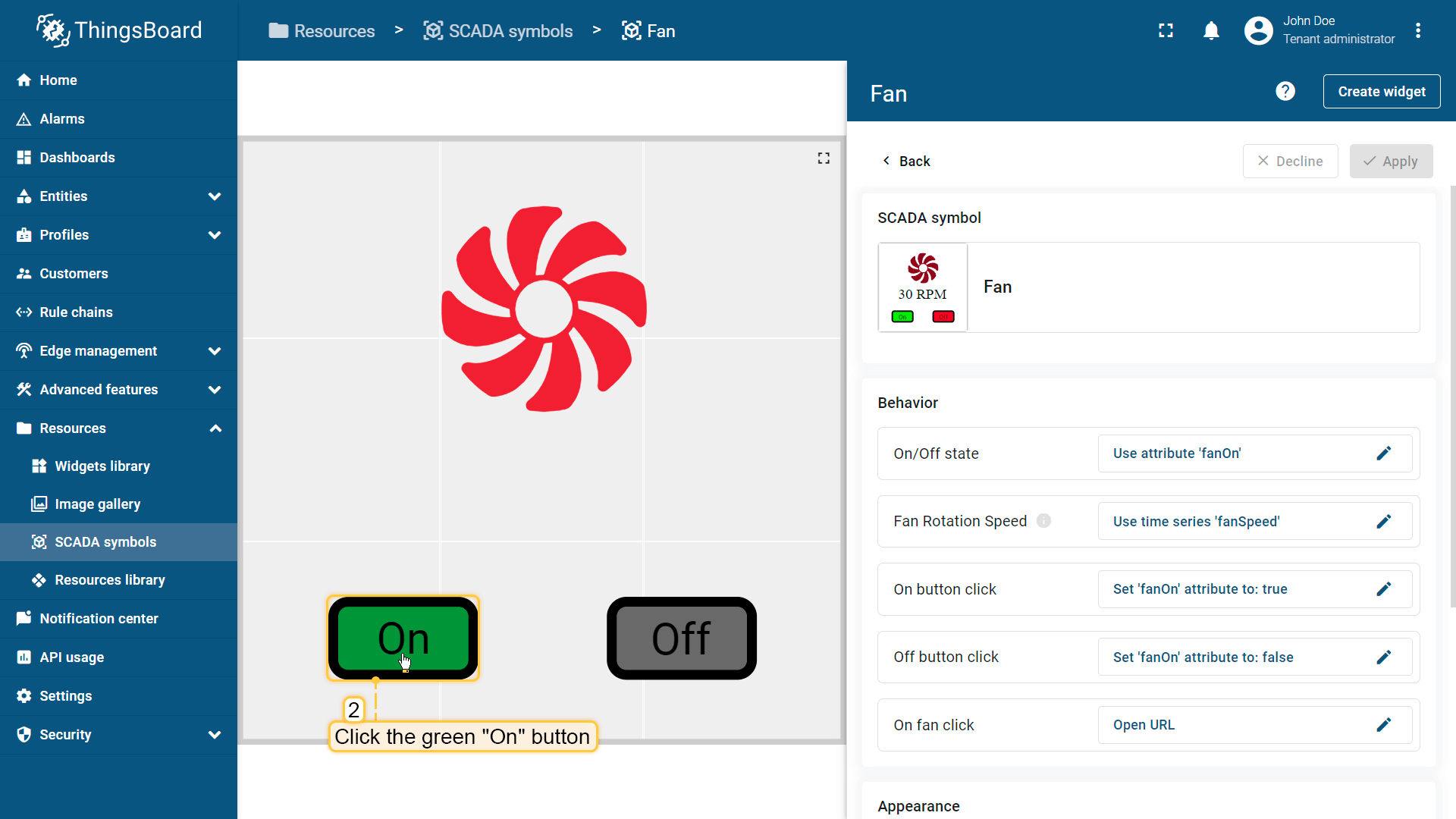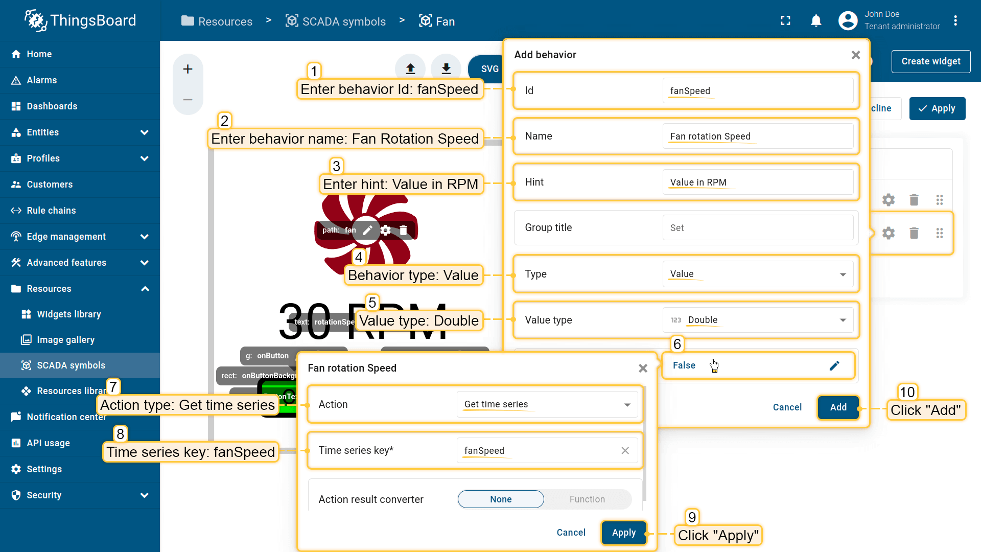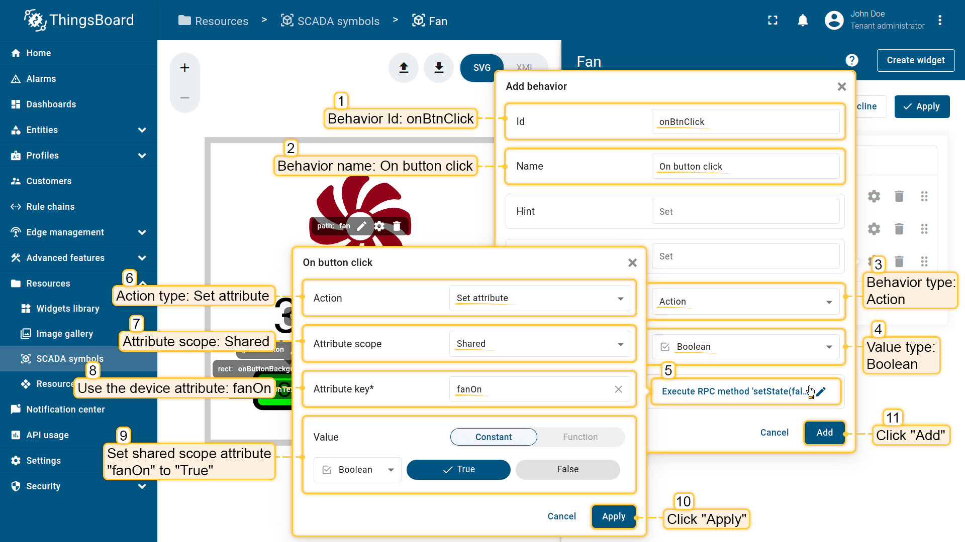 Behavior:描述SCADA symbol如何从平台接收数据,以及其在device或dashboard上触发的操作;