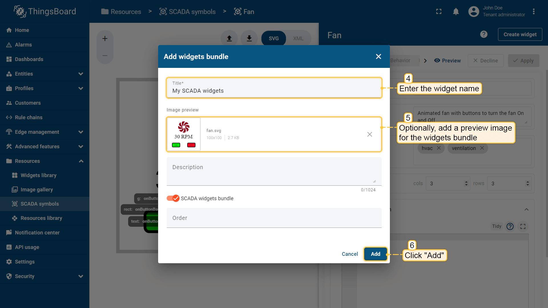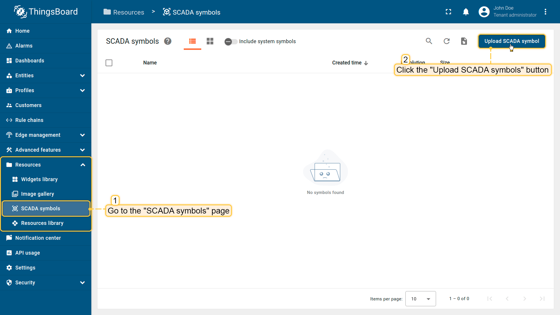 - 进入 “SCADA symbols” 的 “Resources” 页面,点击 “Upload SCADA symbol” 按钮;