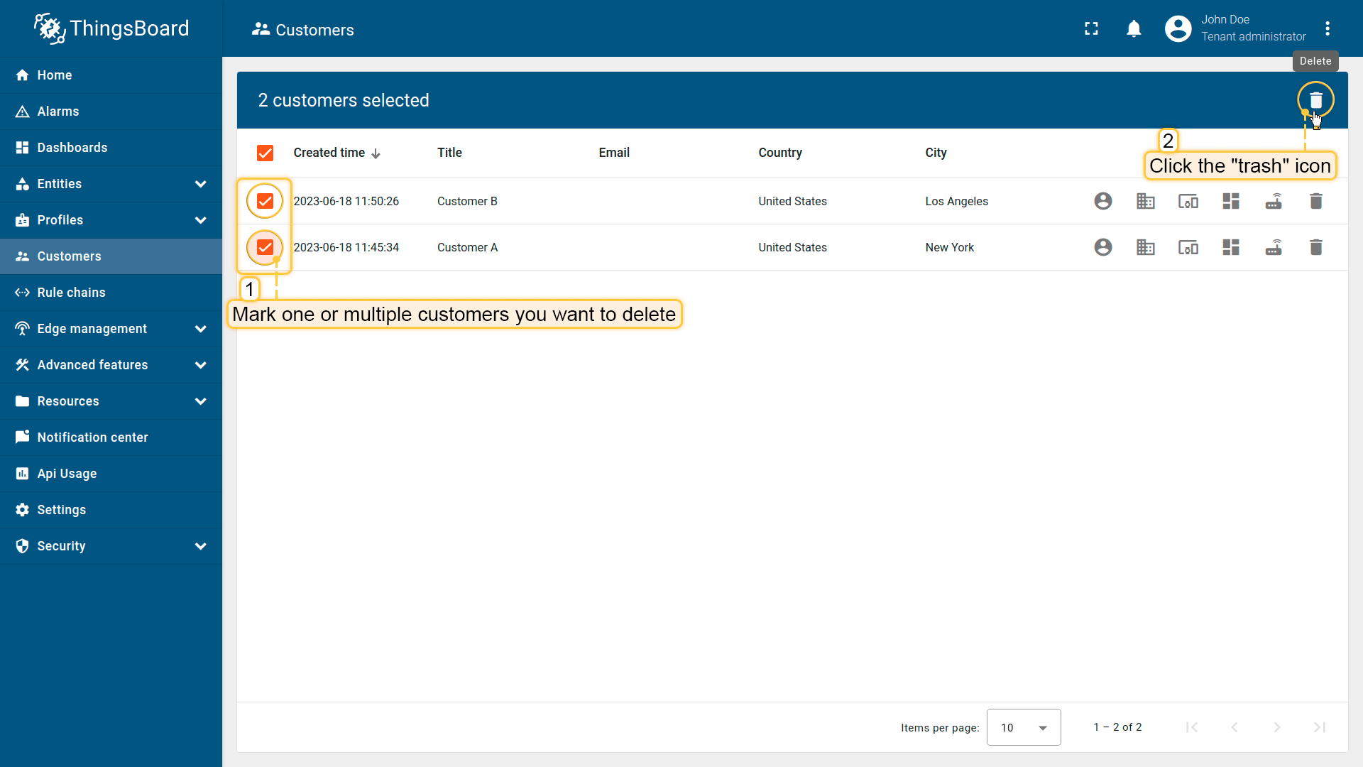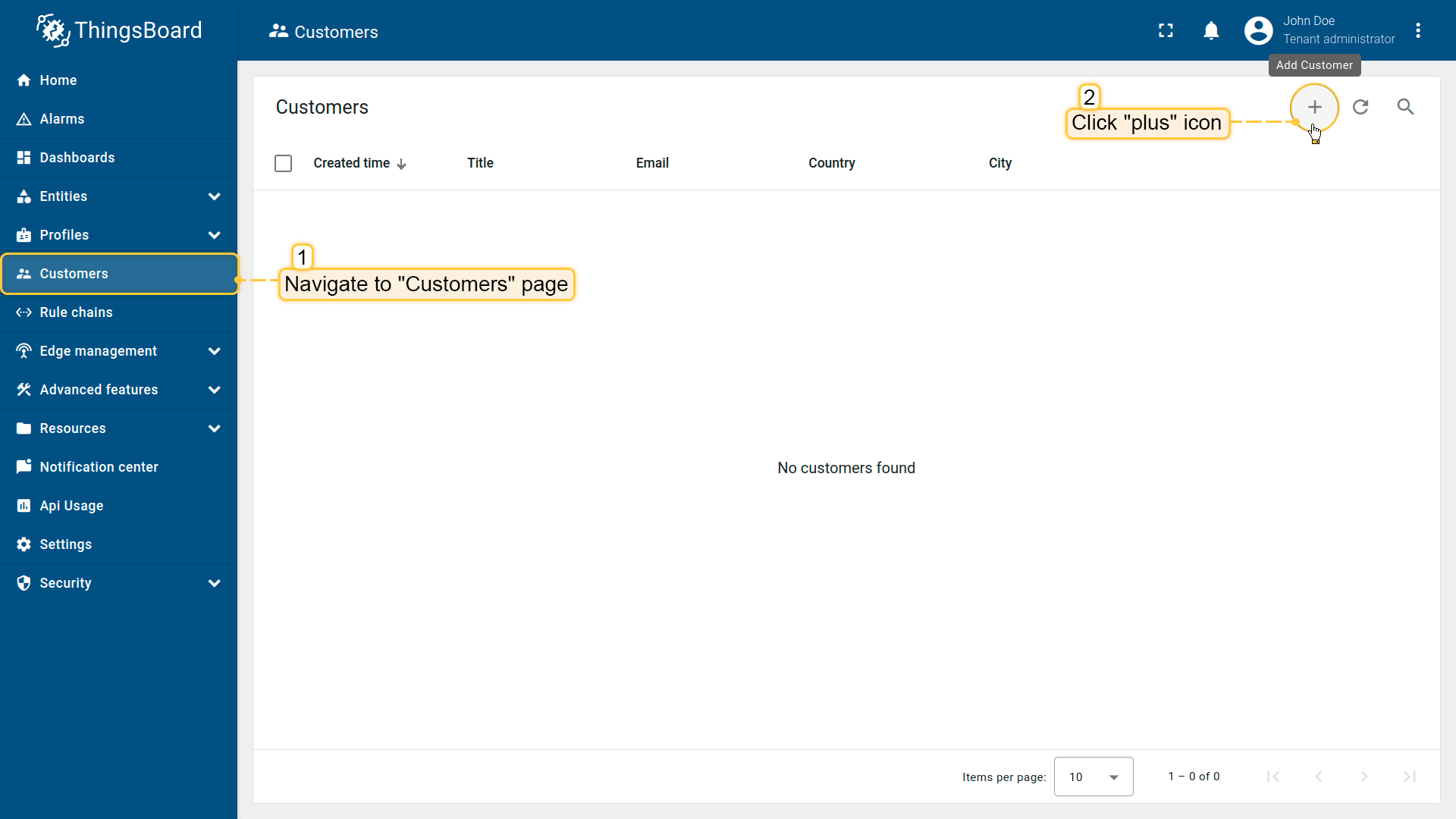 ThingsBoard中的客户代表独立的业务实体——个人或组织——购买或使用租户的设备及/或资产。客户也可表示租户组织内的部门或分支机构。
