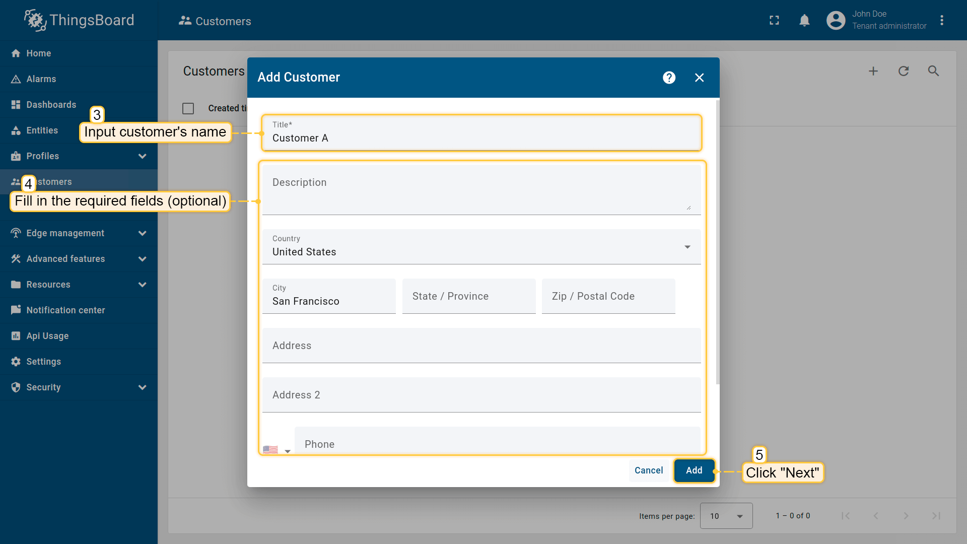 - 在打开的对话框中,填写客户名称。您也可以按需填写国家、城市、地址和电话号码。然后点击"添加"。