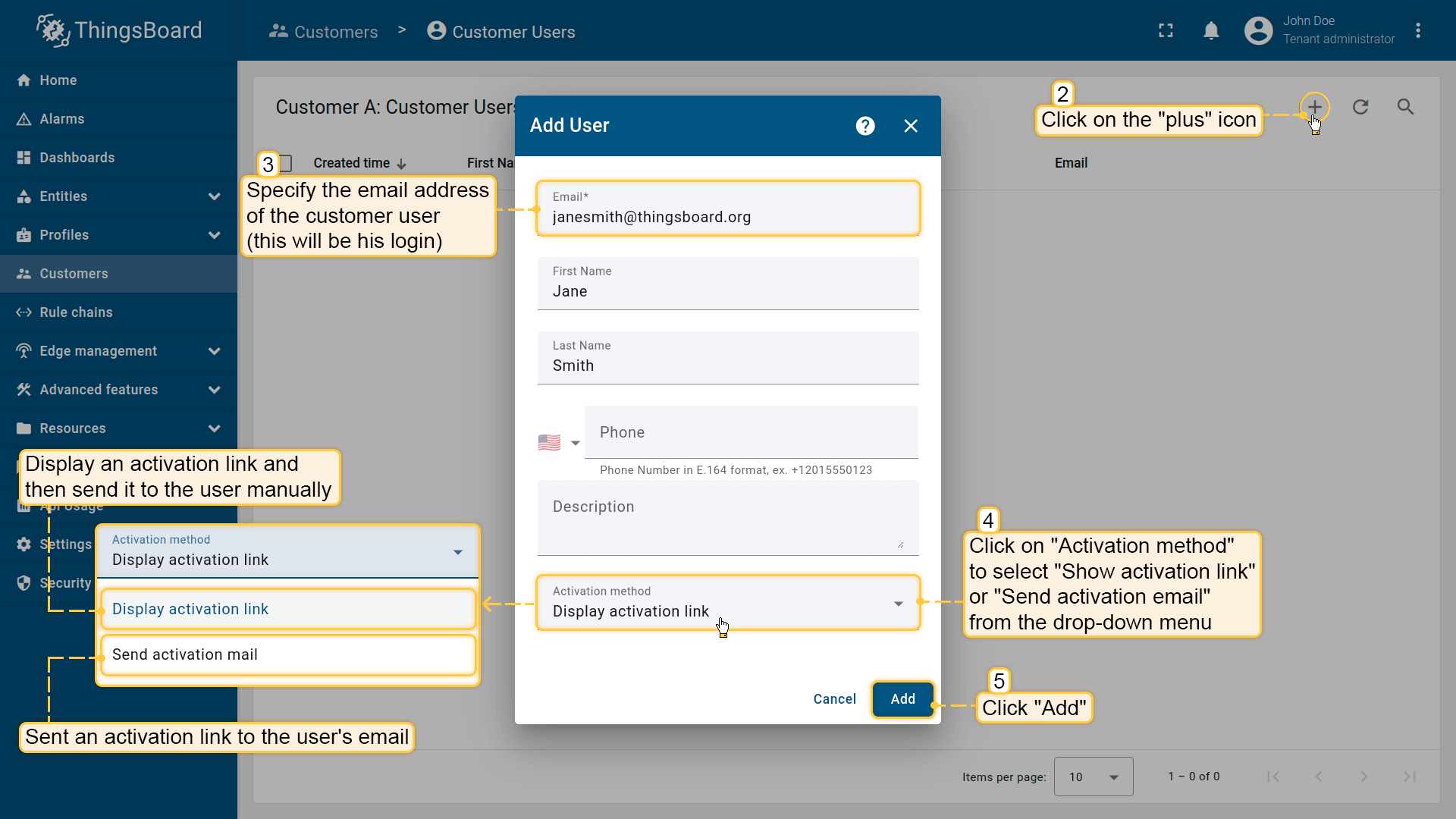- 点击屏幕右上角的加号。在打开的对话框中,输入用户邮箱、名字和姓氏。然后选择激活方式:显示激活链接,或通过邮件发送激活链接。最后点击"添加"。